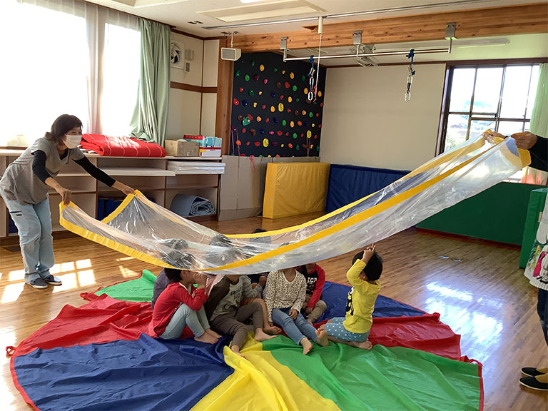 ・子どもさんと保護者が一緒に通所し、活動や遊びを行う中で、専門職員がかかわり、子どもさんの行動の理由やかかわり方を丁寧にお知らせします。職員と話すことで、疑問や悩み事の解決方法を探ります。(利用に関しては、受給者証が必要です)