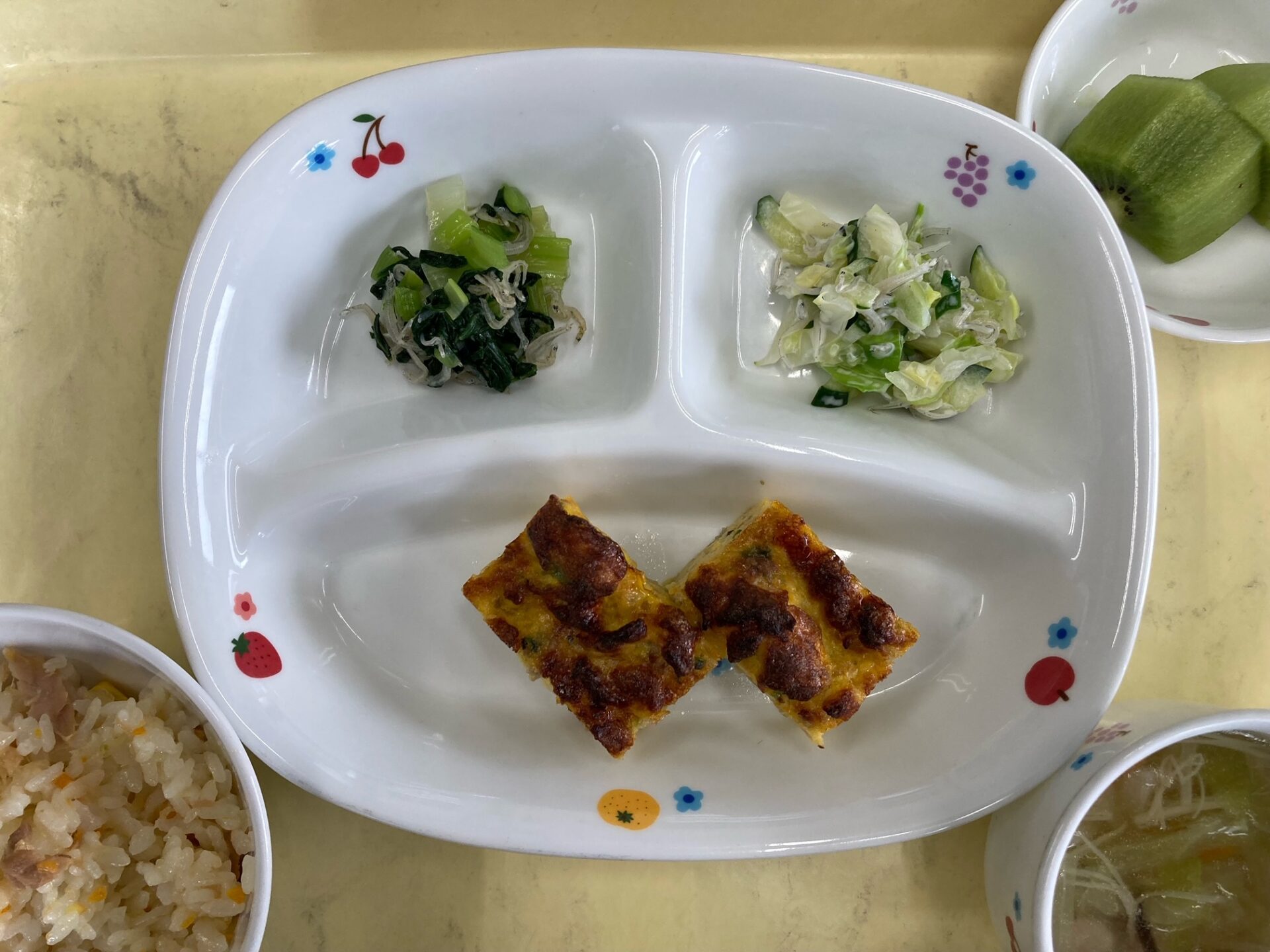 今日のランチはお楽しみ会ツナご飯、千草焼きです。