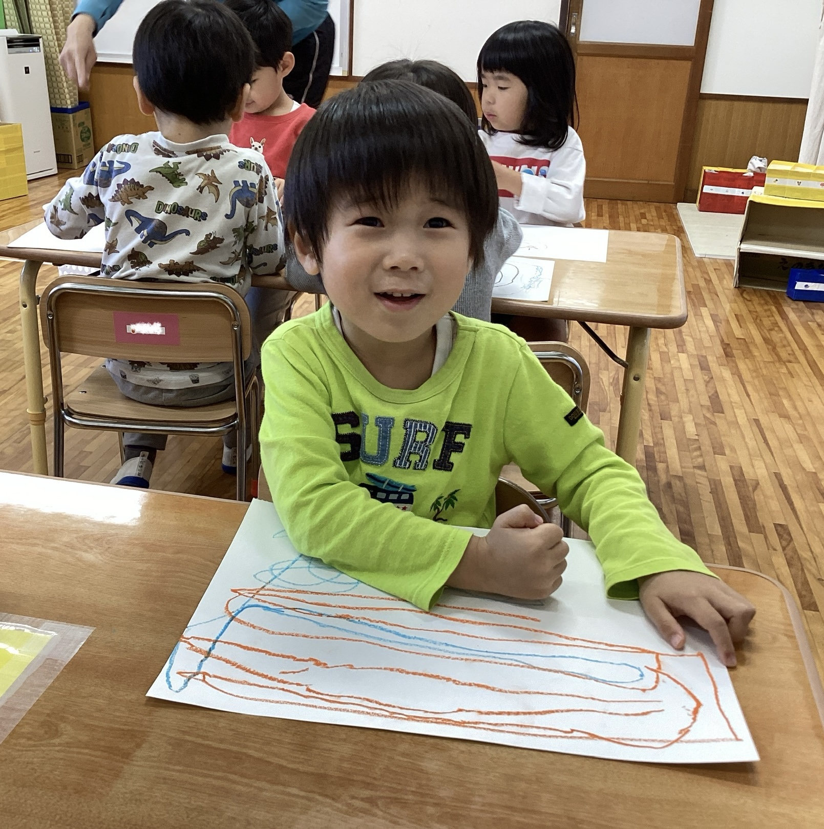 白い画用紙にクレヨンで絵を書いて、絵の具ではじき絵をしました。