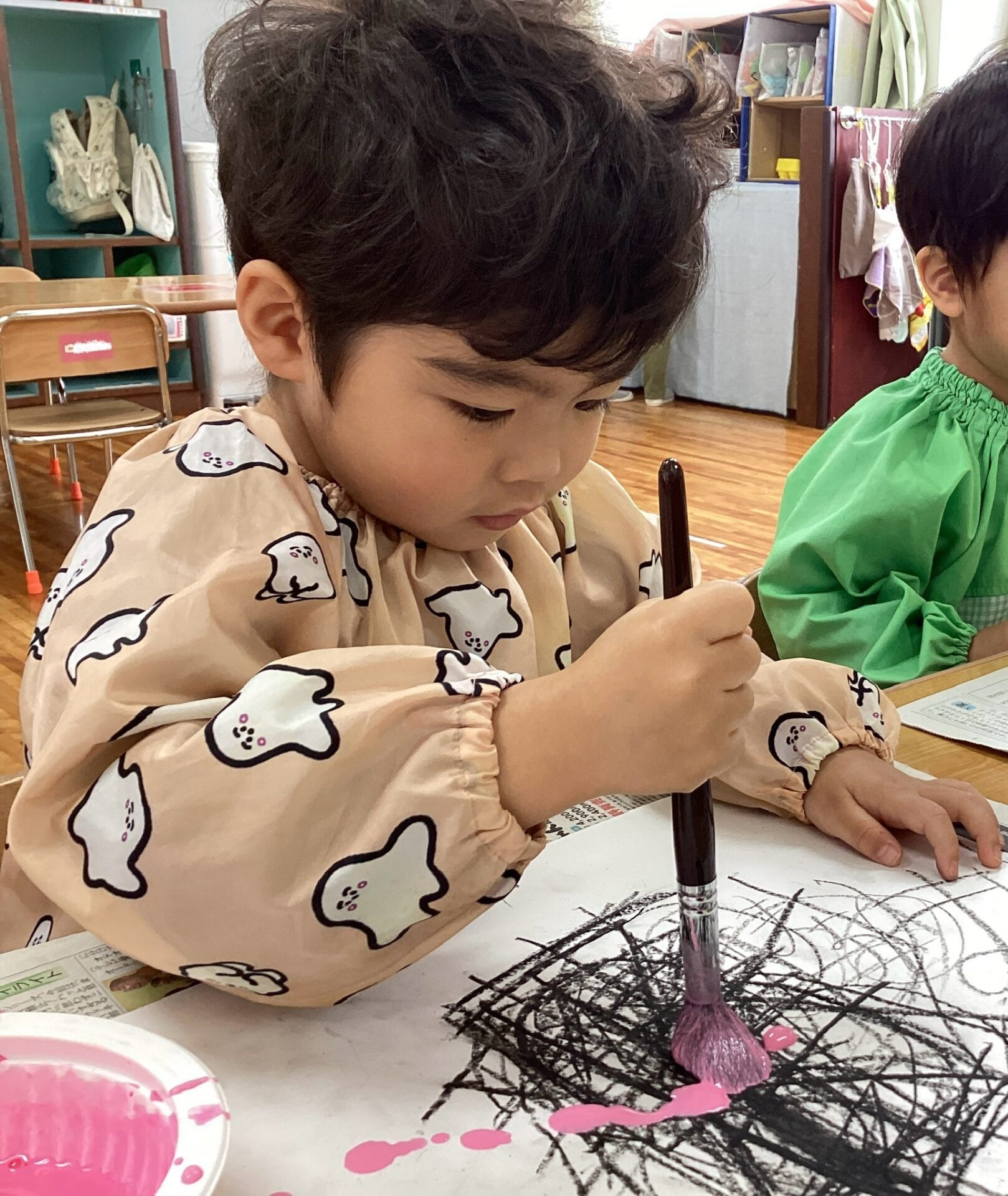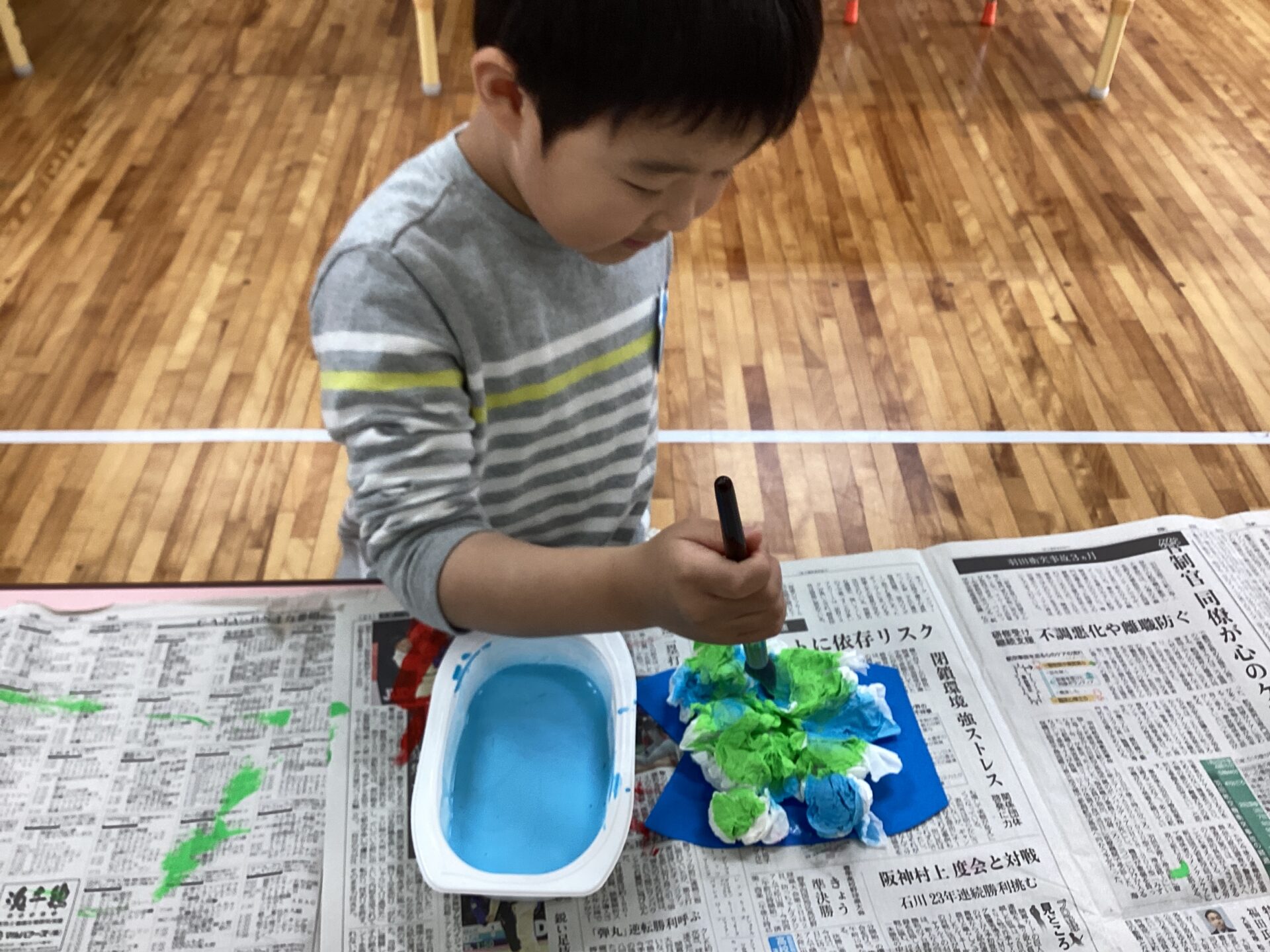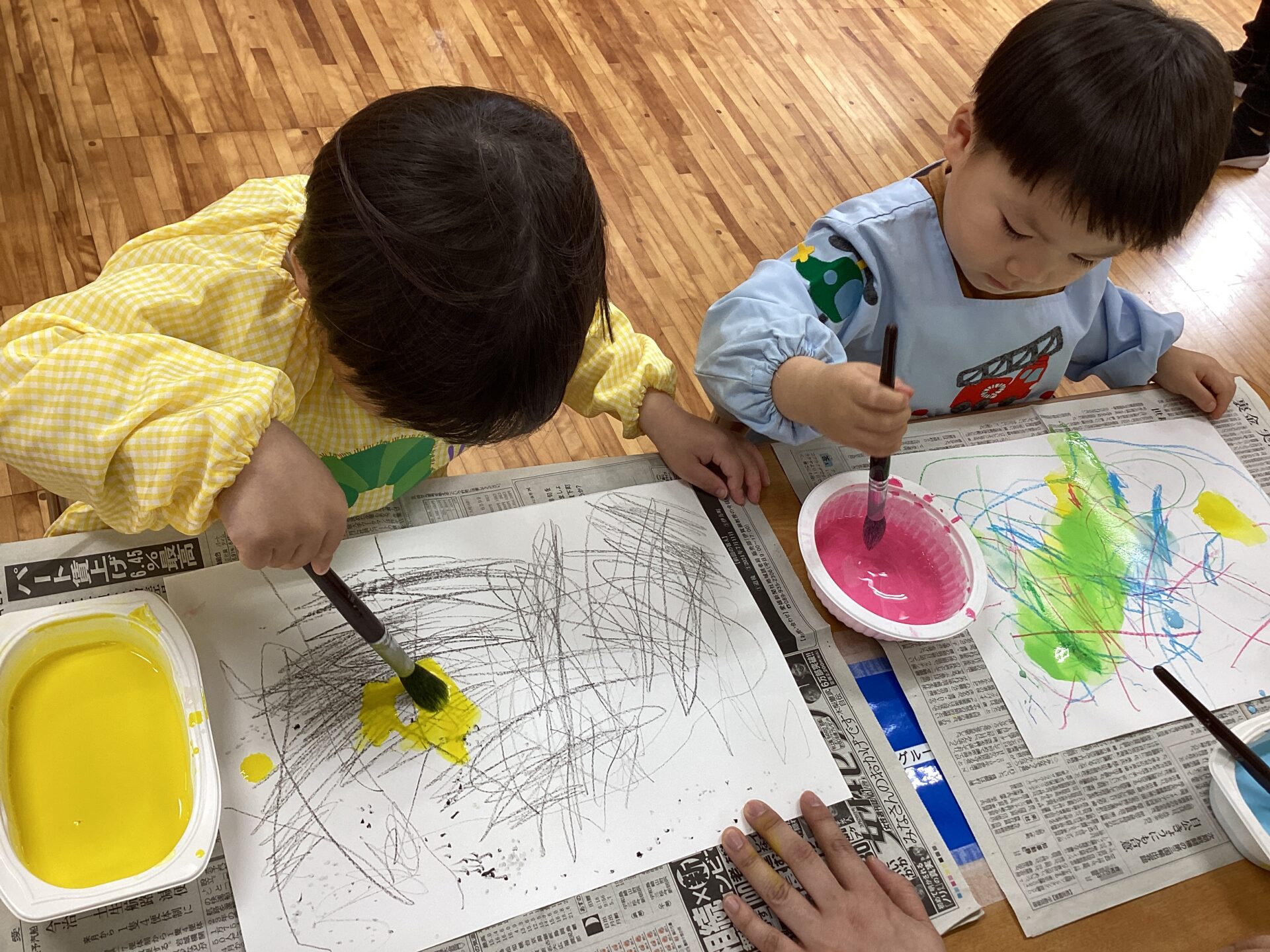 「わぁ、きれい」「したーい」と嬉しそうに絵の具を染み込ませています。