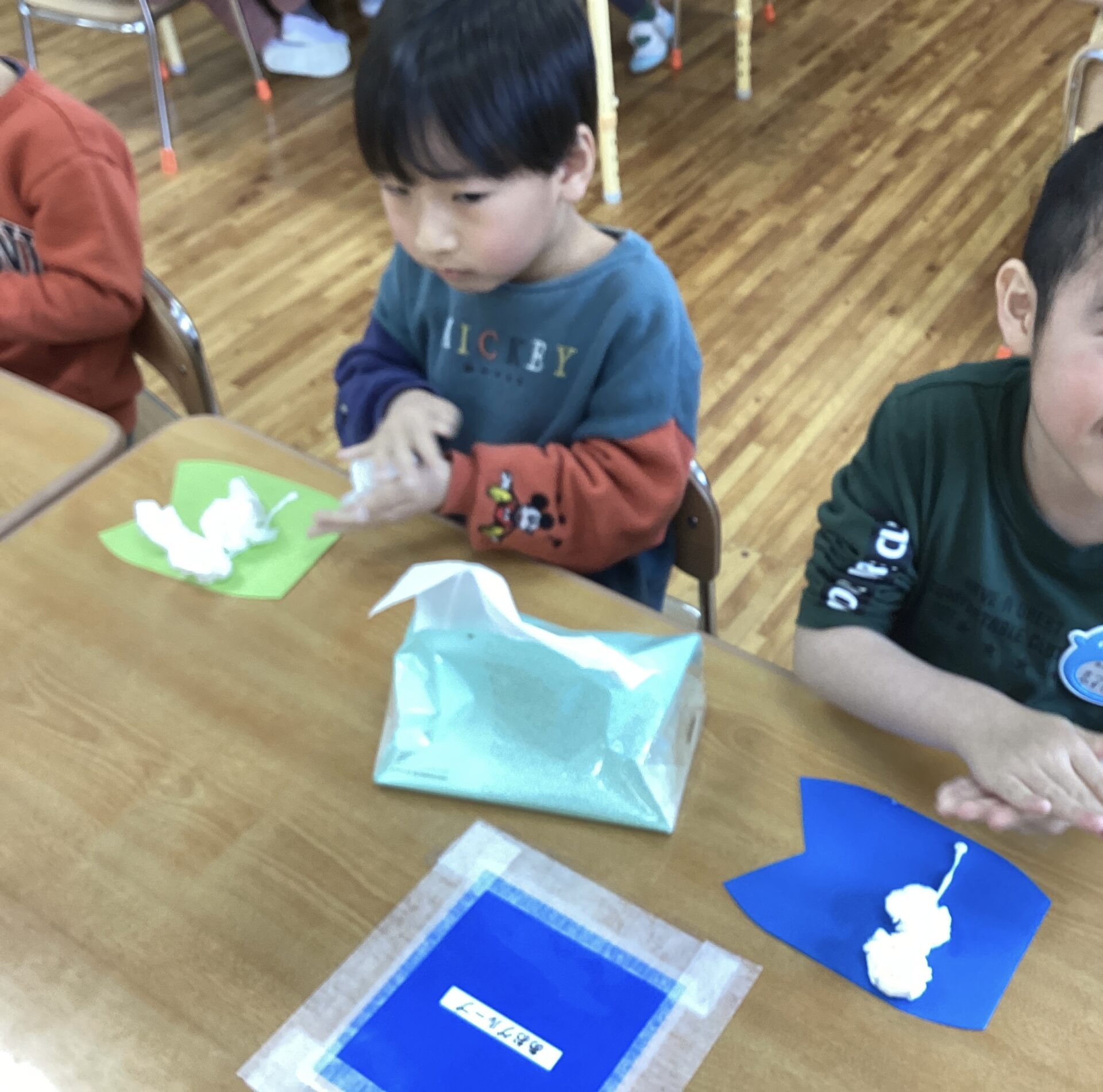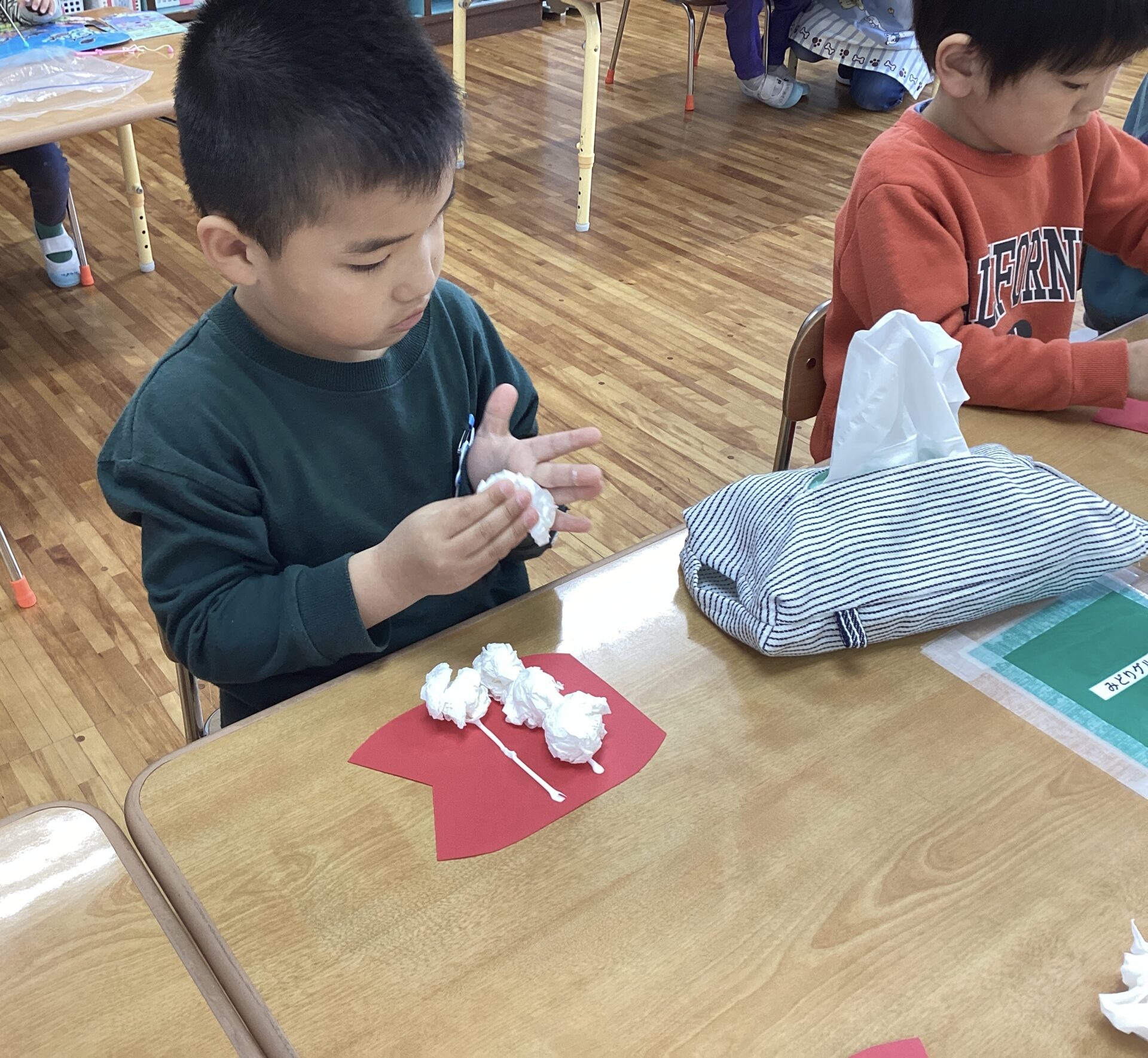 U君やH君は、「みてーだんごみたい」「こっちは、やきとりー」と言いながら楽しんでいました🍡