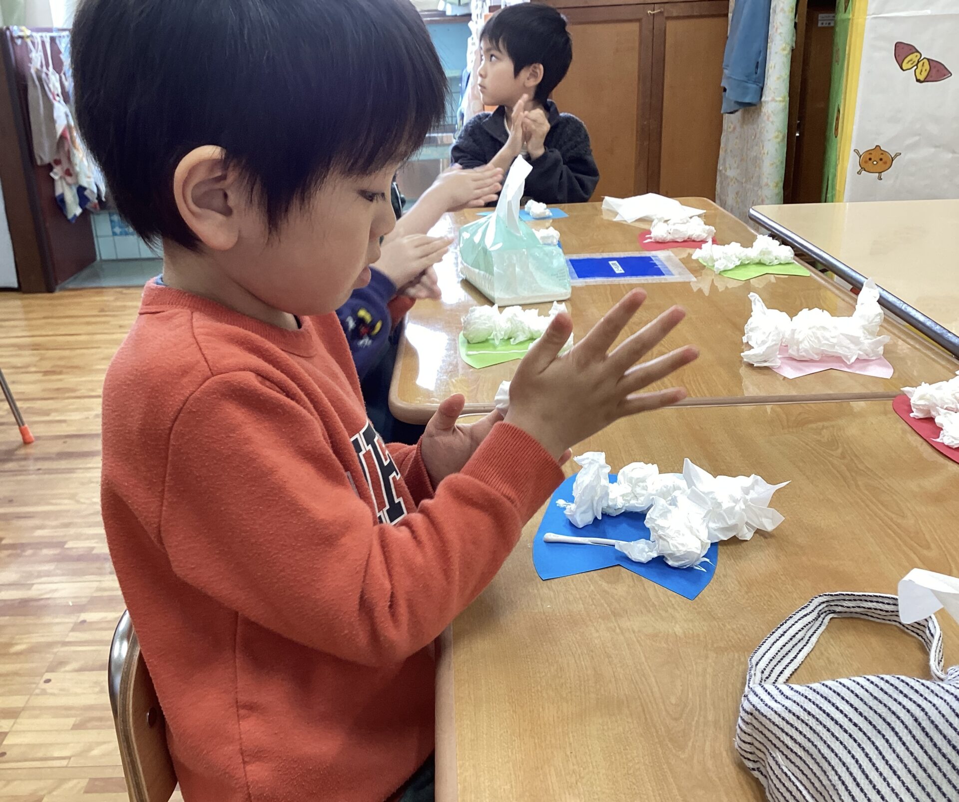ティッシュを丸め、こいのぼりのうろこに見立ててボンドの上に乗せていきます。