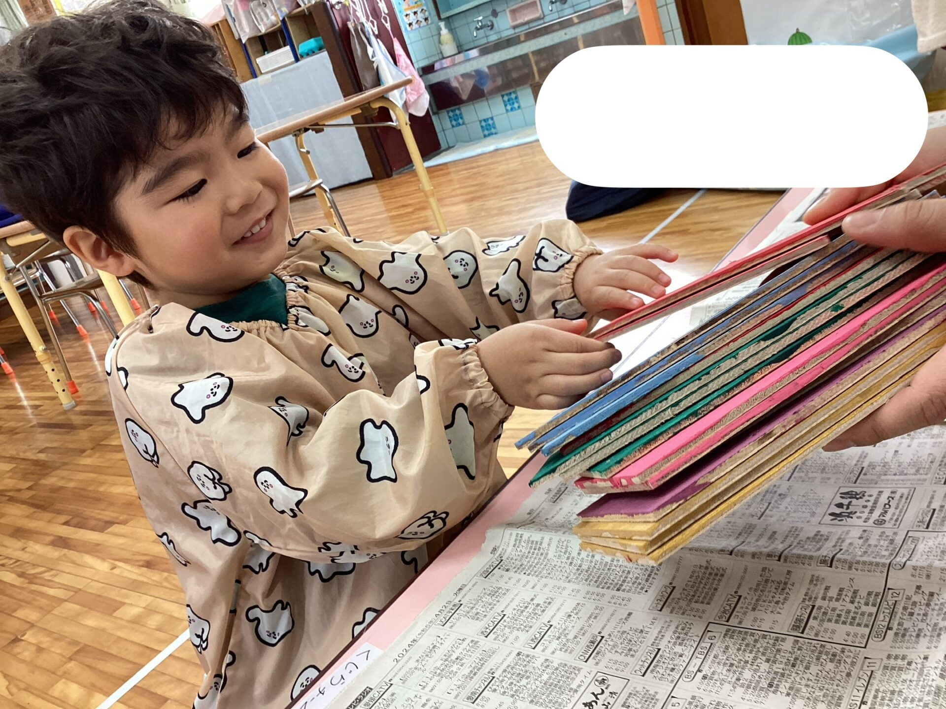 先日、「今年もこいのぼりをお願いしたい」とたくさんのこいのぼりを持ってきていただいたので、子どもたちと制作しています。