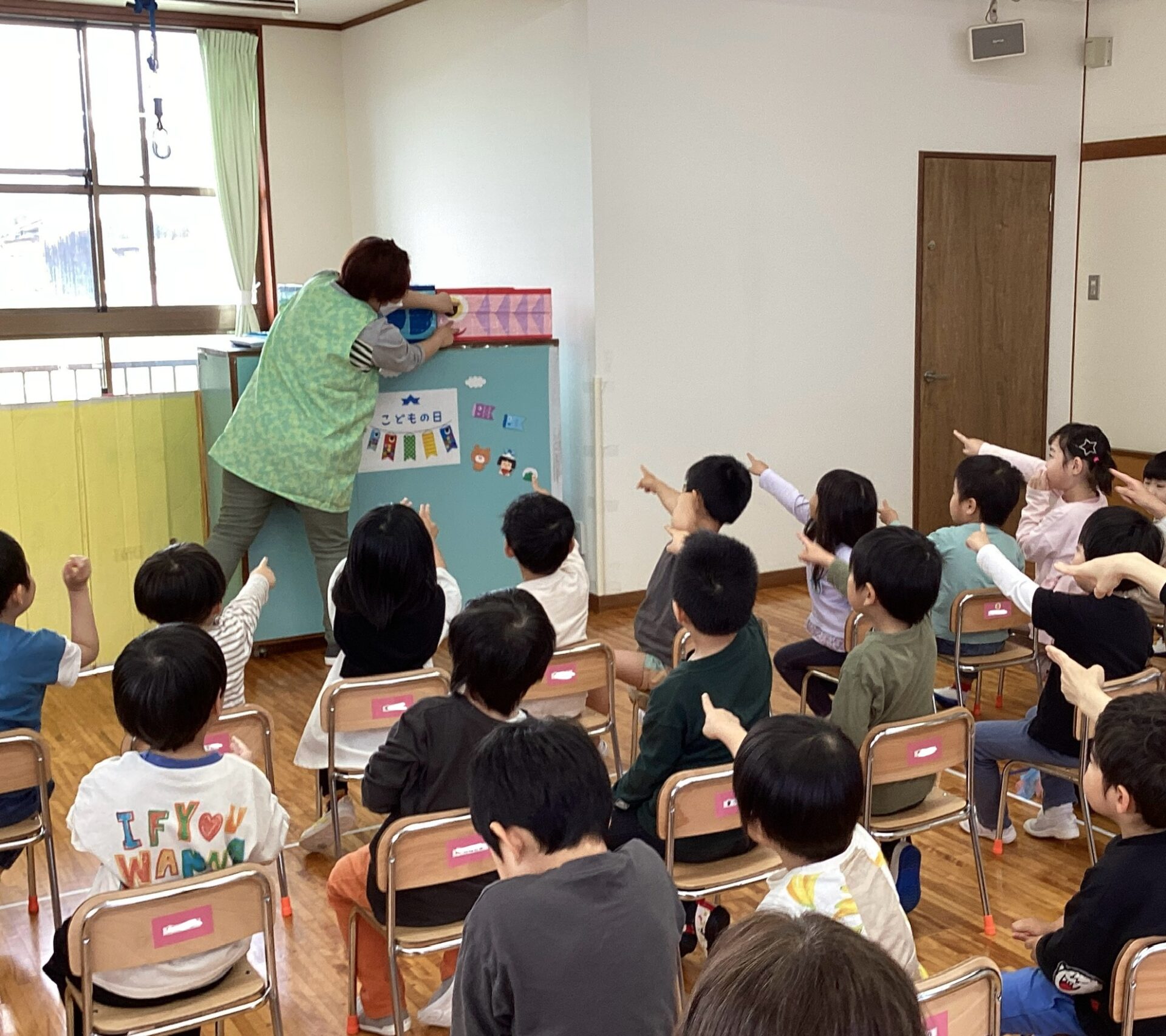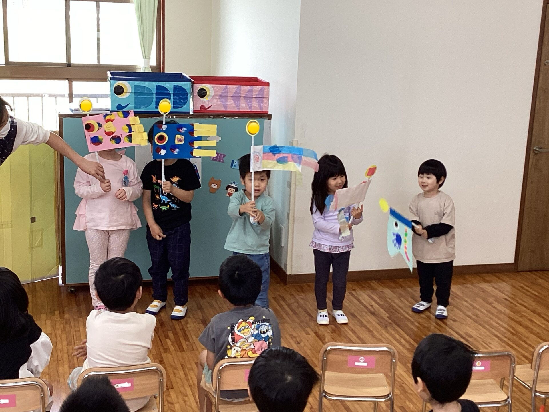 また、子どもたちが好きな“ひとりふたり”のこいのぼりバージョンを楽しみました。次々、出てくるこいのぼりに目を輝かせている子どもたちでした♪