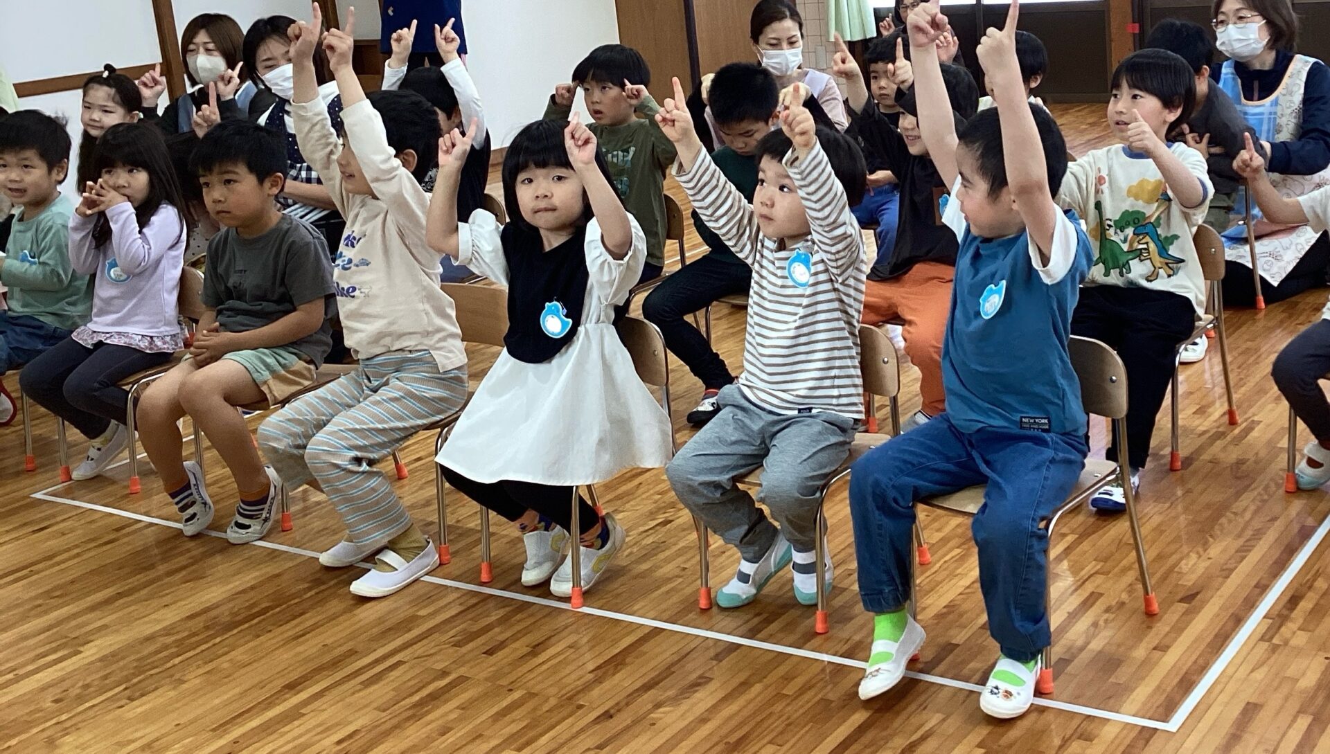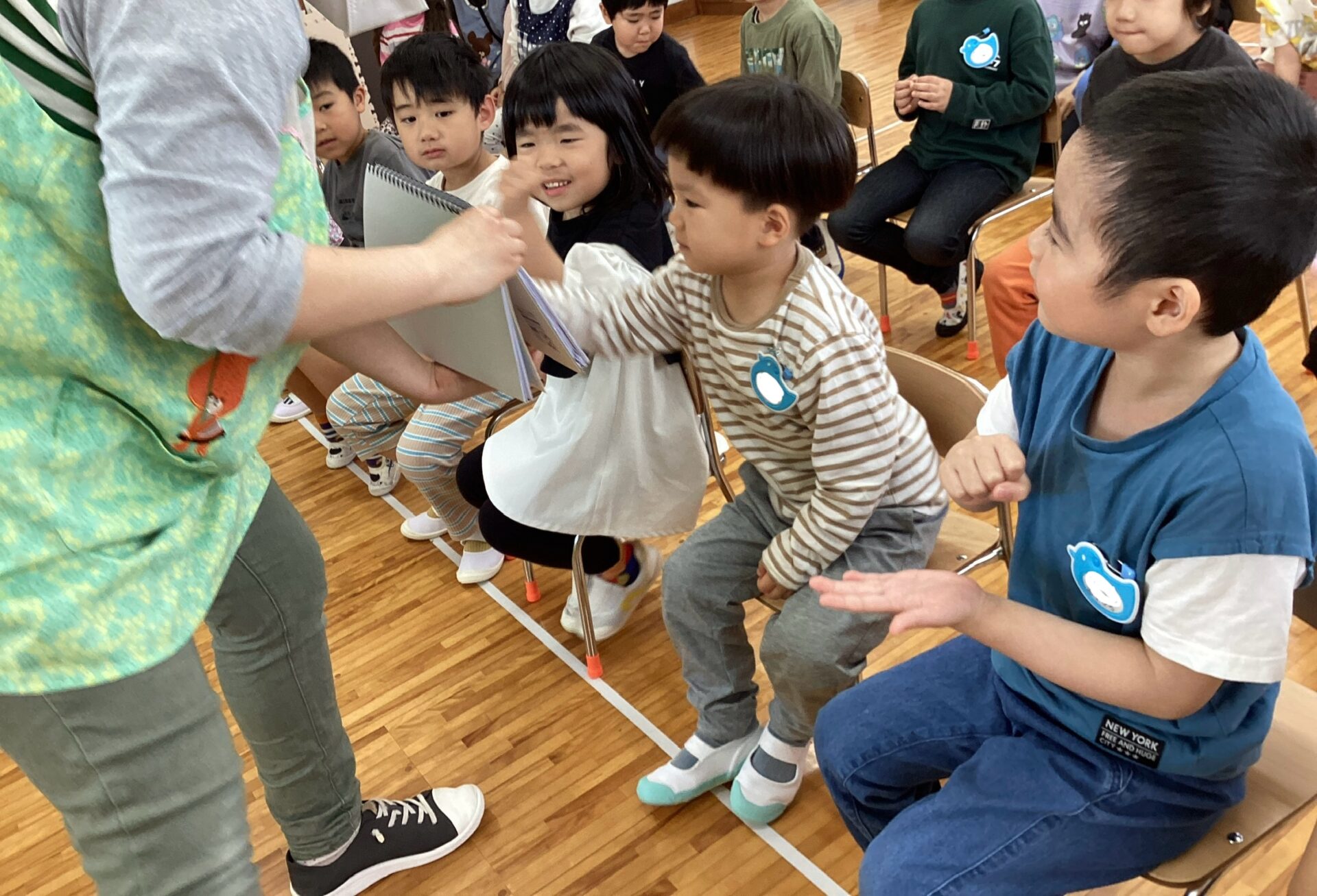 まずは、注目をひきつけるためはくしゅの手遊びをします♪