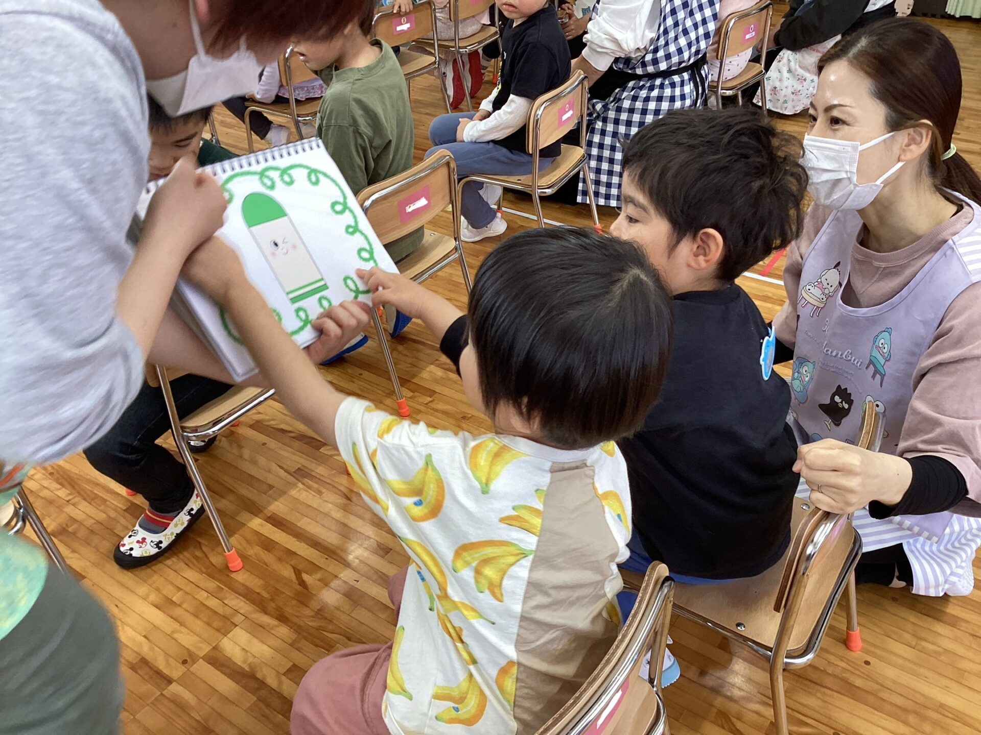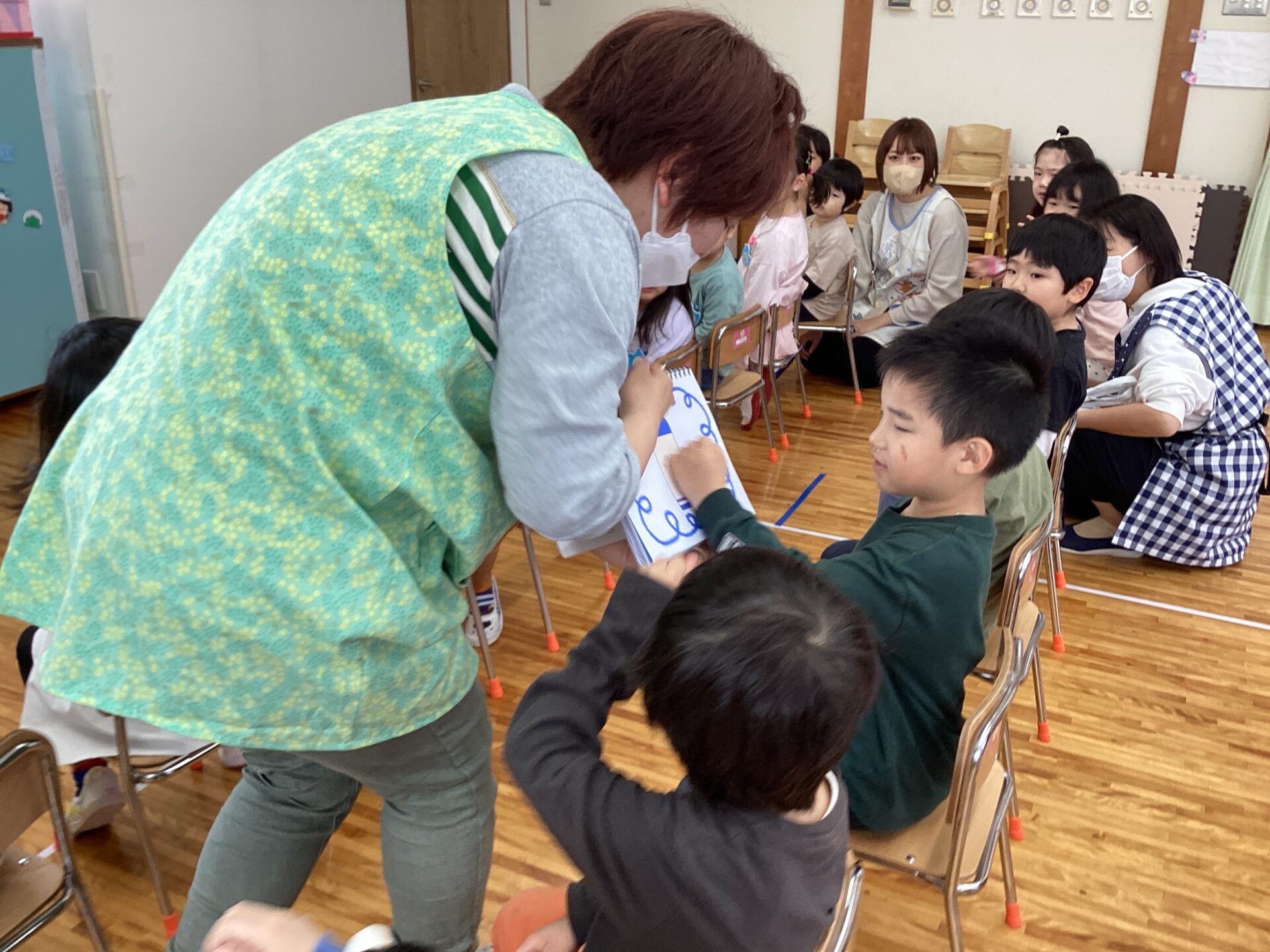 さみしがりやのこいたろうくんに友だちを作ってあげようということで、ぐるぐると絵を描く動作を真似て参加しながら楽しみました🖍️