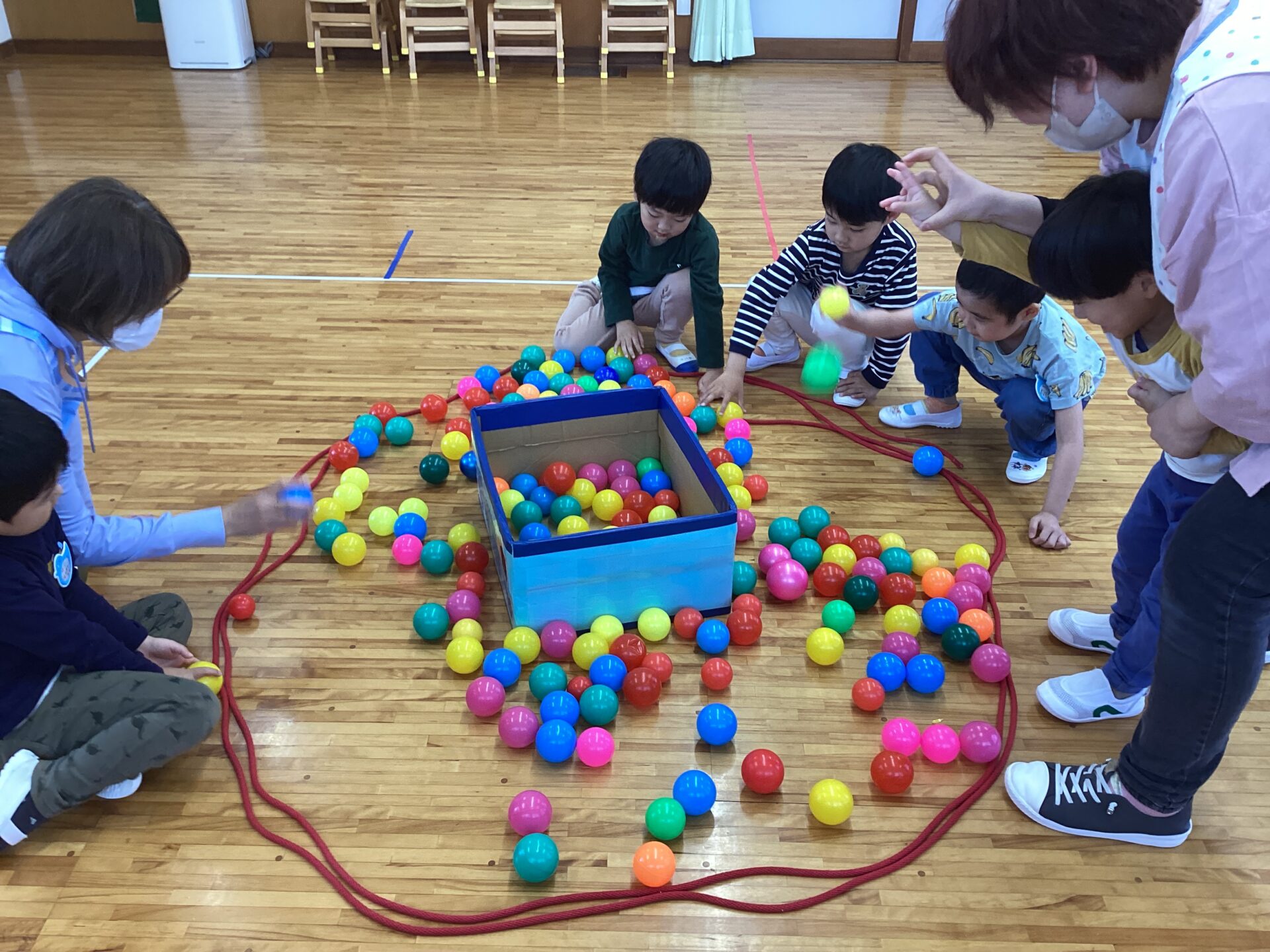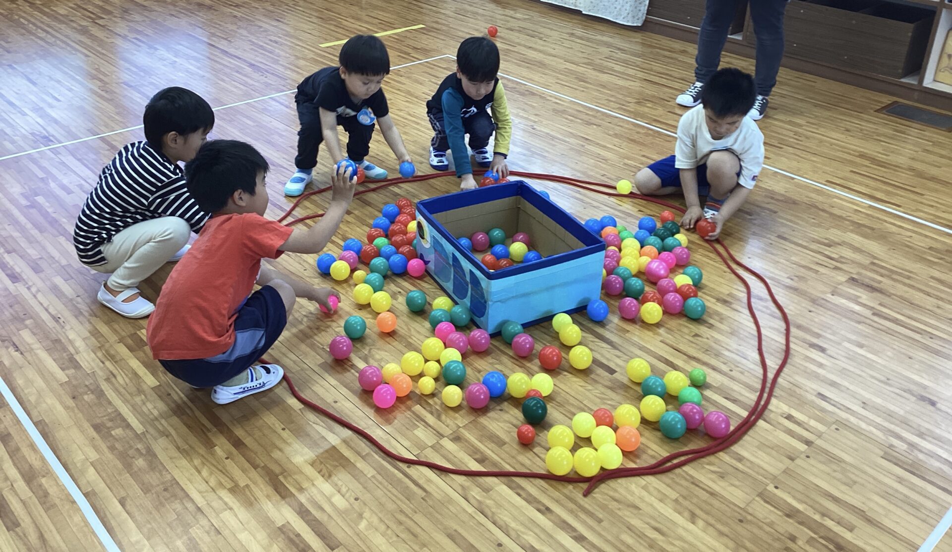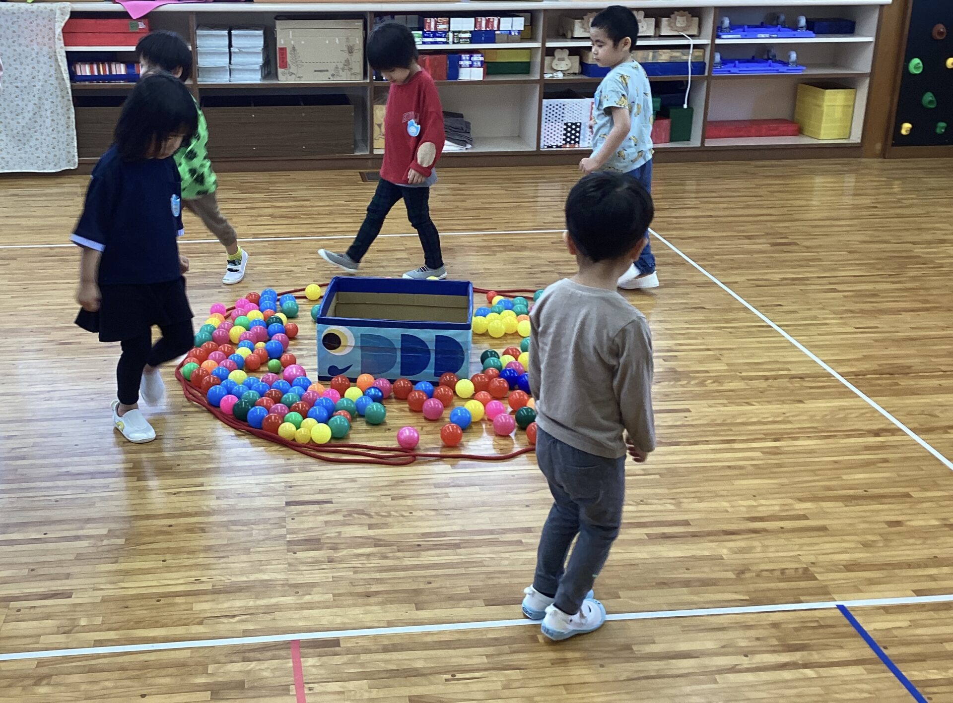 子どもたちは楽しんでいましたが、中央の箱とボールの距離が近かったりしたこともあり、少し遊び方がわかりにくかったようです。次回は、遊び方や物などをかえて工夫して楽しみたいと思っています✌️