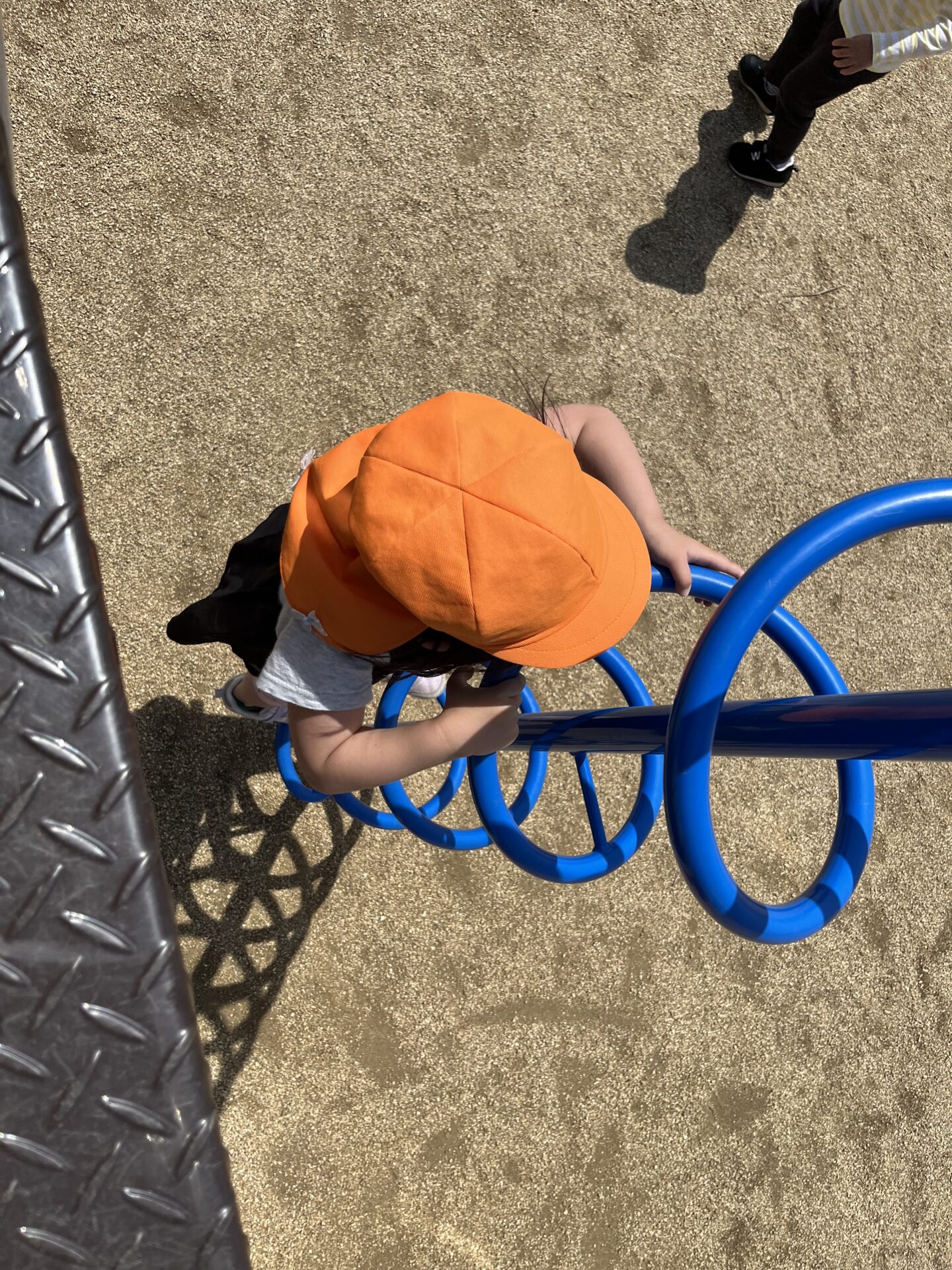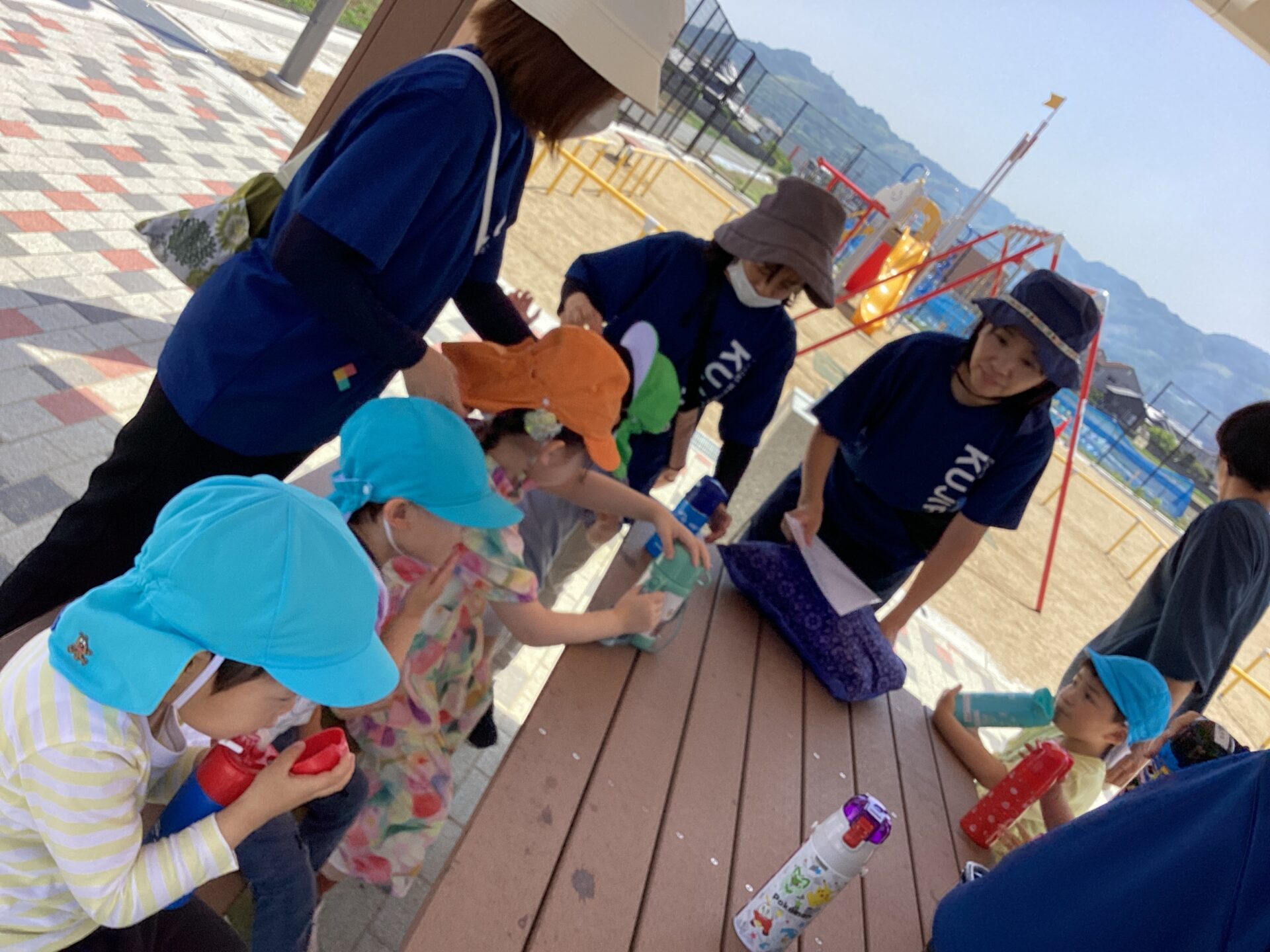公園に着いたらまずベンチで水分補給。