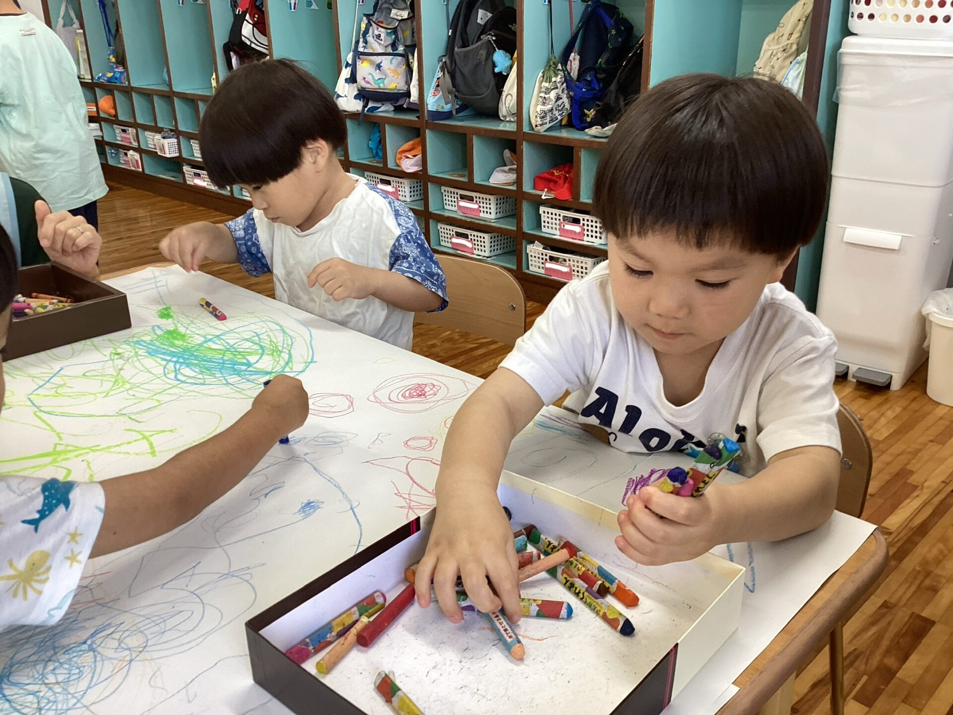 なぐりがきをしたり、大人が提案したもを描いたりして楽しんでいますよ。