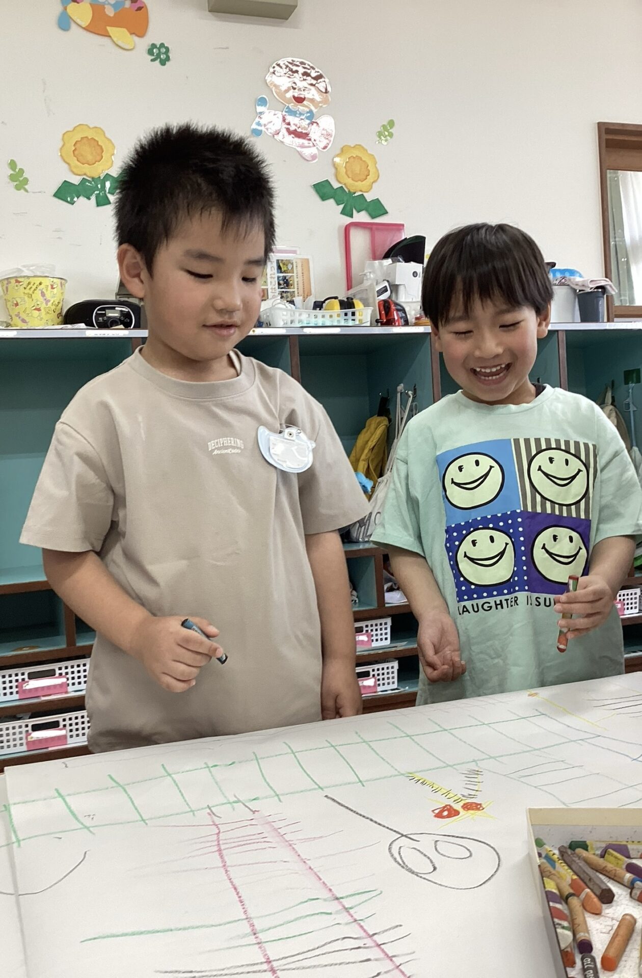 どちらのお絵描きも廊下に飾って、子どもたちとしばらく楽しみたいと思います!