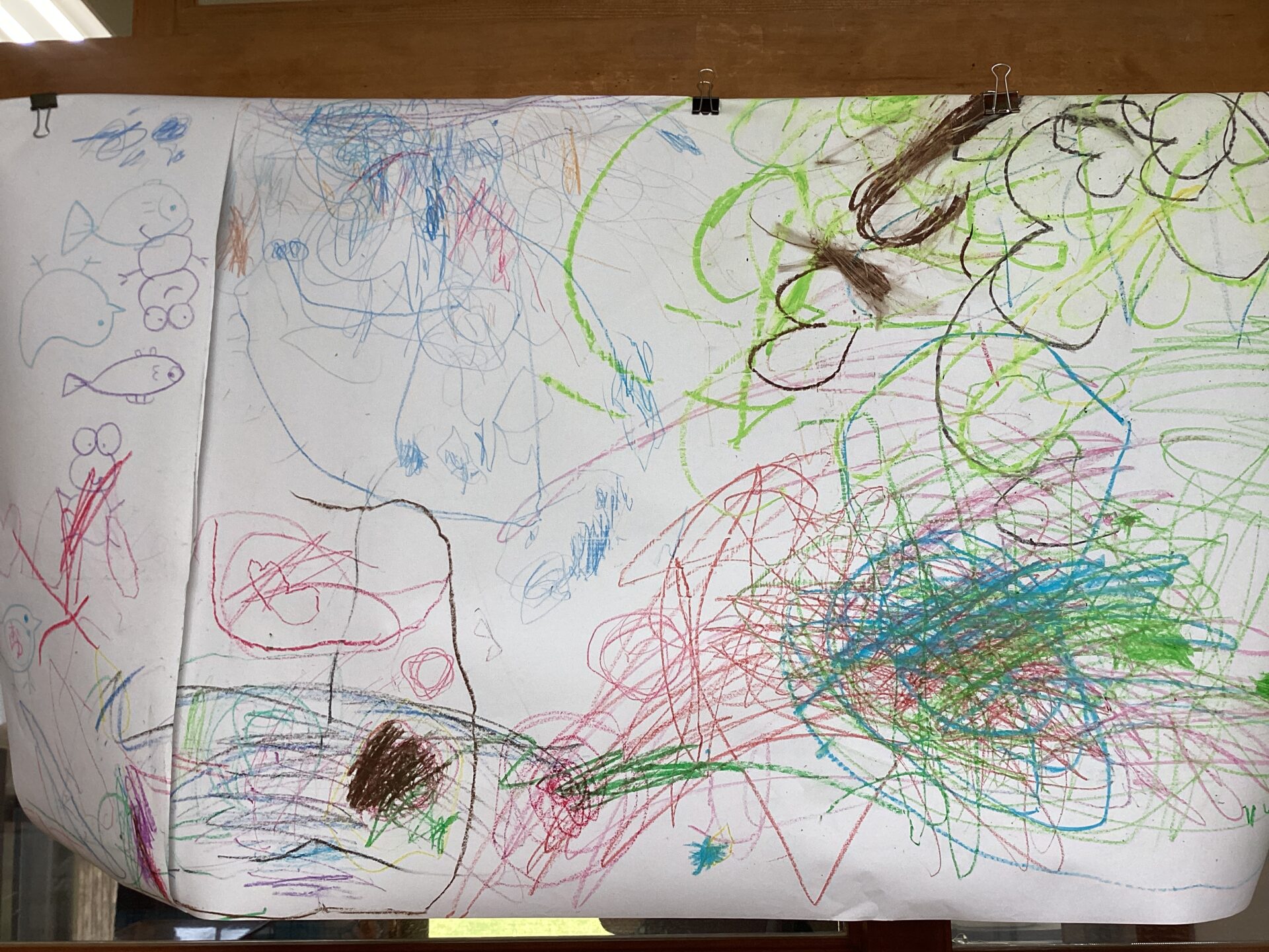 小さな手に複数本のクレヨンを持って、虹でも描くのかなー☺️?