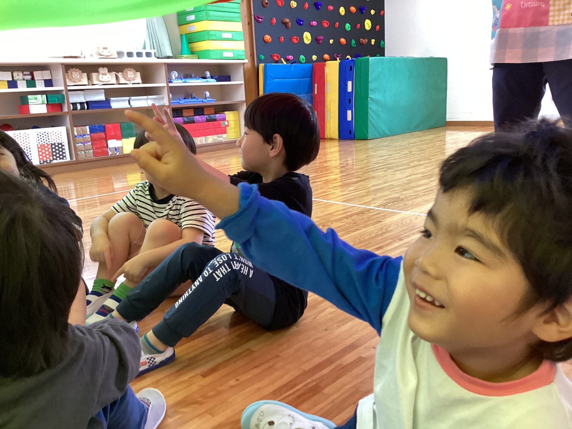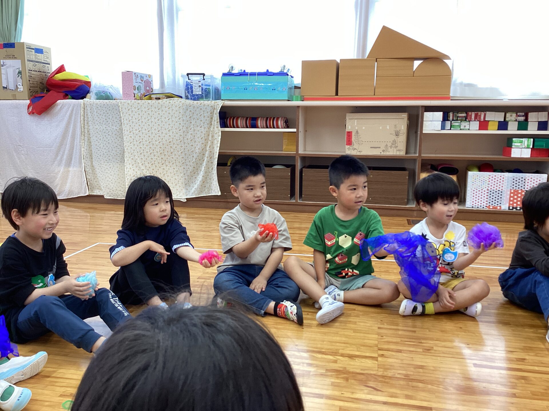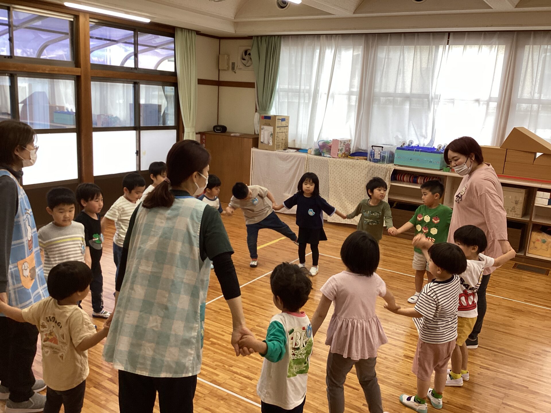 「みんなで手を繋いで丸を作ろうね」まだ大人の手助けが入りますが、子どもたち自身から手を差し出したり、「手をつなごう」と誘ったりする場面が見られていましたよ。