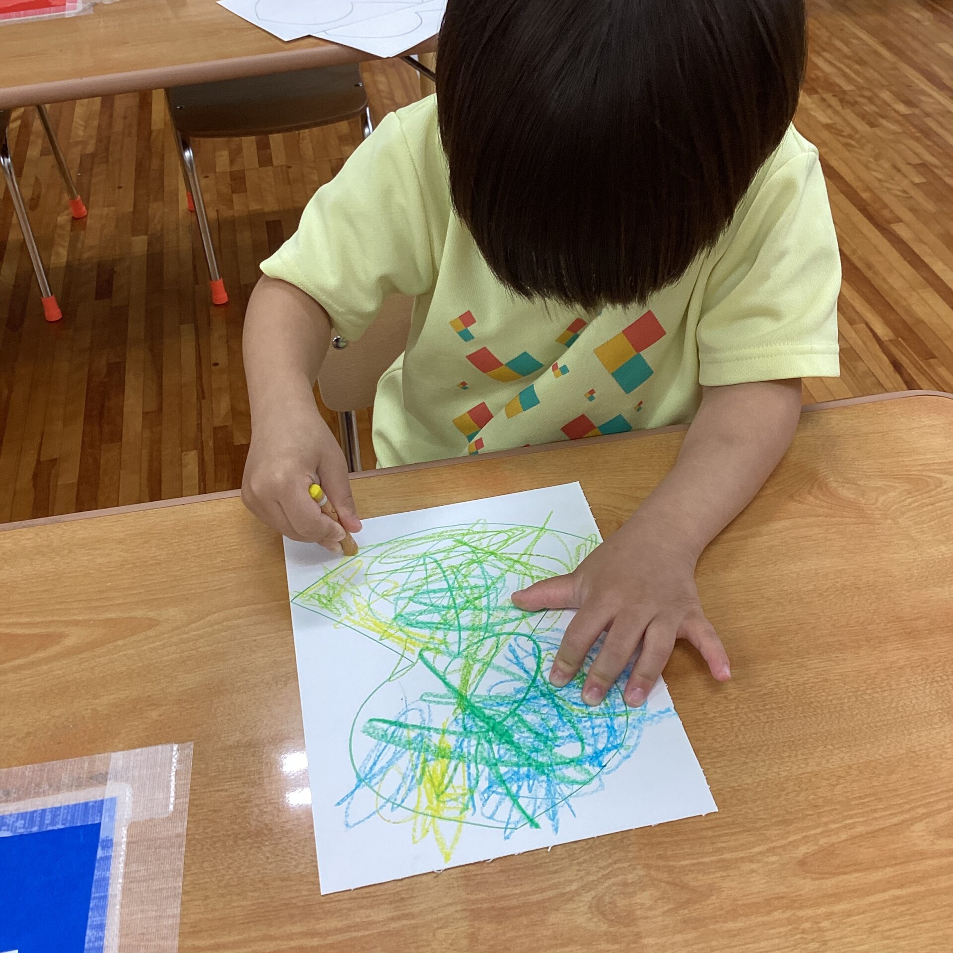 好きなクレヨンを手に取り、ぐるぐるお絵描き。