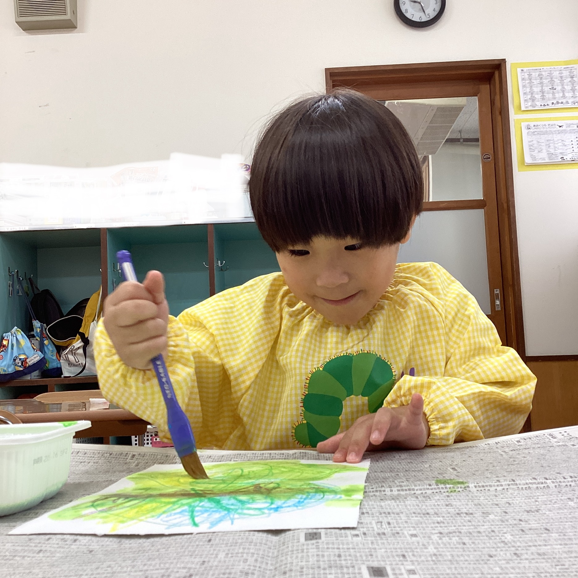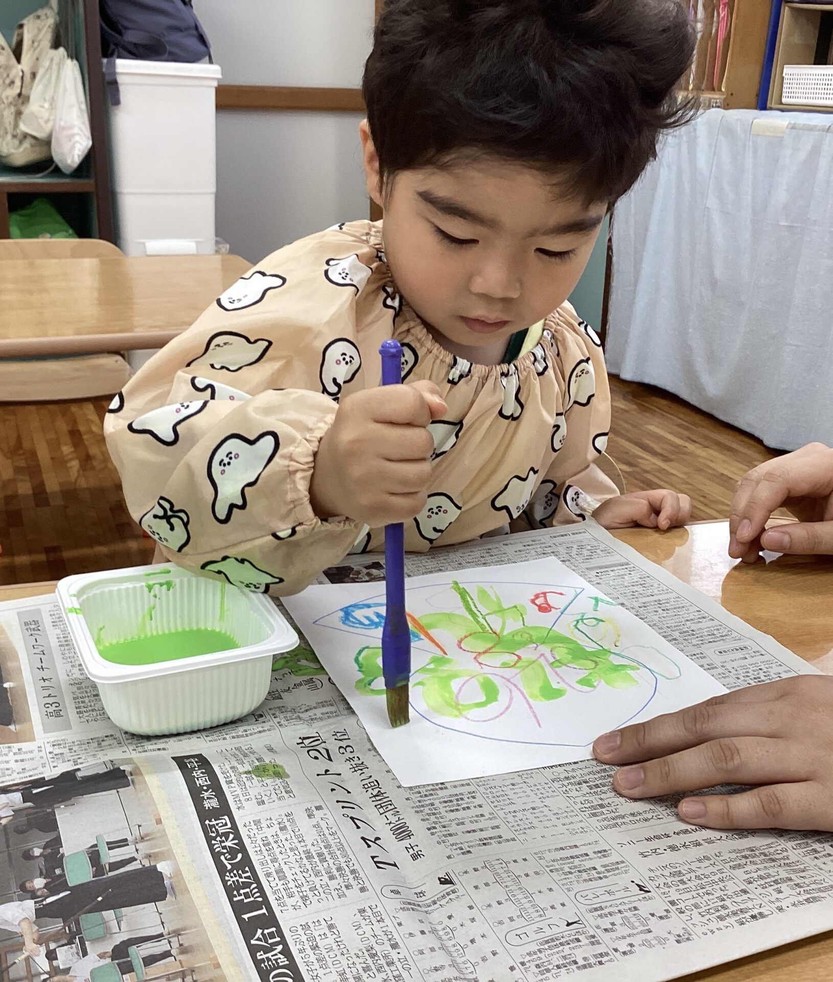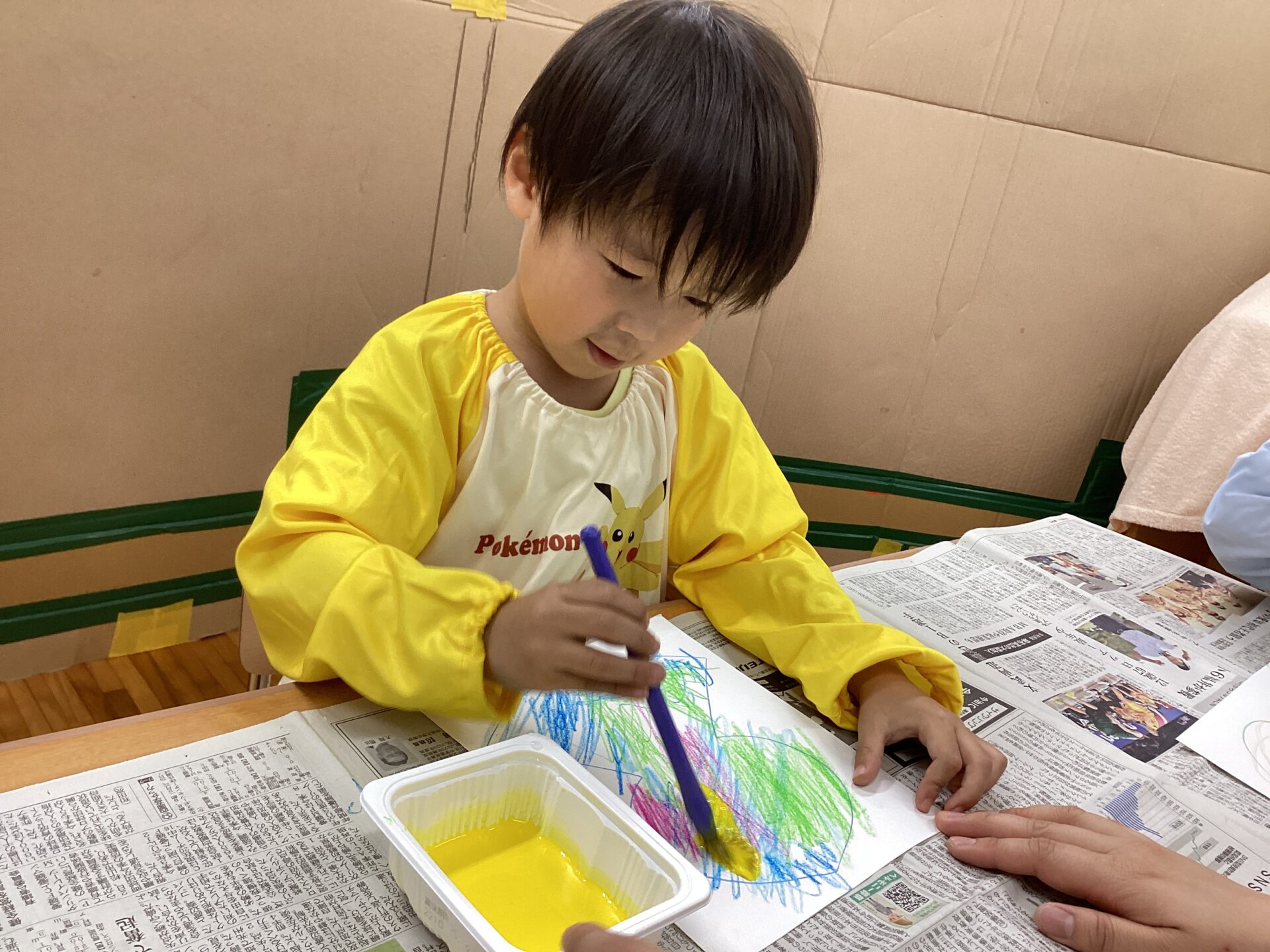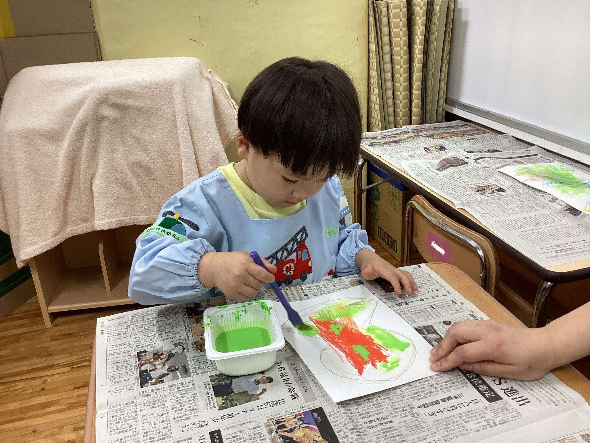 大人が絵の具を用意していると、「ぼくもしたいよ」と椅子を運んで机に座るYくん。かわいいです😁