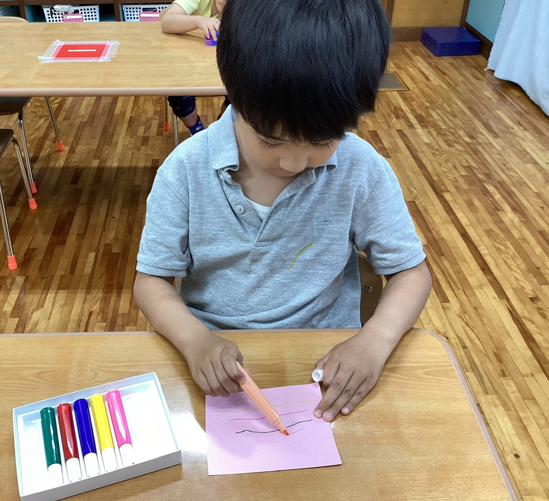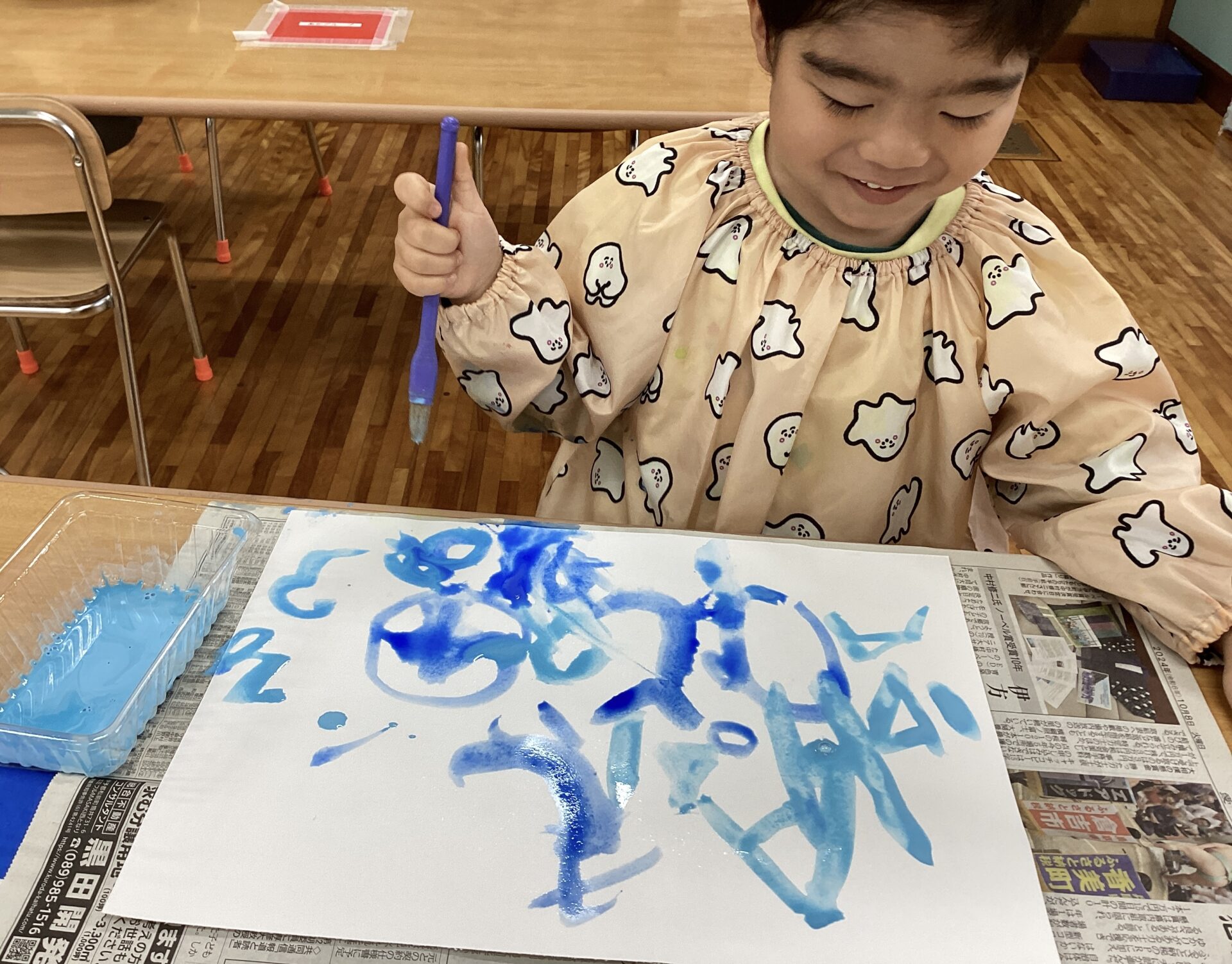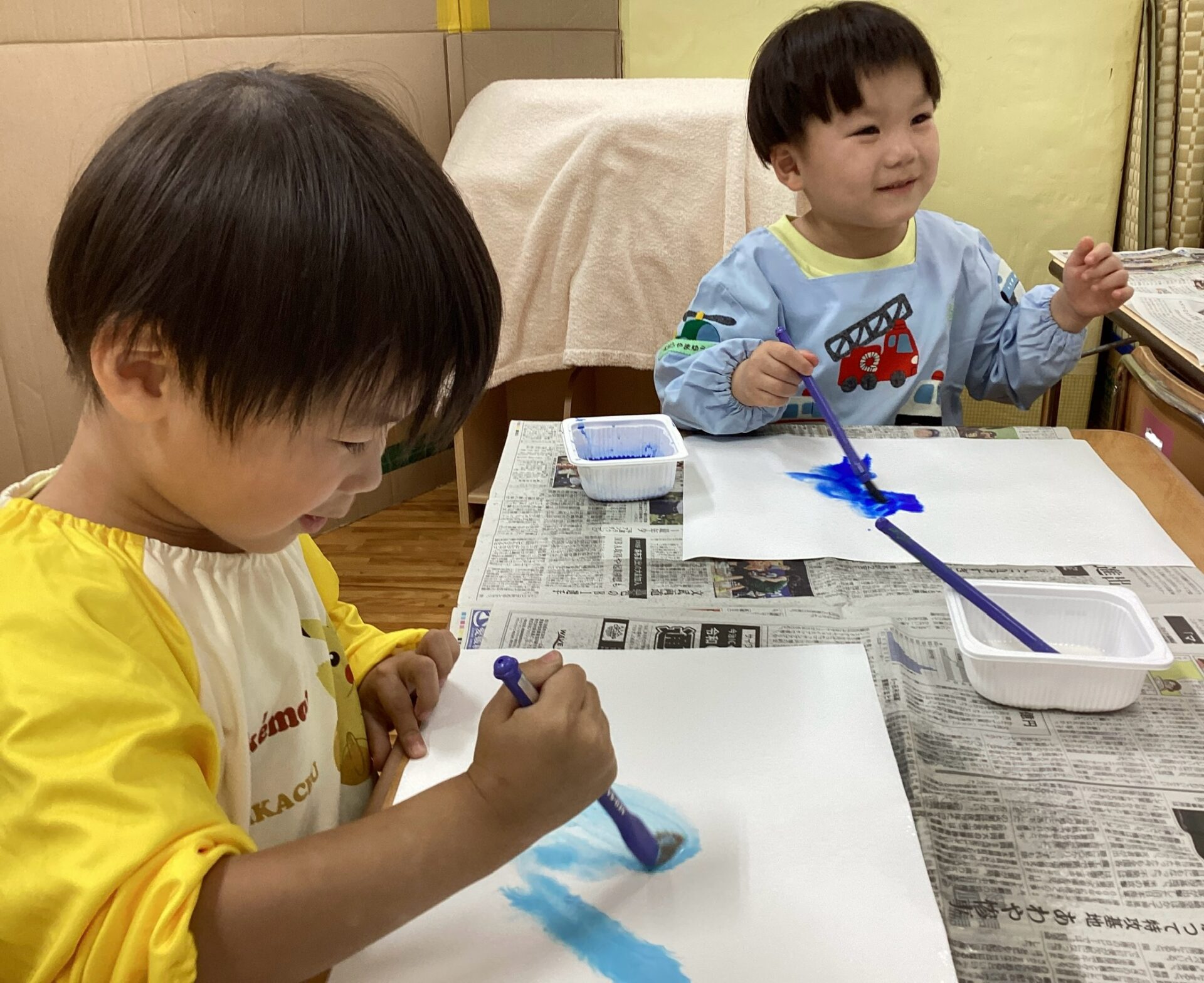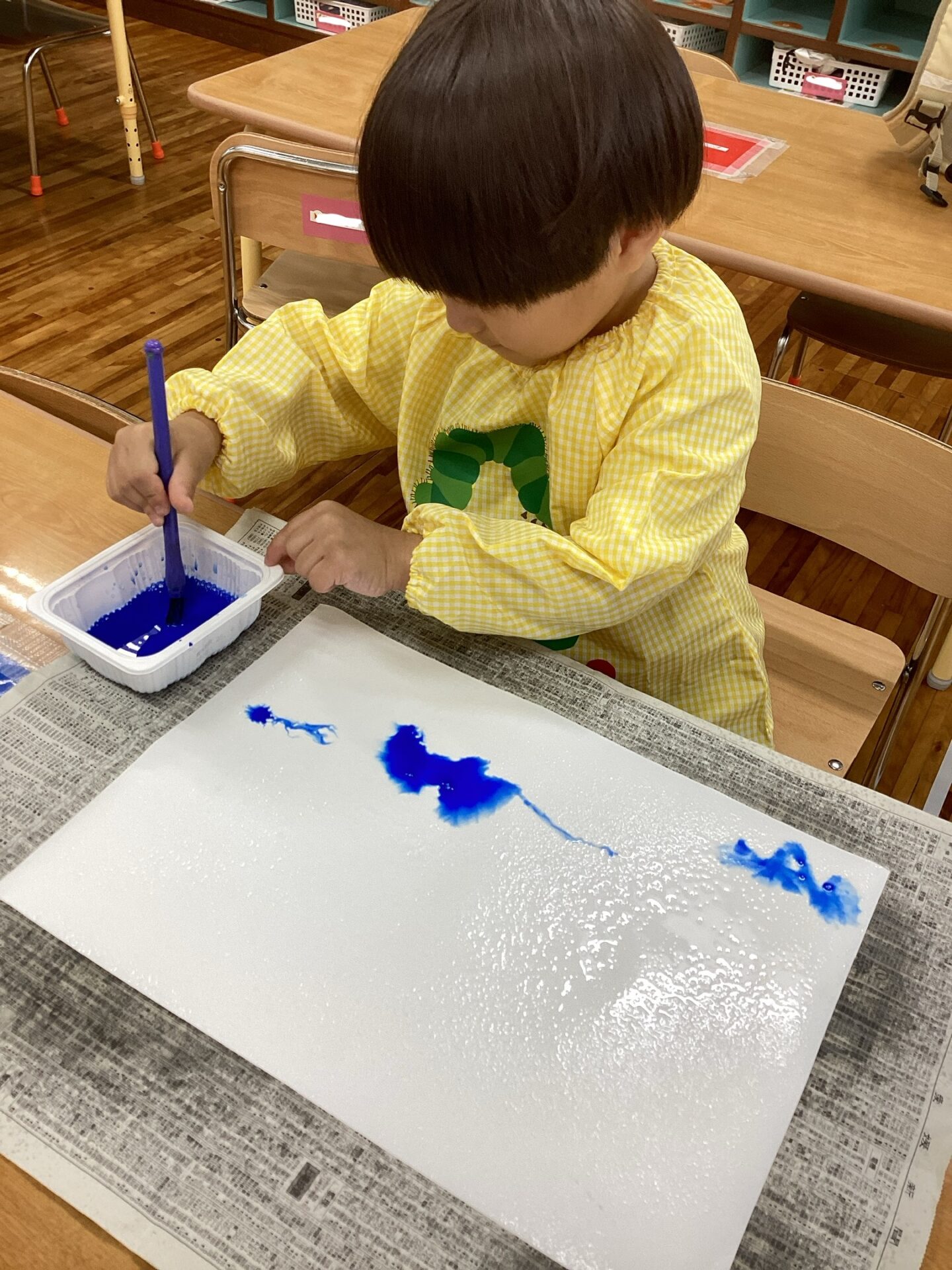 大人が絵の具を用意していると、「ぼくもしたいよ」と椅子を運んで机に座るYくん。かわいいです😁