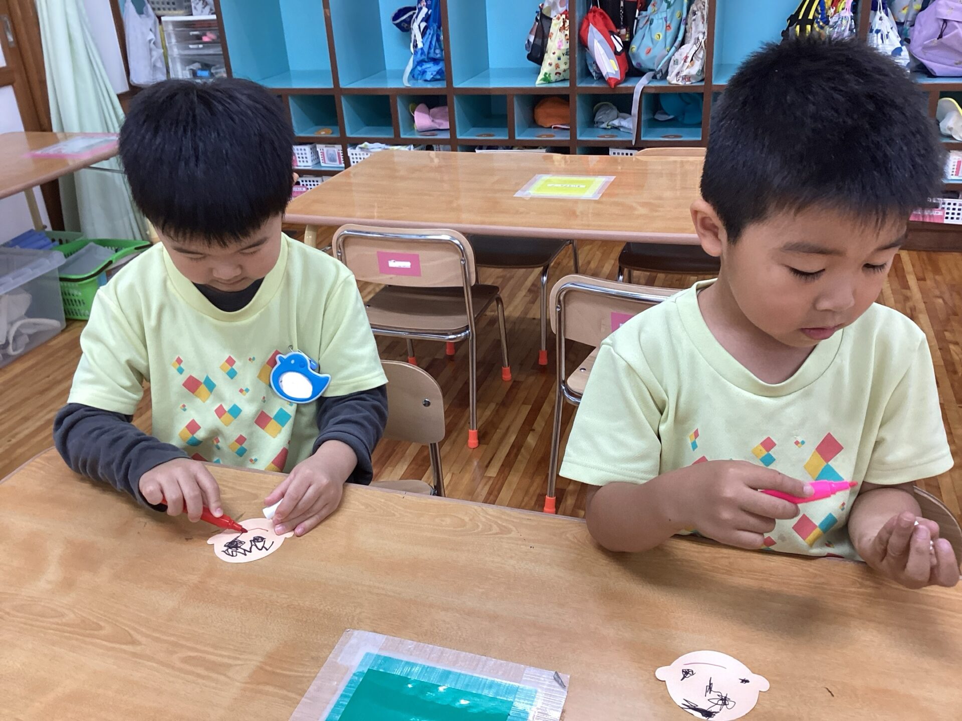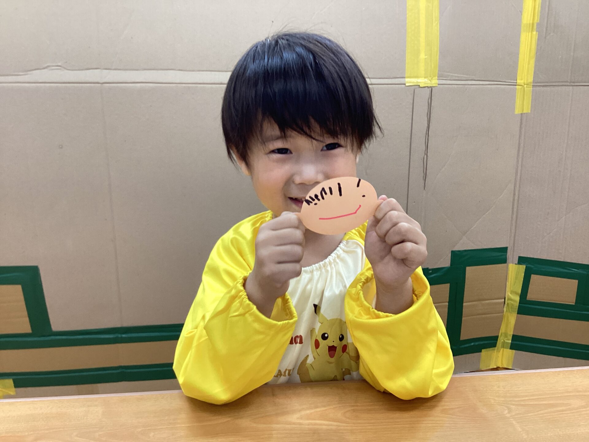 制作したものをそれぞれ画用紙に貼り付けて、お部屋に飾る予定です。少しずつ出来上がるのをみて、「だれの?」「かわいい❤️」とワクワクしている子どもたちです。