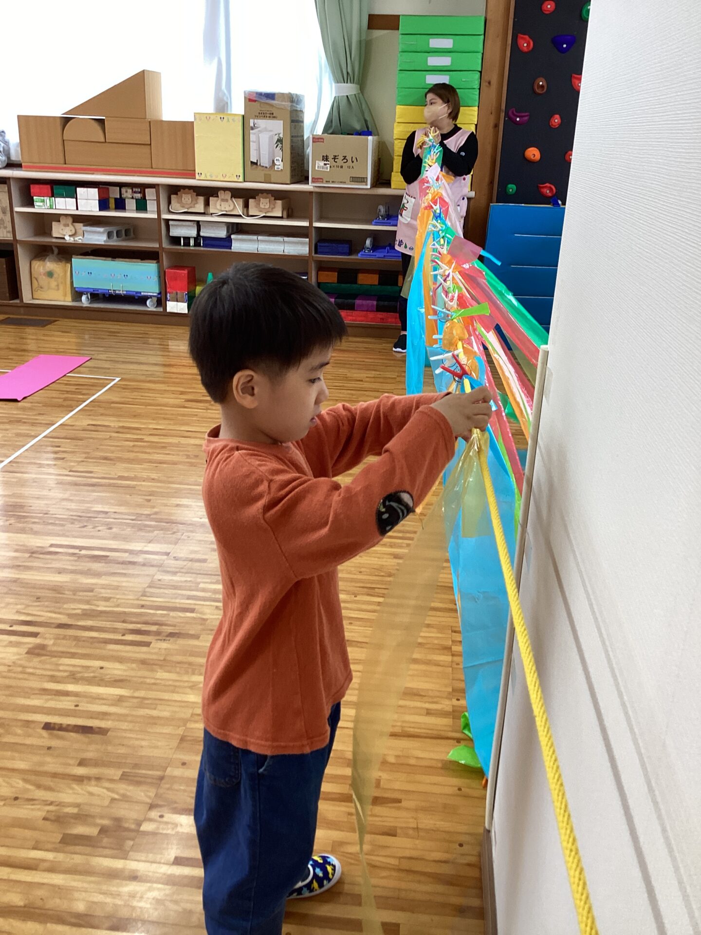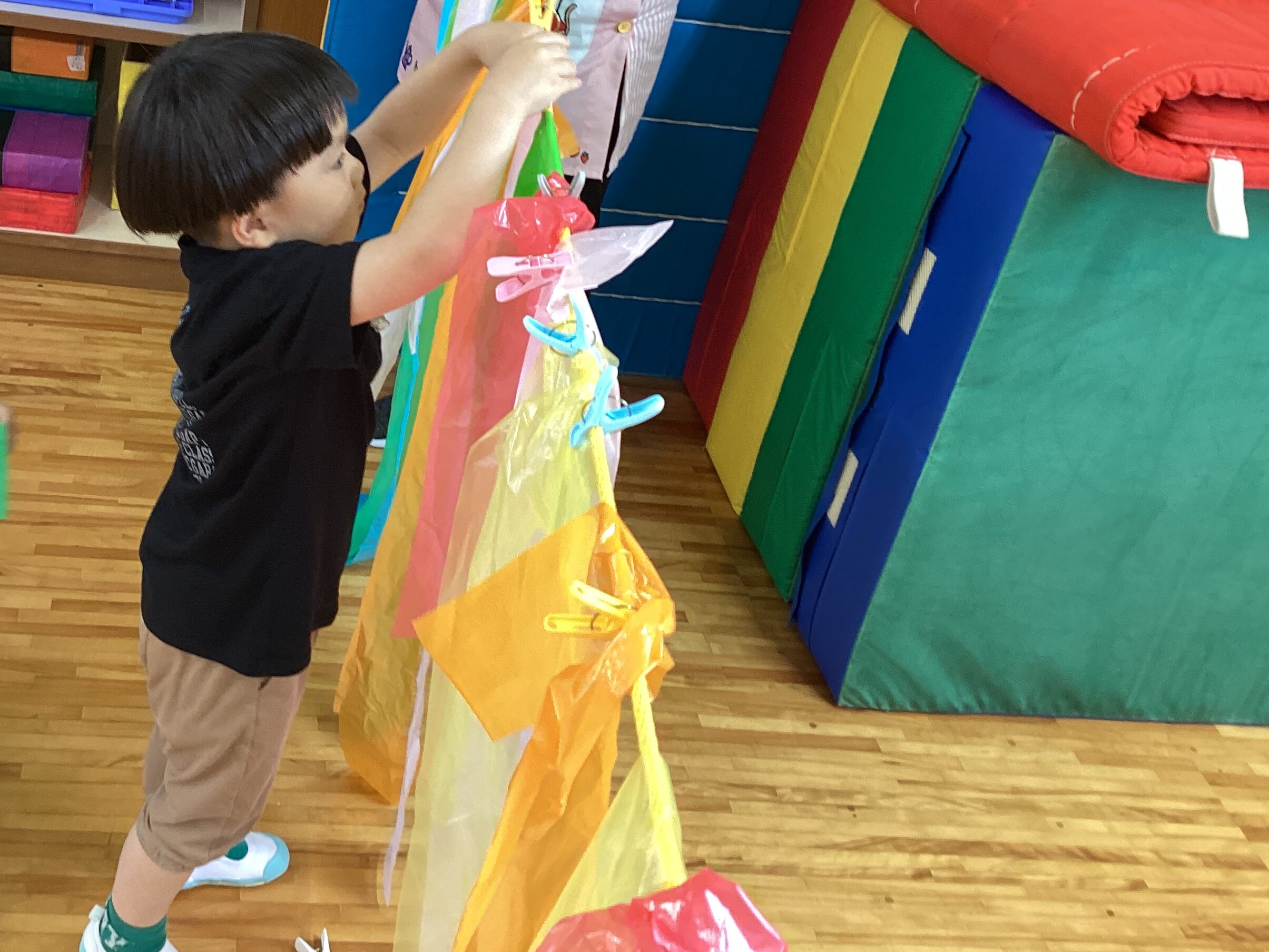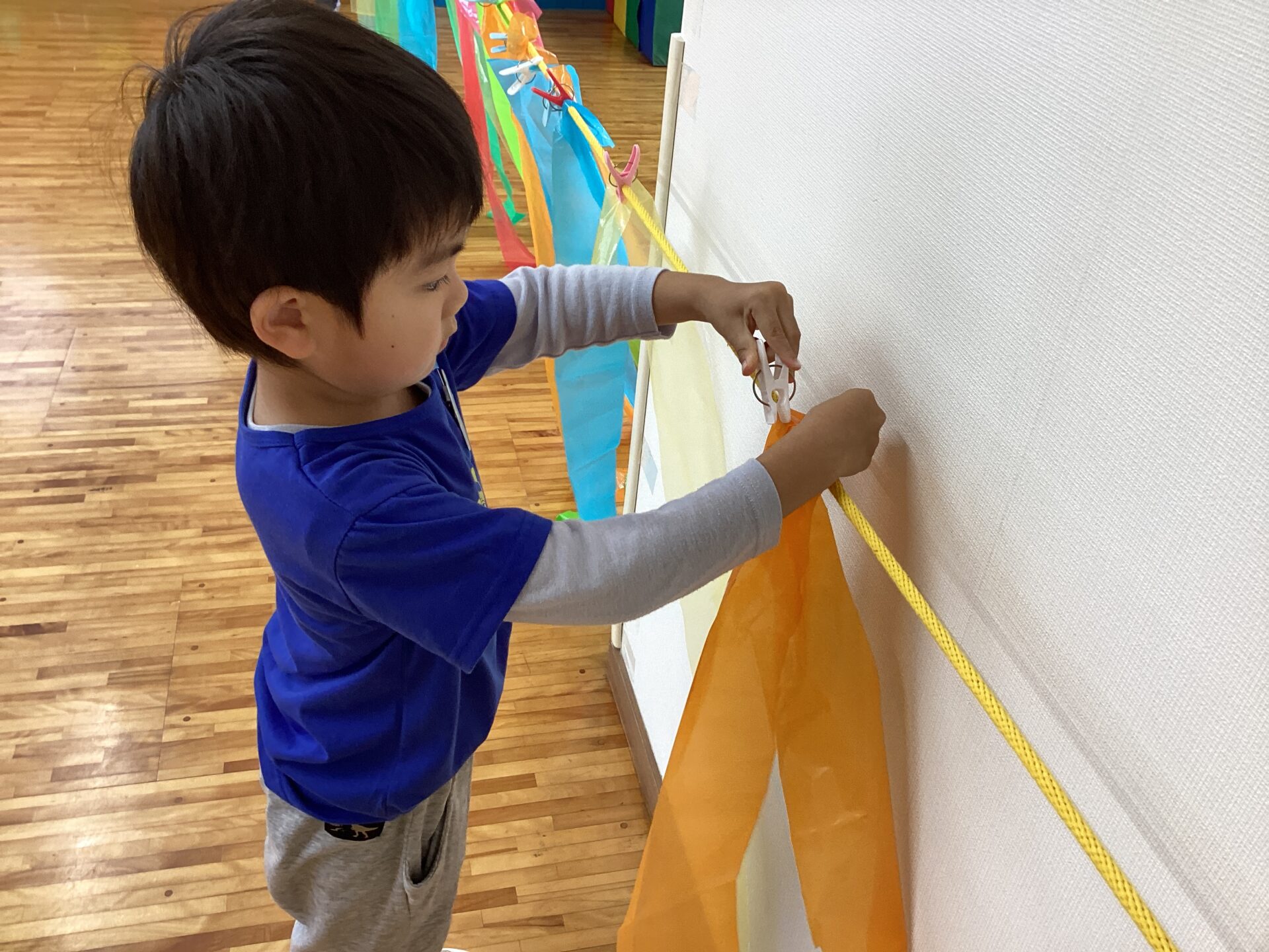 以前はロープにつけた洗濯バサミを摘まみ、カラーポリを挟んでいましたが、眺める時に持って走る(大人が)と外れる恐れがあるので、しっかり握ってロープに挟みこむように留めるように変更しています。