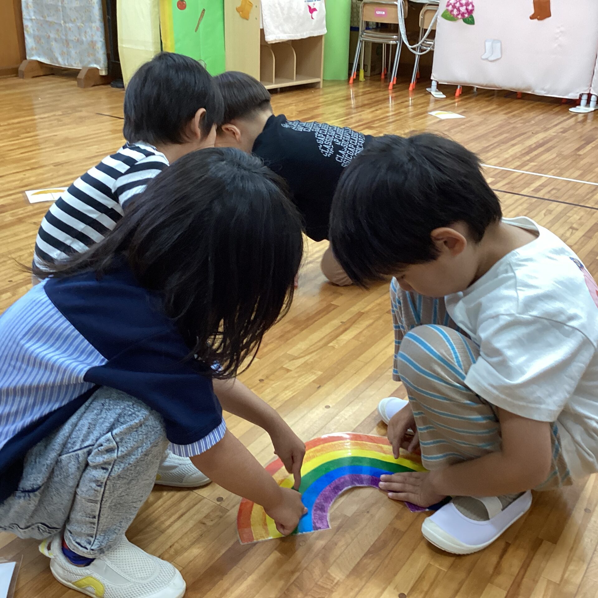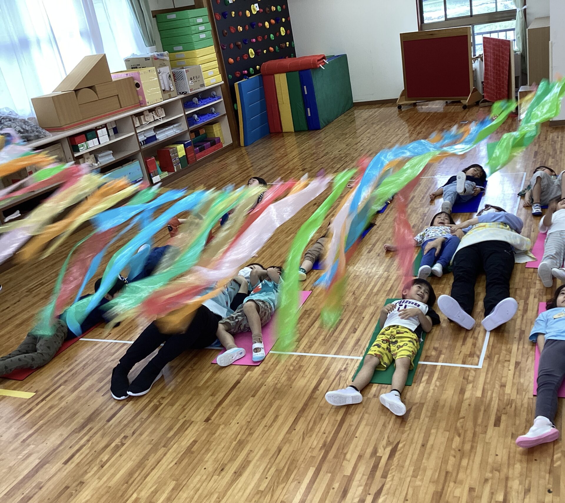 音楽が止まったらその場で止まって、「いろいろなにいろ?」と大人に聞いて、指定された色にタッチします🖐️