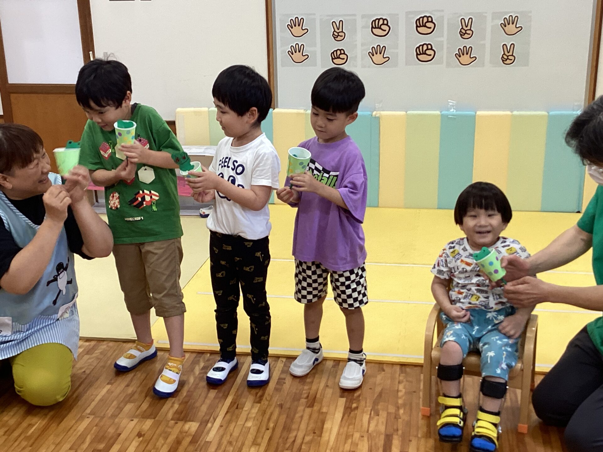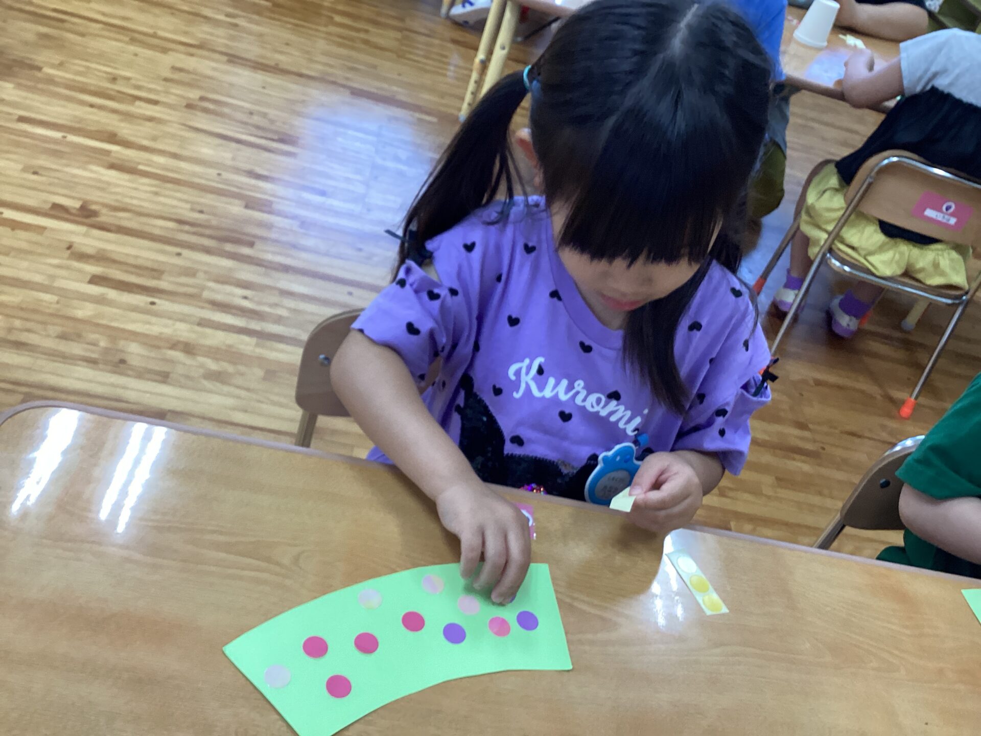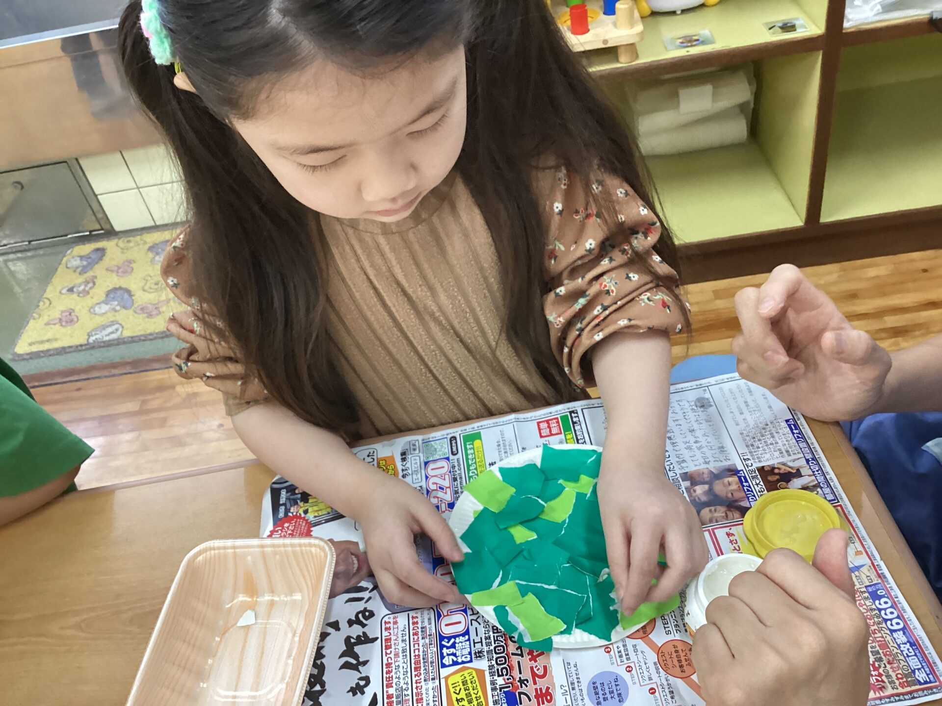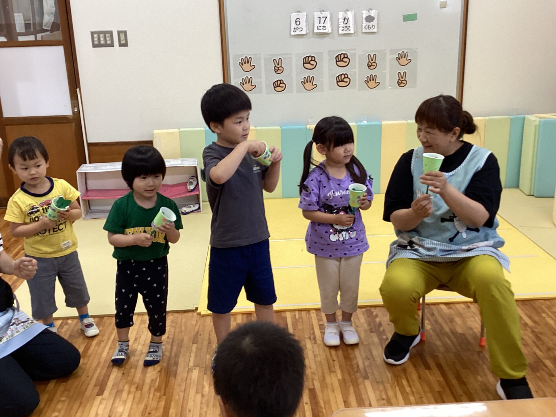 つけて、大人に紙コップの中心に穴を開けてもらって