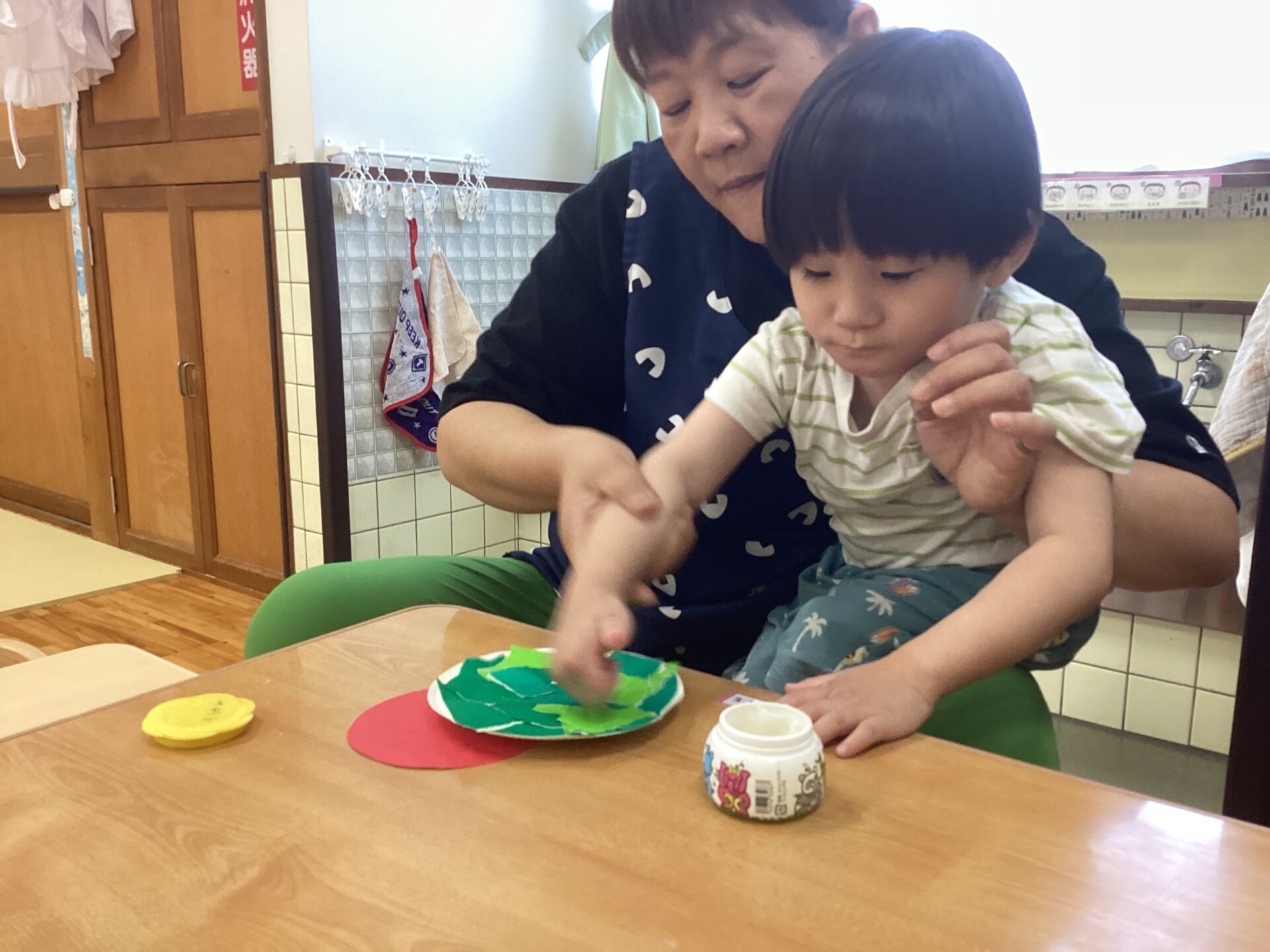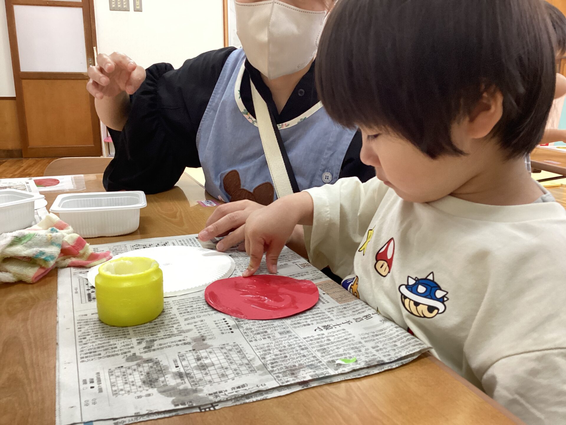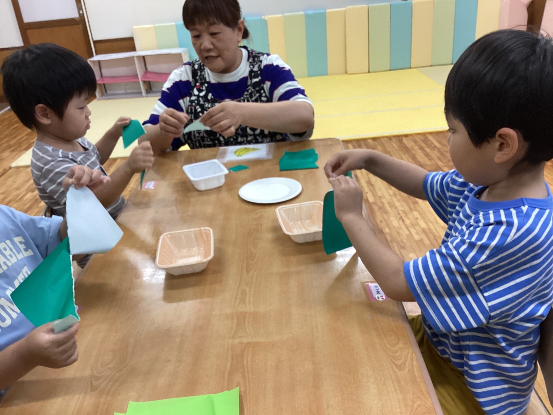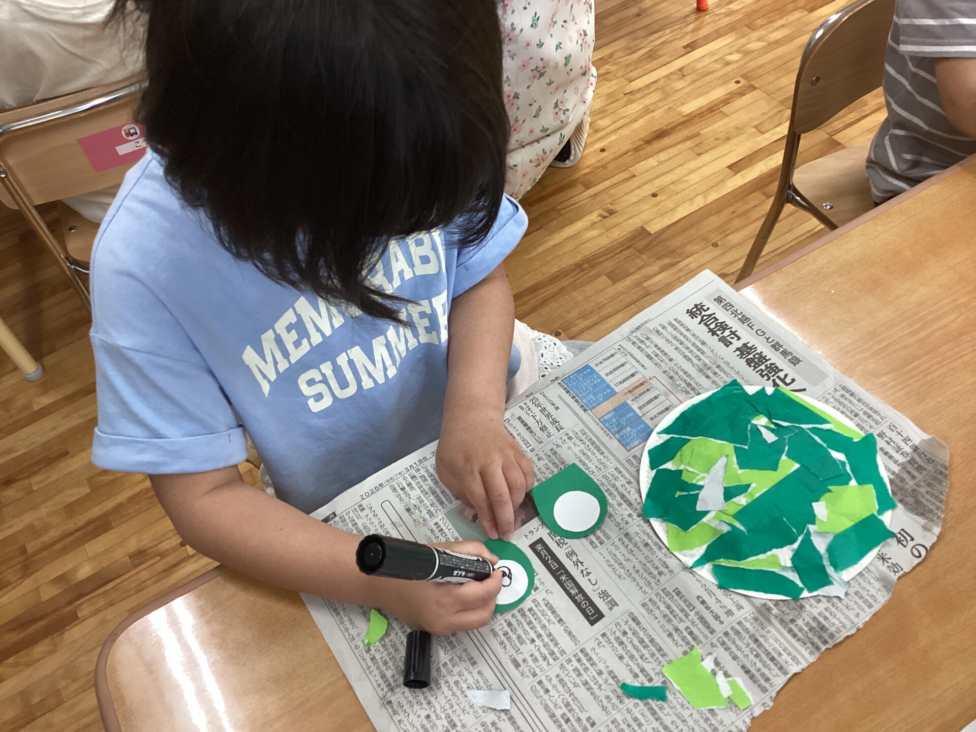 つけて、大人に紙コップの中心に穴を開けてもらって