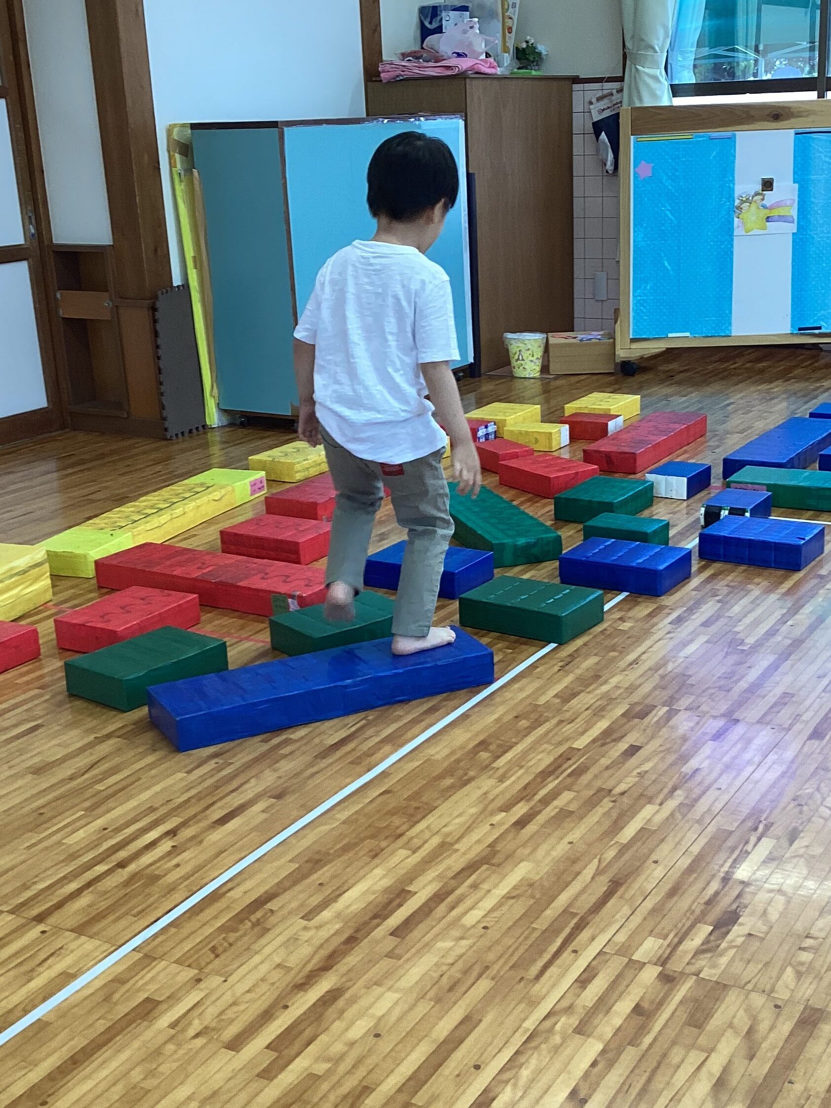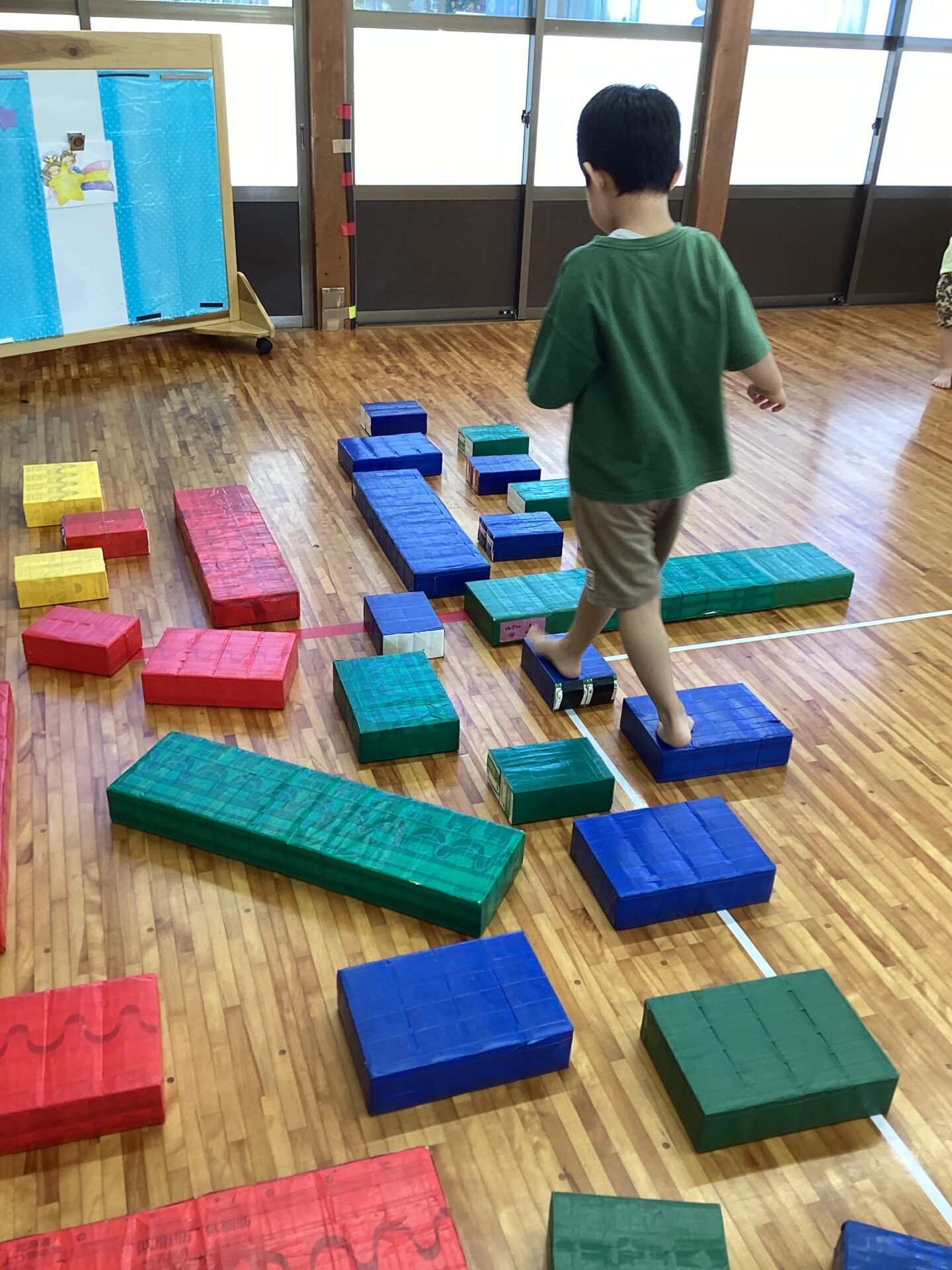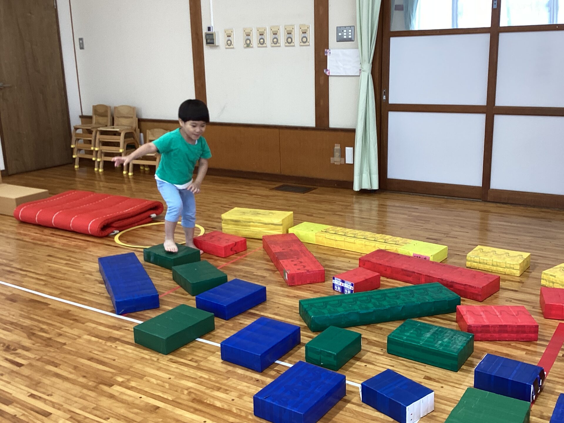 みどりが大好きなY君が、「みどりっ?」とリクエスト。それでも大人が「あか!」と指定すると、「あかっ!」とリクエストを受け入れて赤の飛び石をすすむ姿が…