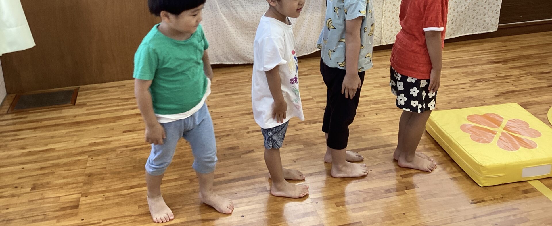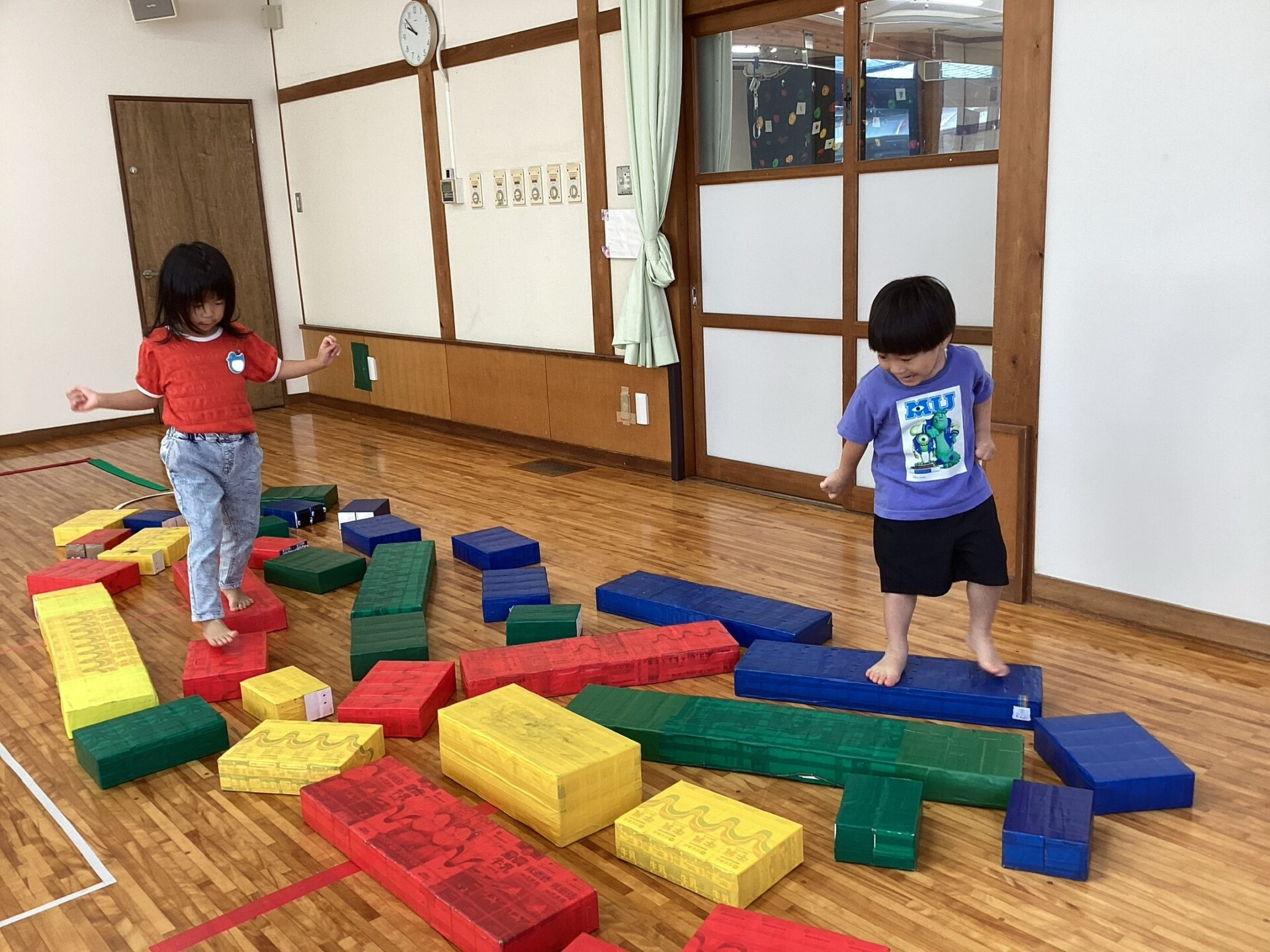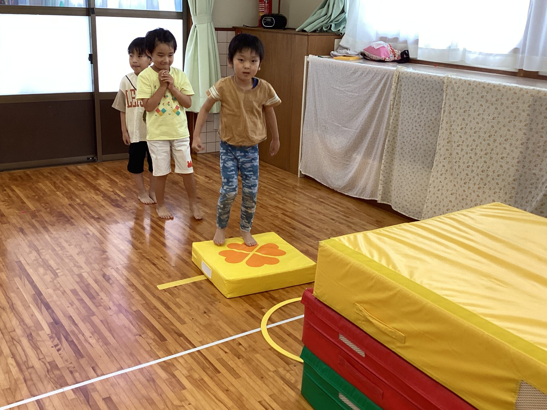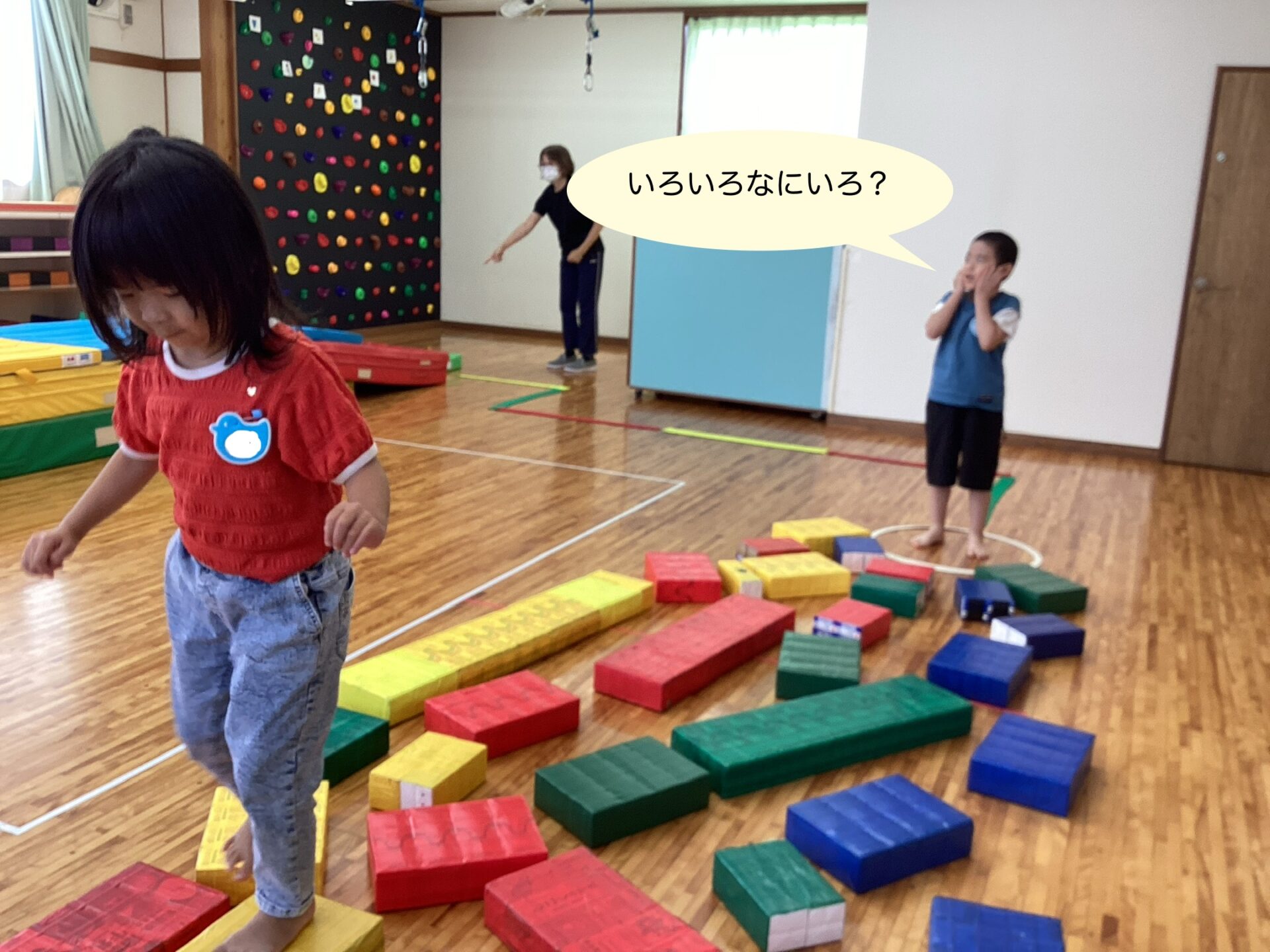 みどりが大好きなY君が、「みどりっ?」とリクエスト。それでも大人が「あか!」と指定すると、「あかっ!」とリクエストを受け入れて赤の飛び石をすすむ姿が…