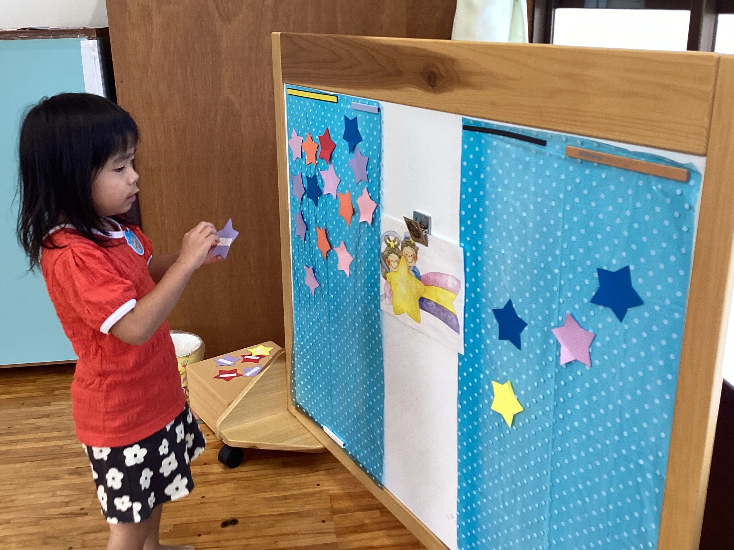 天の川に見立てた、4色の飛び石を渡って織姫と彦星がいる夜空に星を貼り付けに行くようにしました。