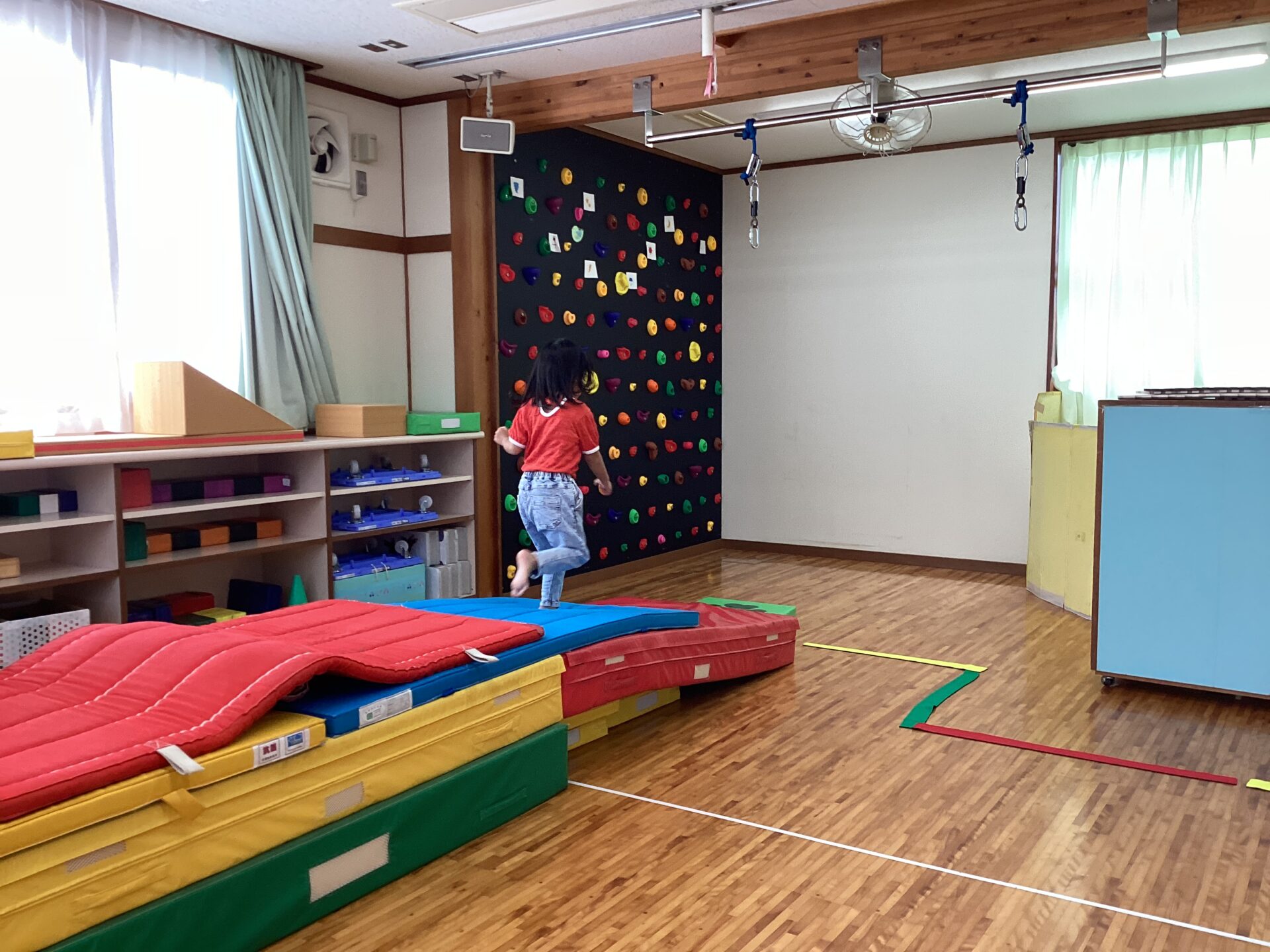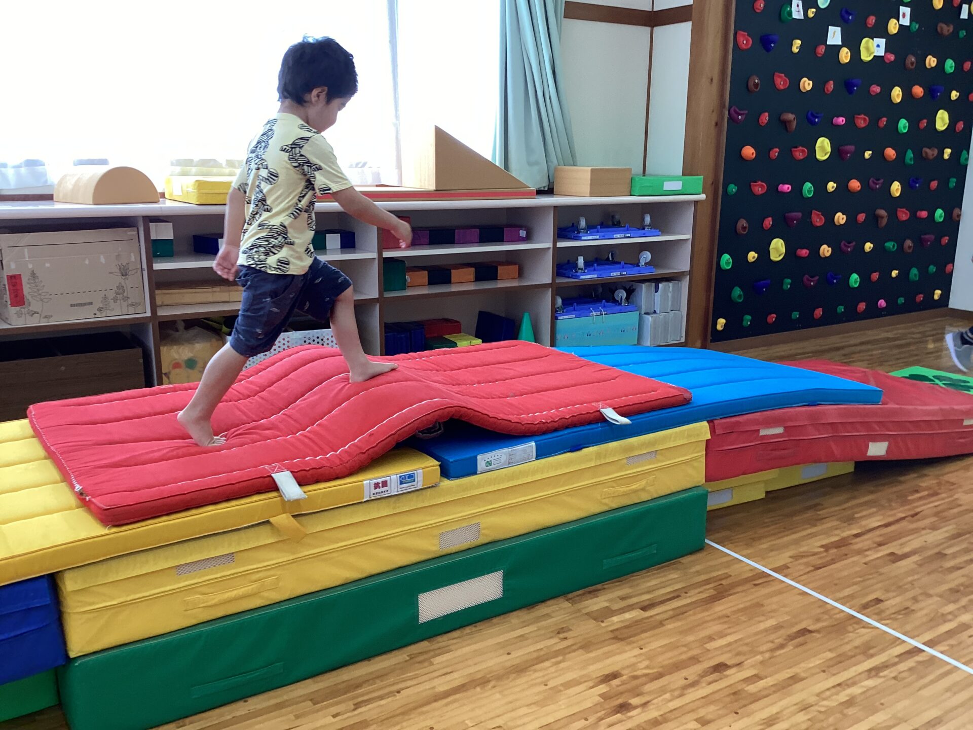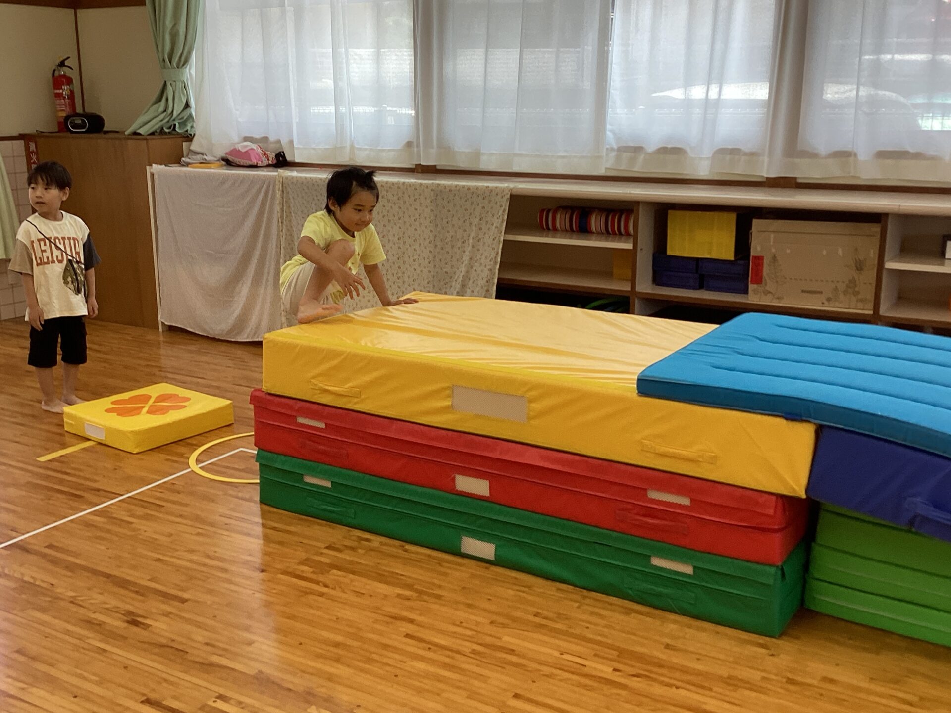 マットの山を歩いたり、走ったりして自然とバランスを保てるようなきっかけづくりをしています。