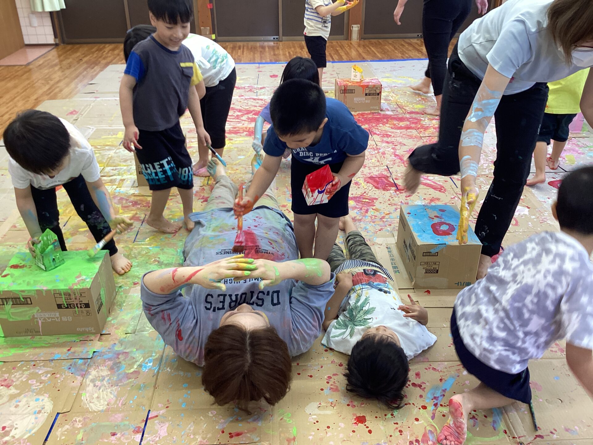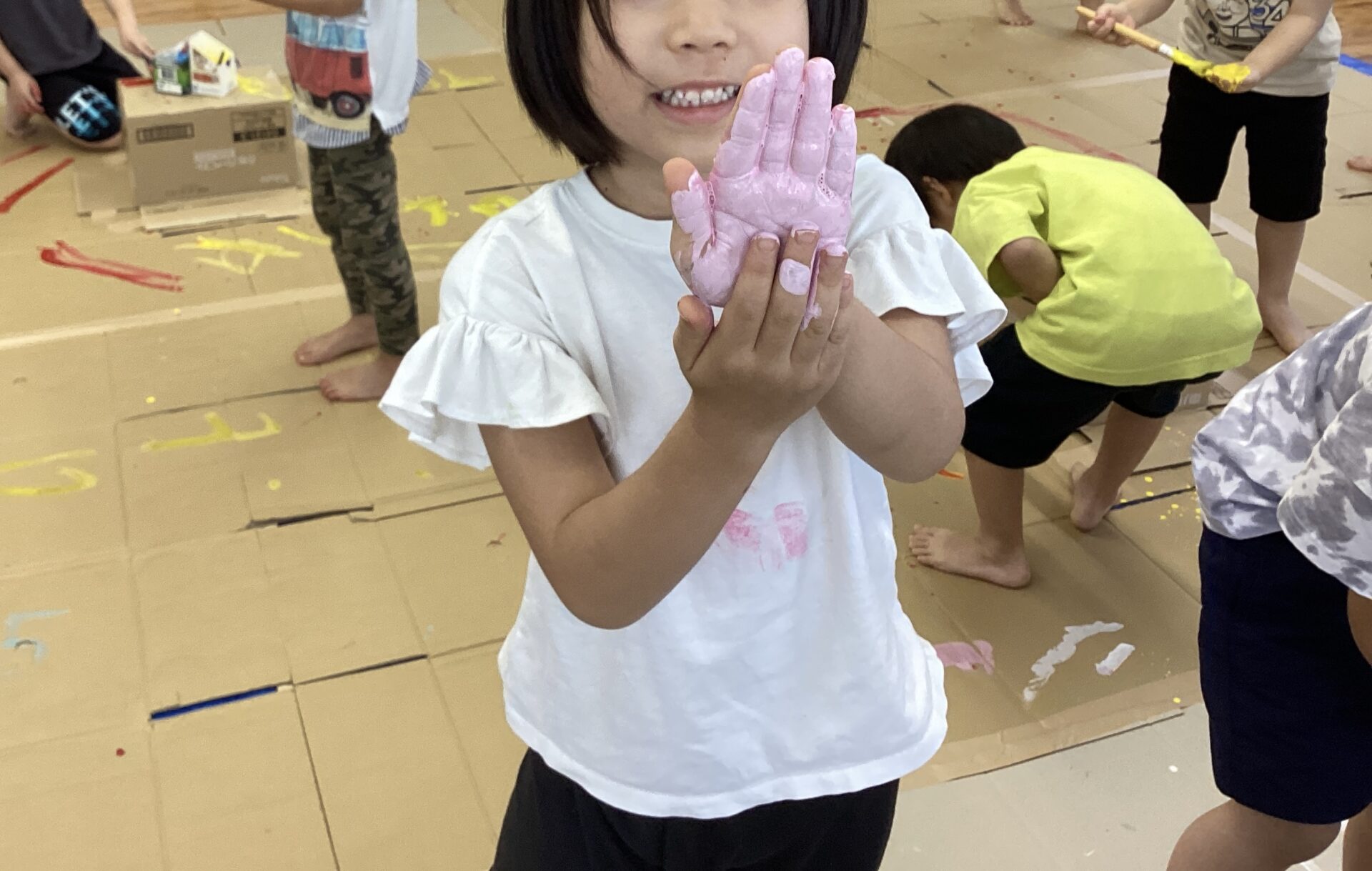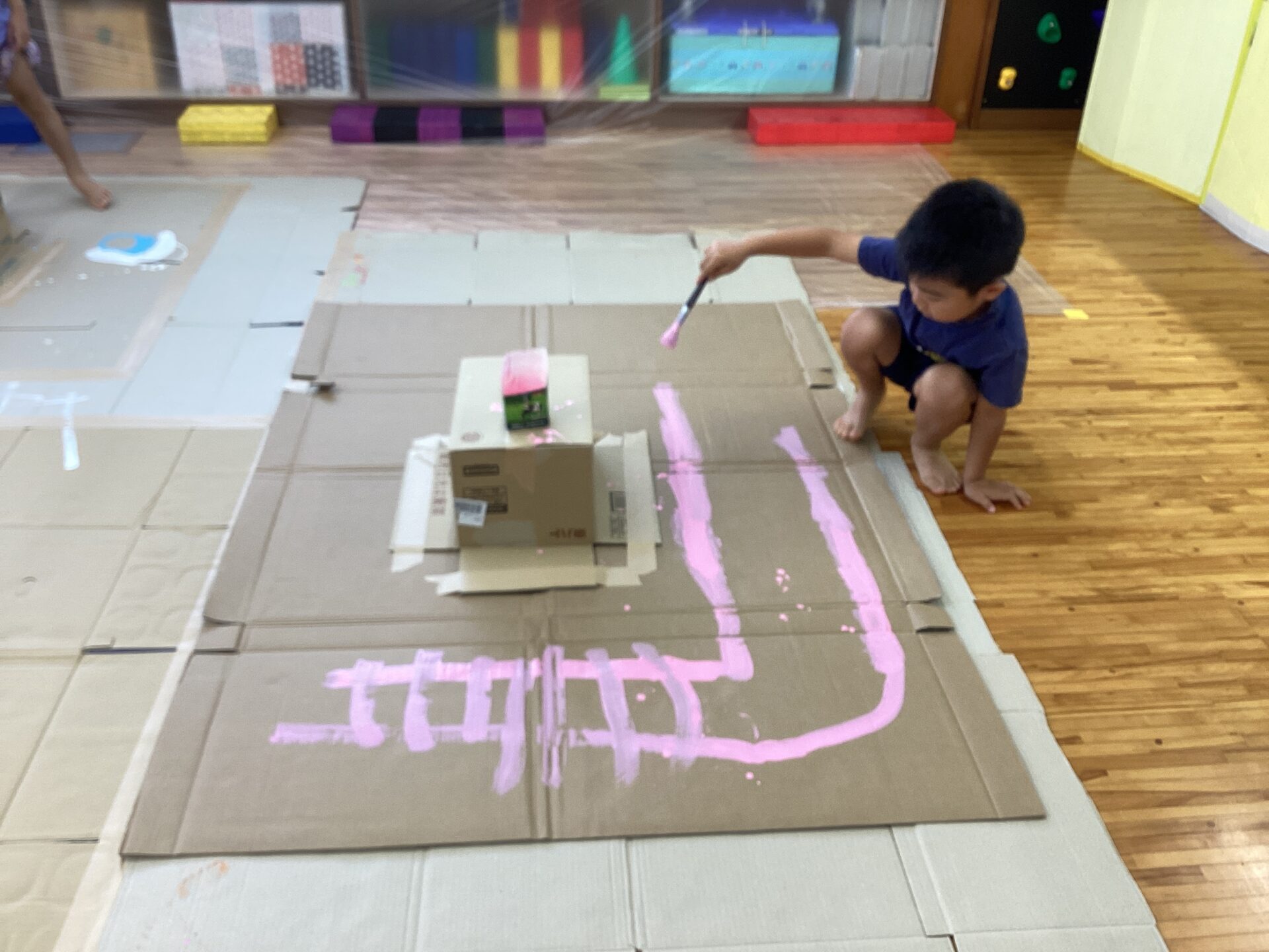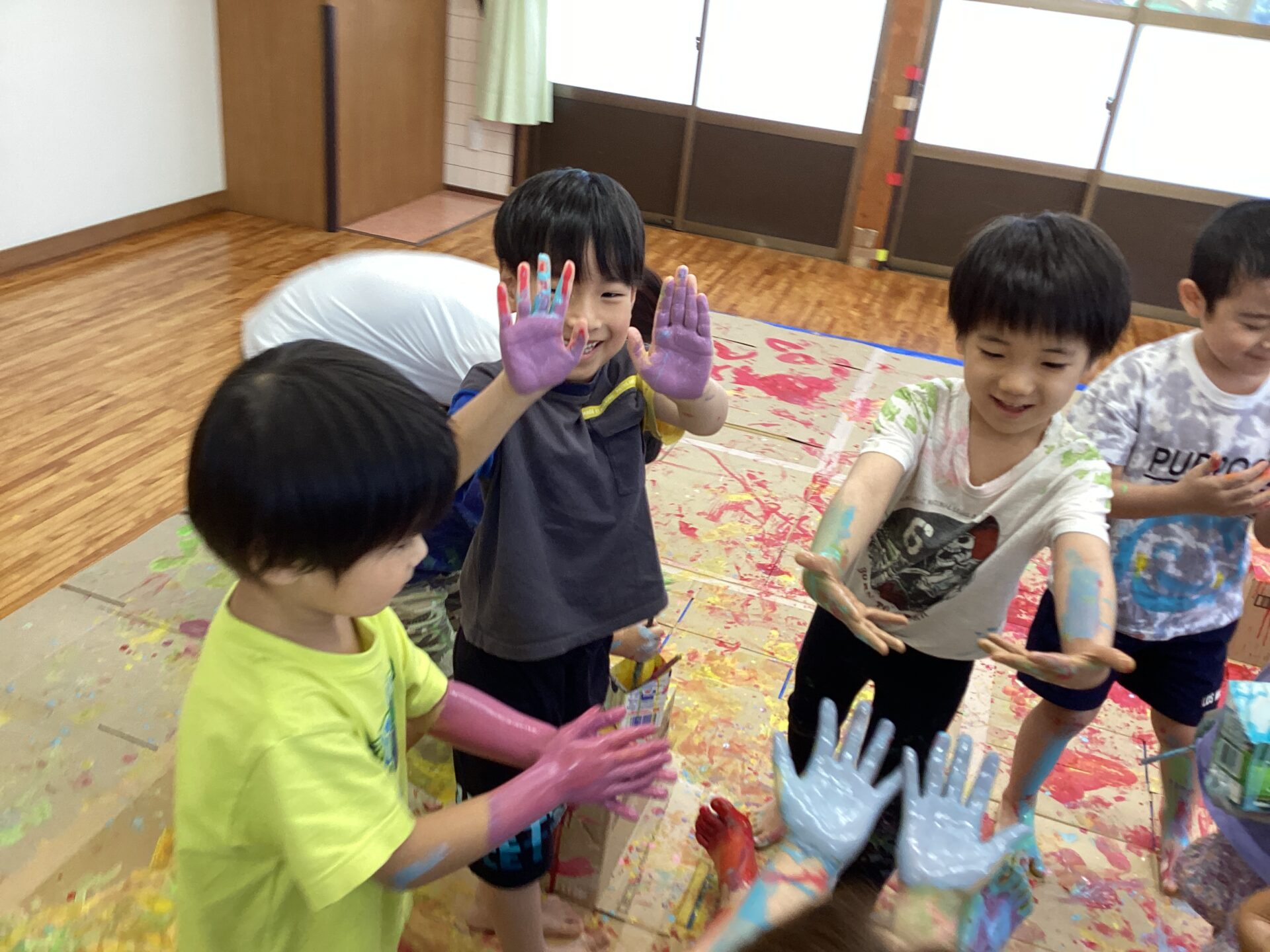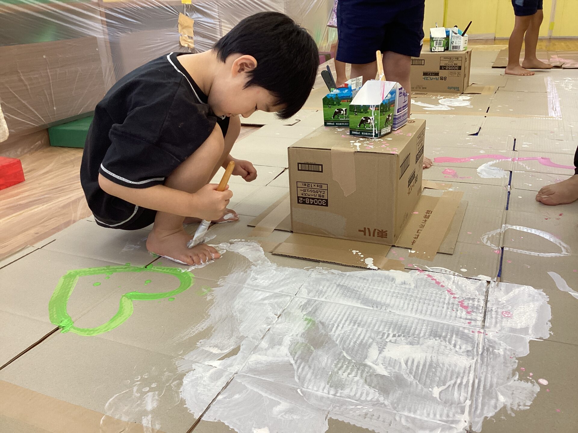 部屋いっぱいのキャンバスにワクワクが止まらない子どもたちです。