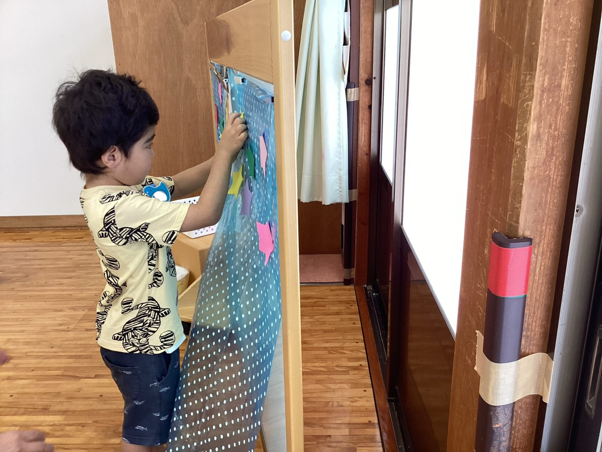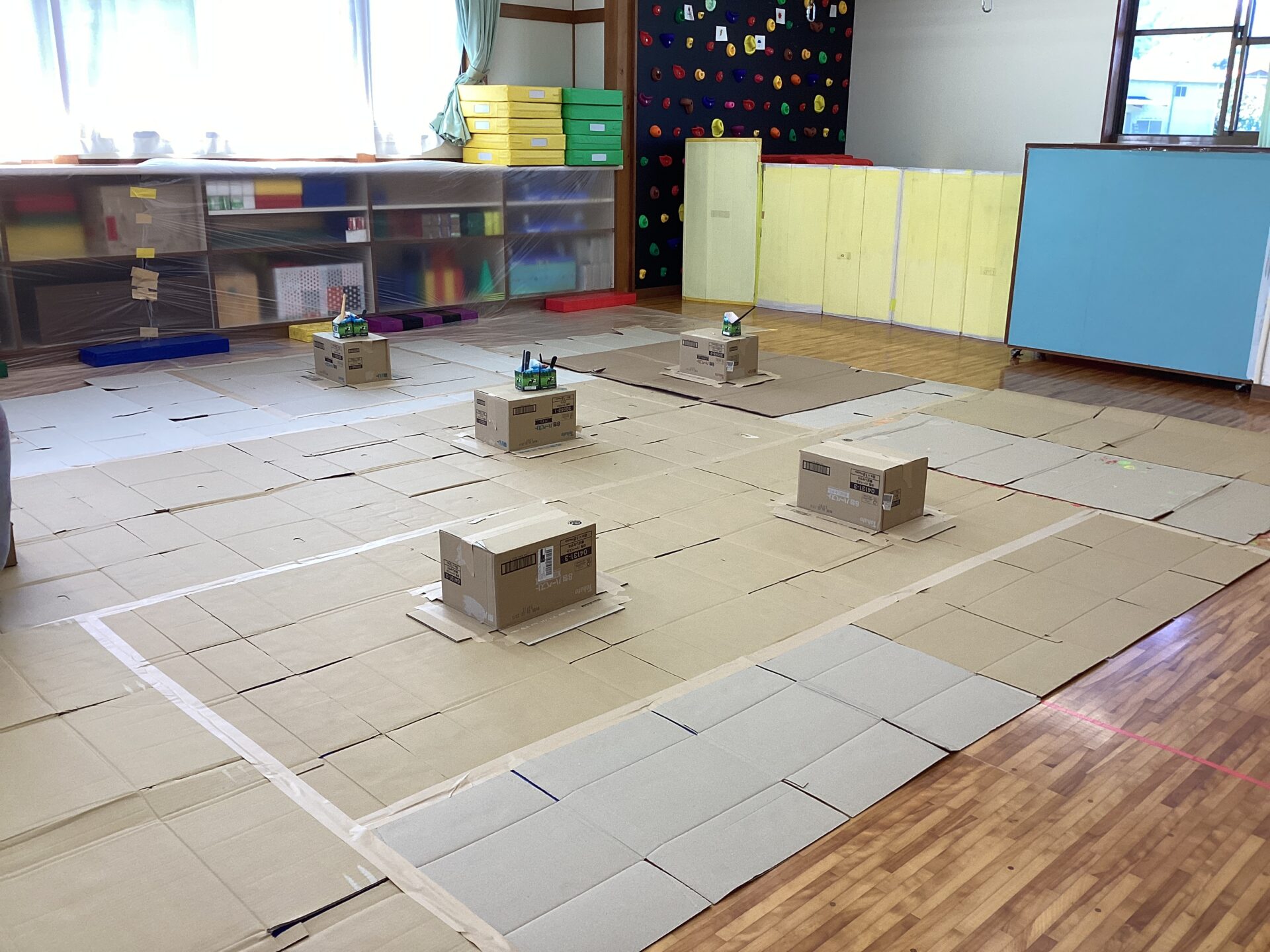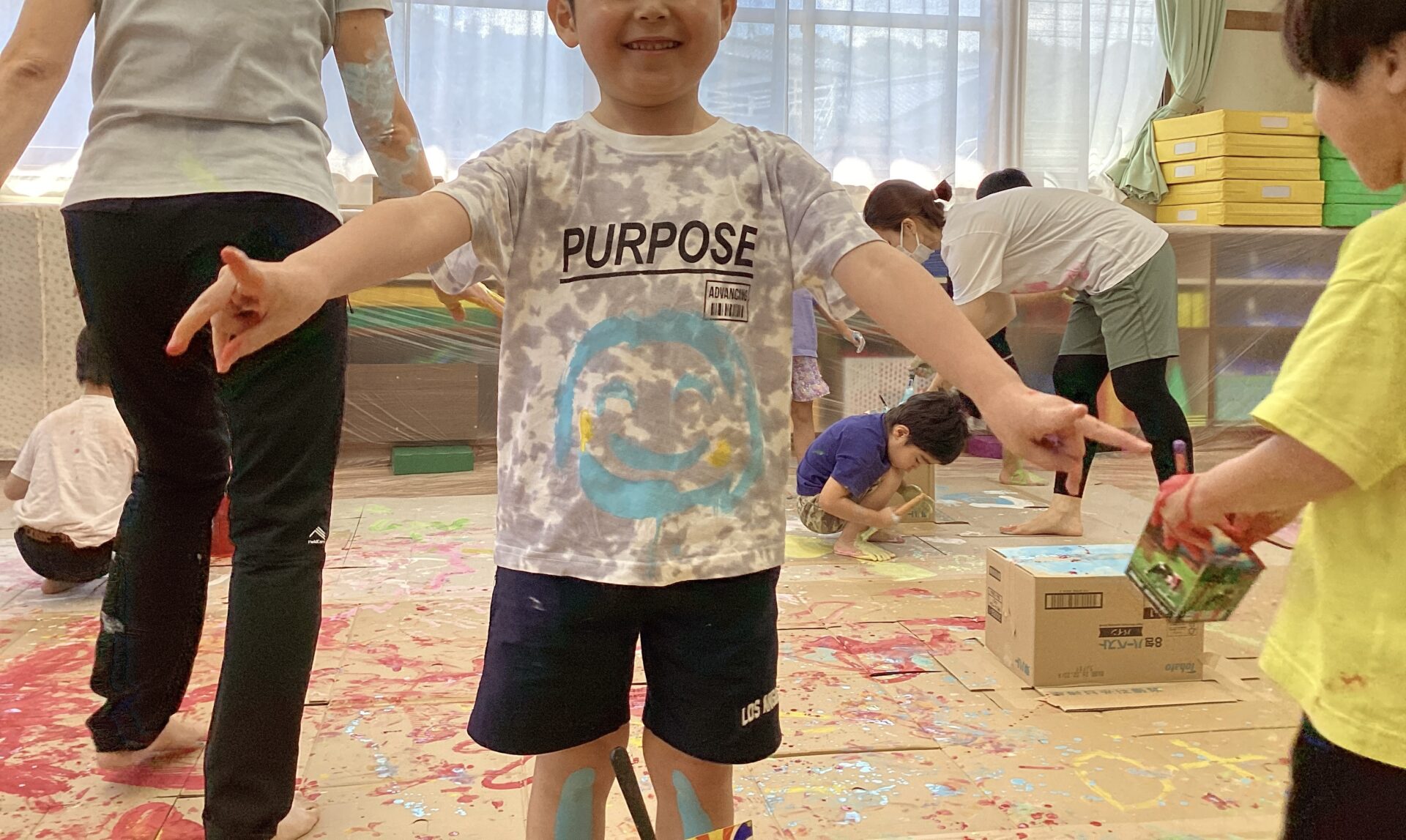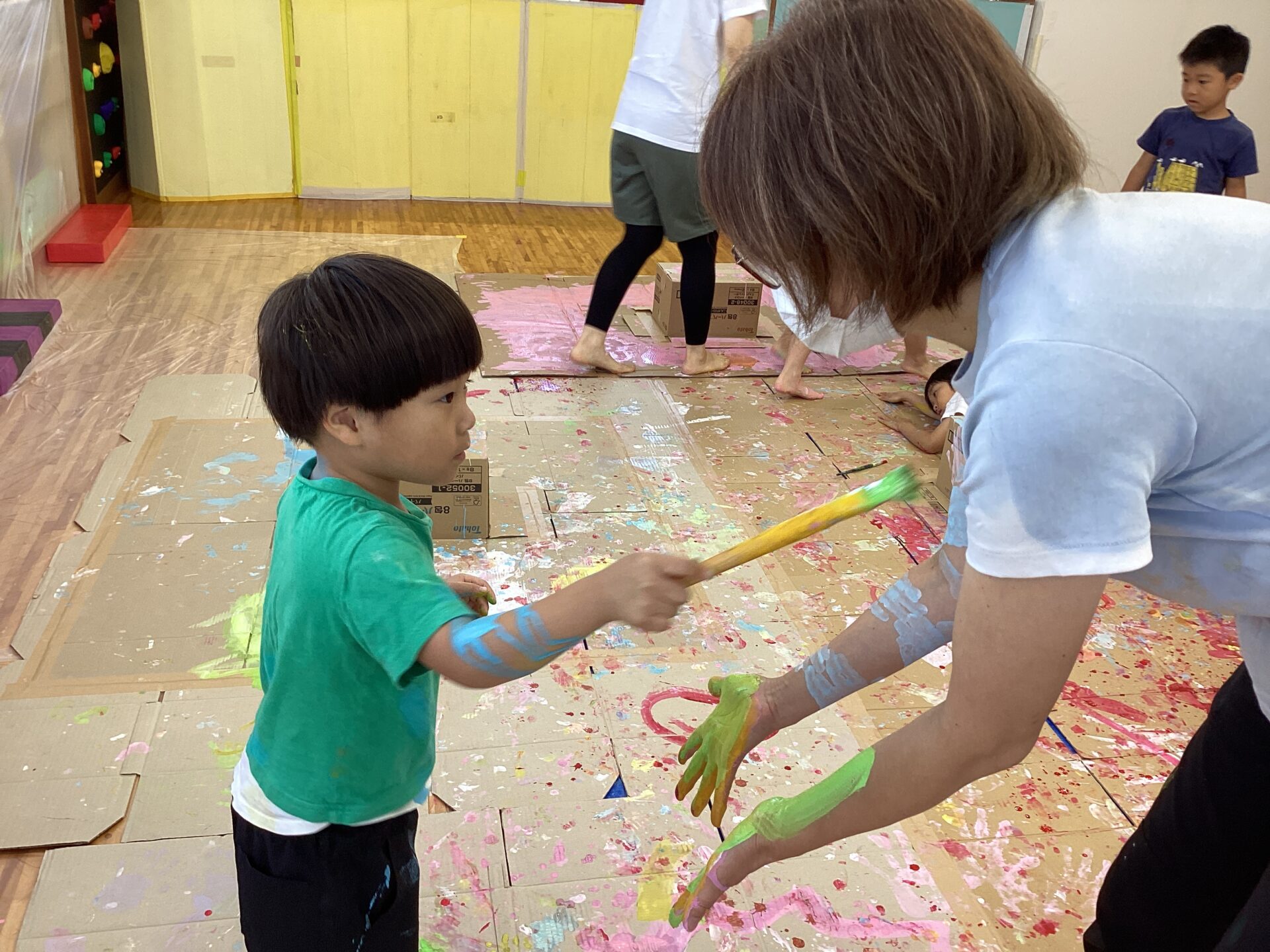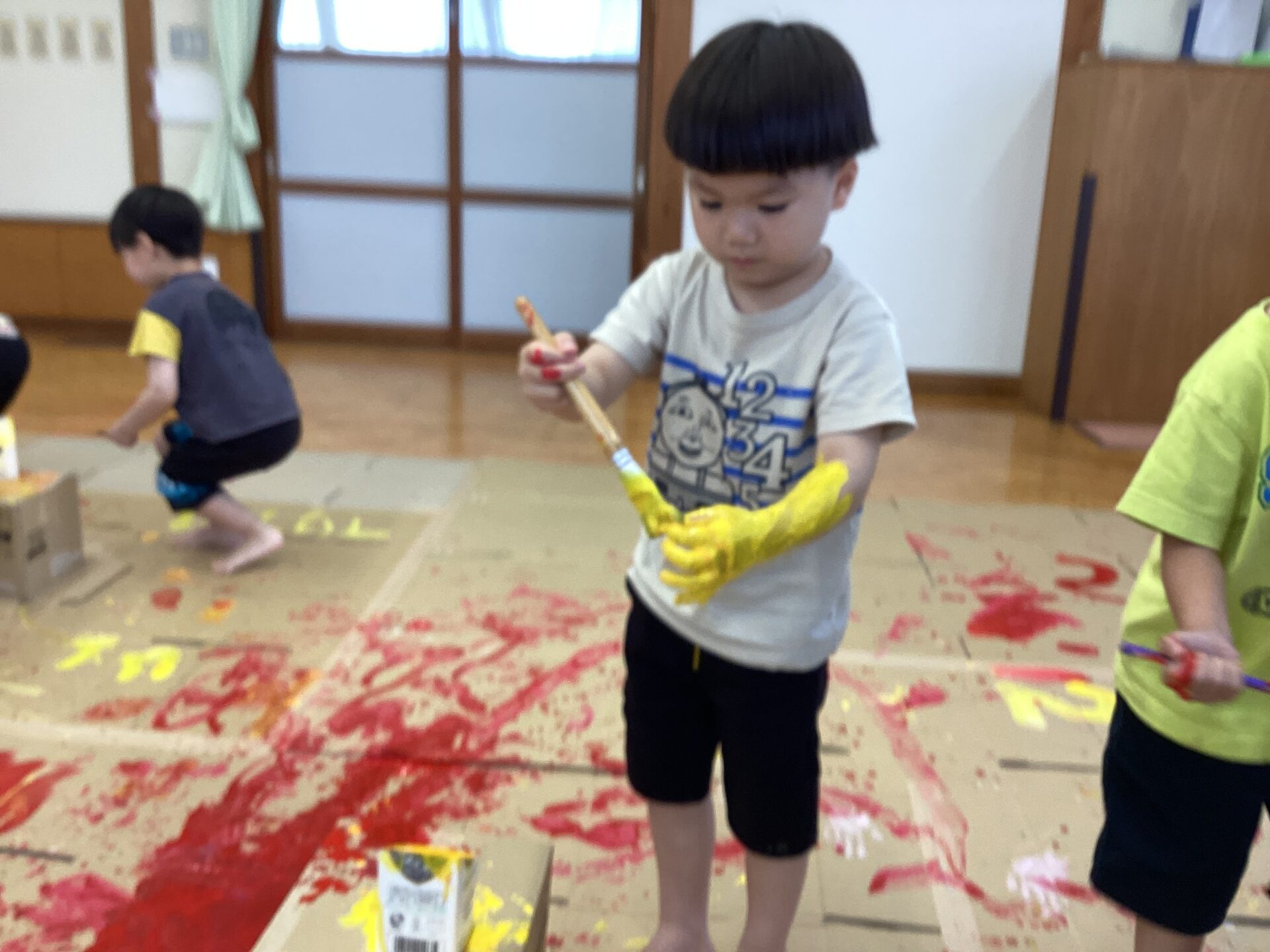 部屋いっぱいのキャンバスにワクワクが止まらない子どもたちです。
