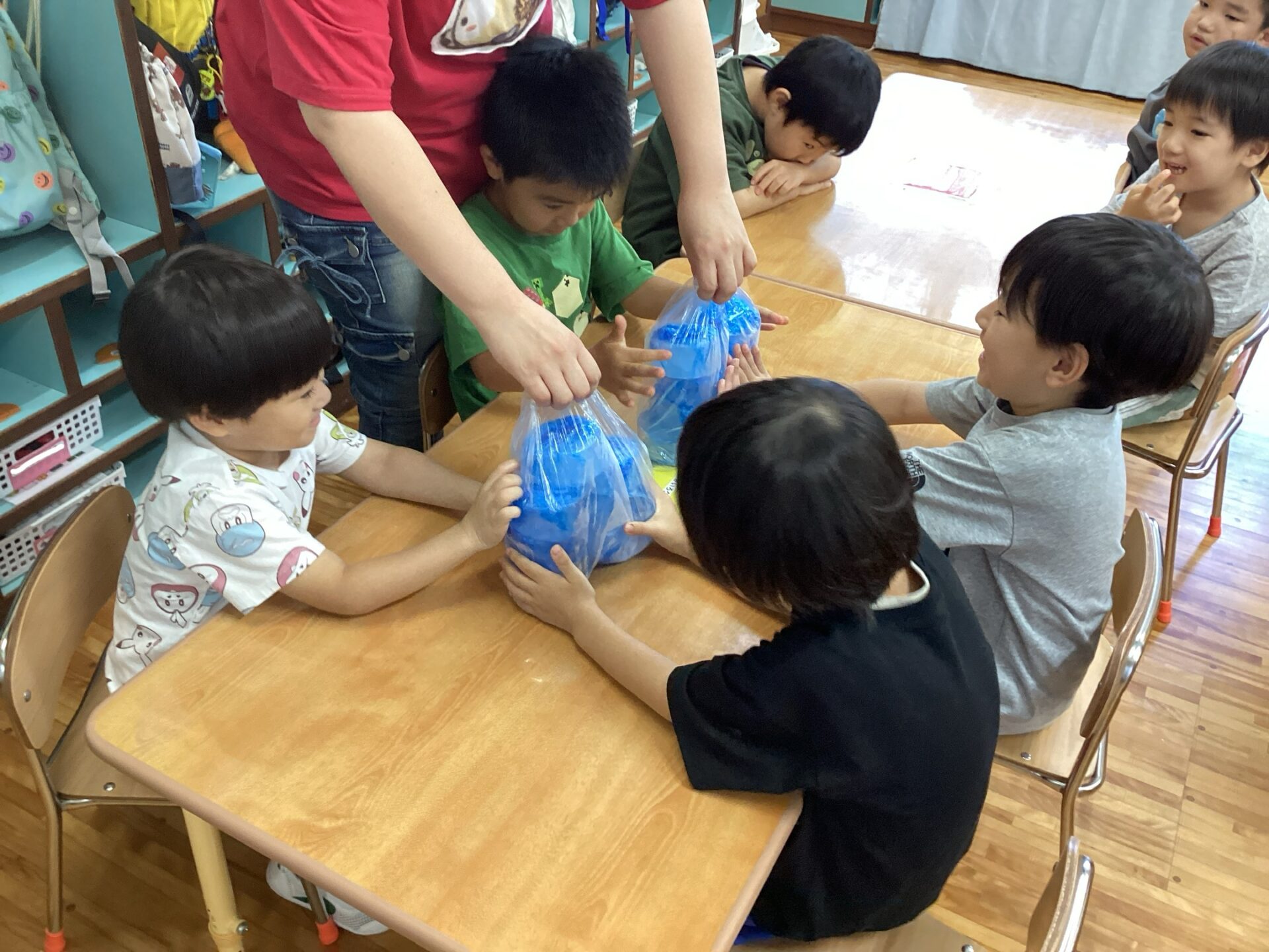 給食室で用意してもらった氷を袋越しに触っています🧊