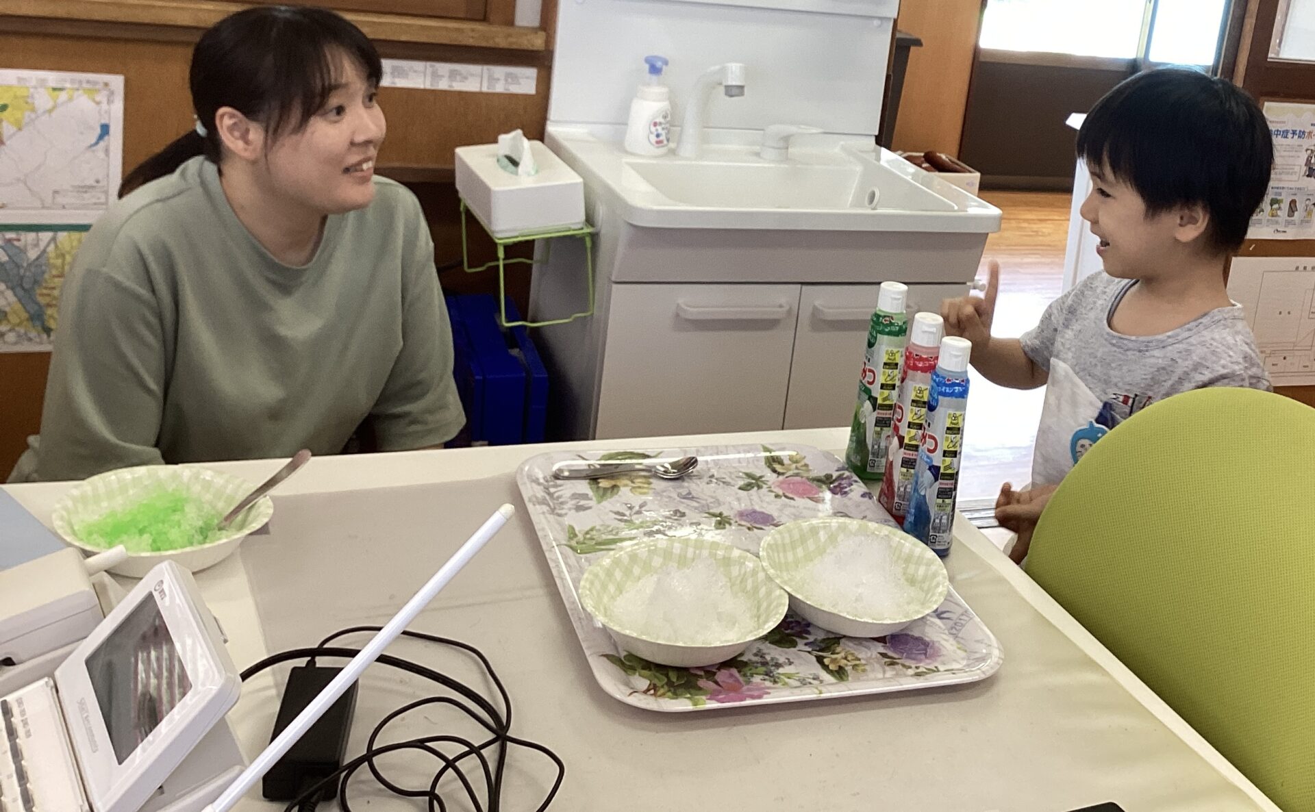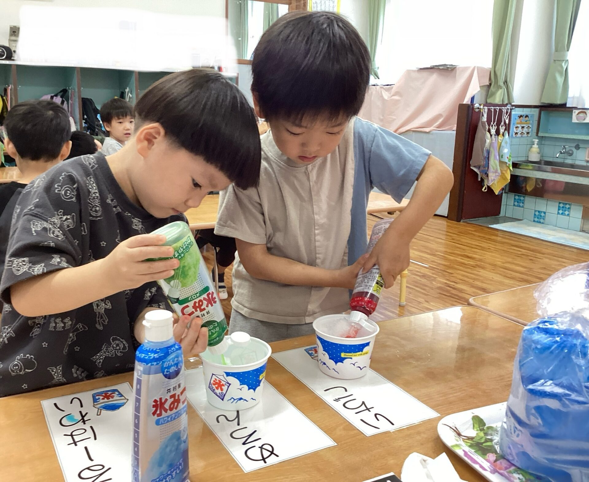 「かきごおり、いかがですか?」「メロン、いちご、ブルーハワイ、あります。なんにしますか?」とやりとりしながらかき氷にシロップをかけて手渡しています🍧✨