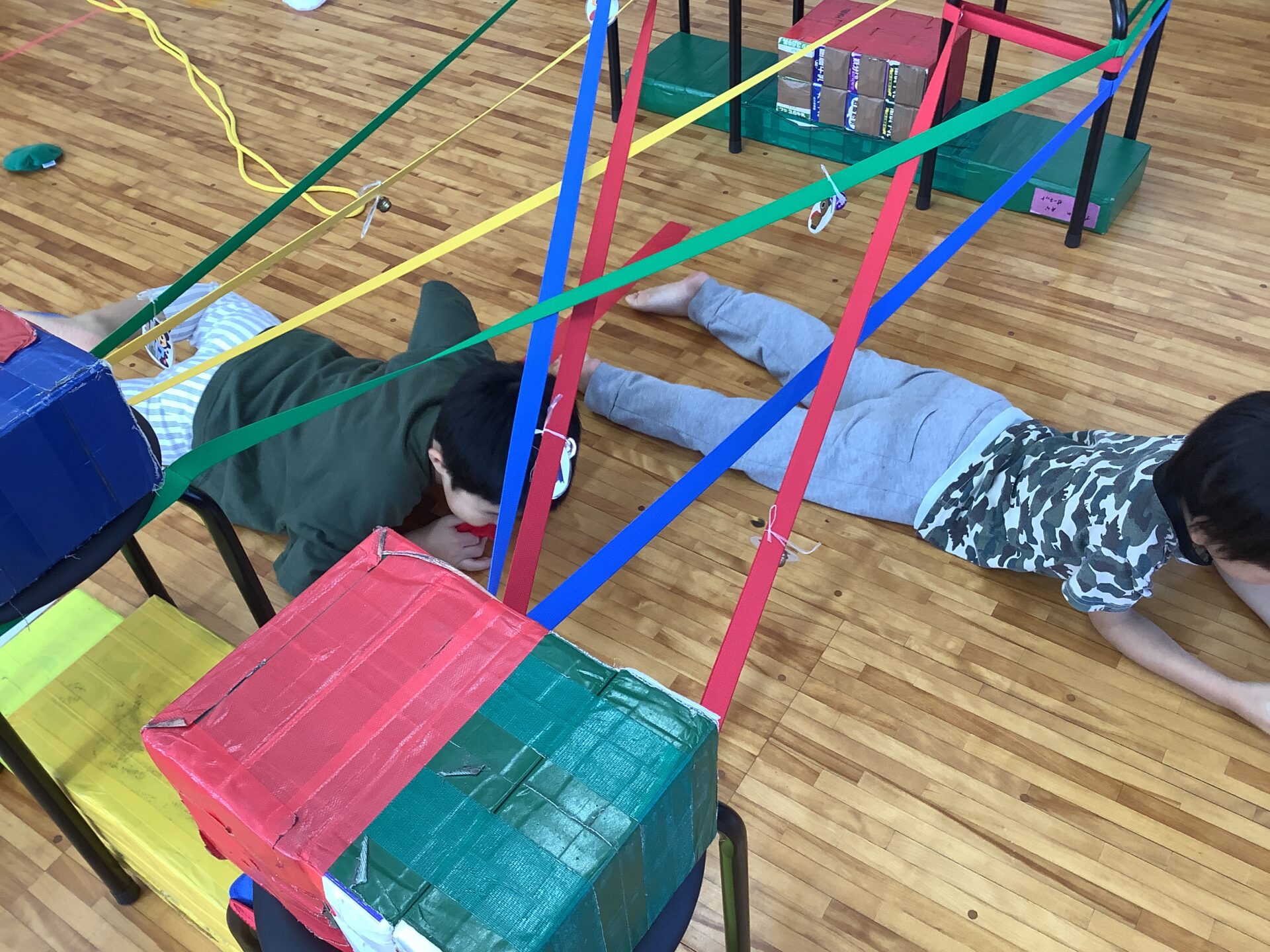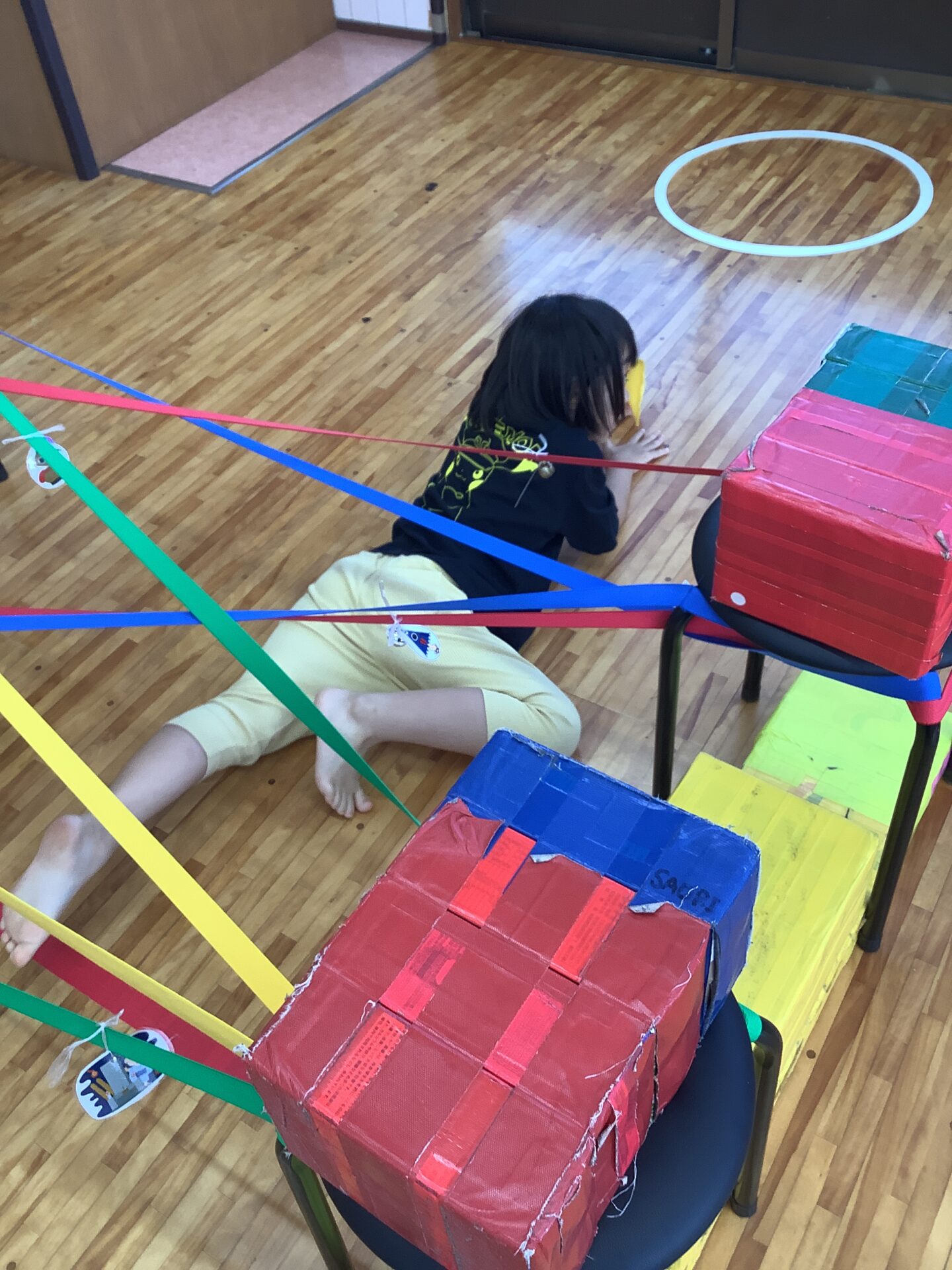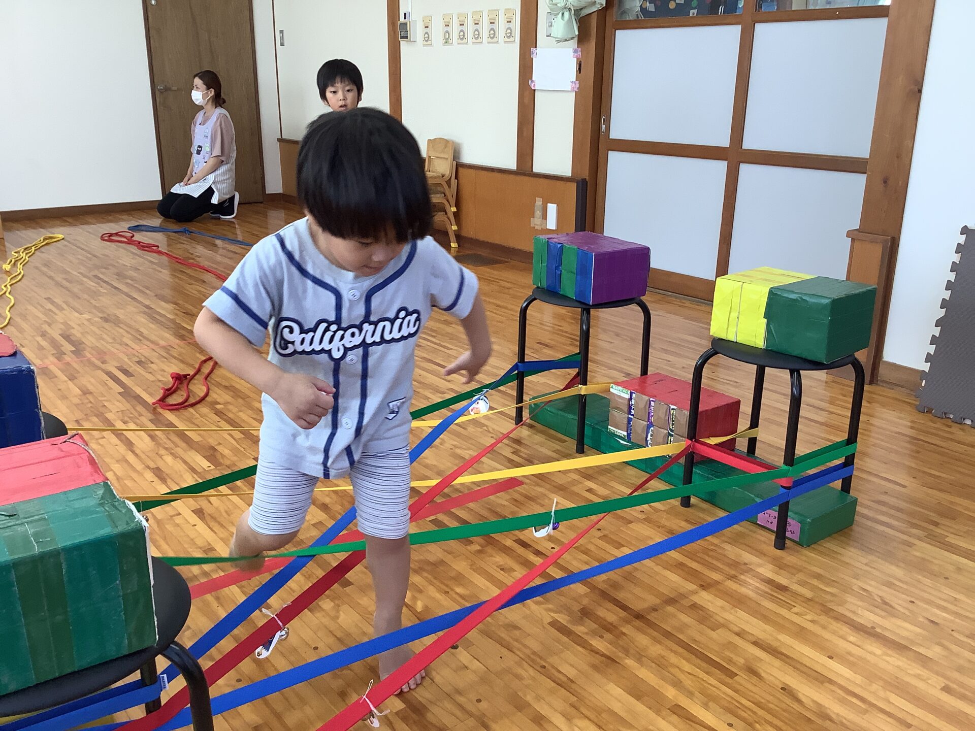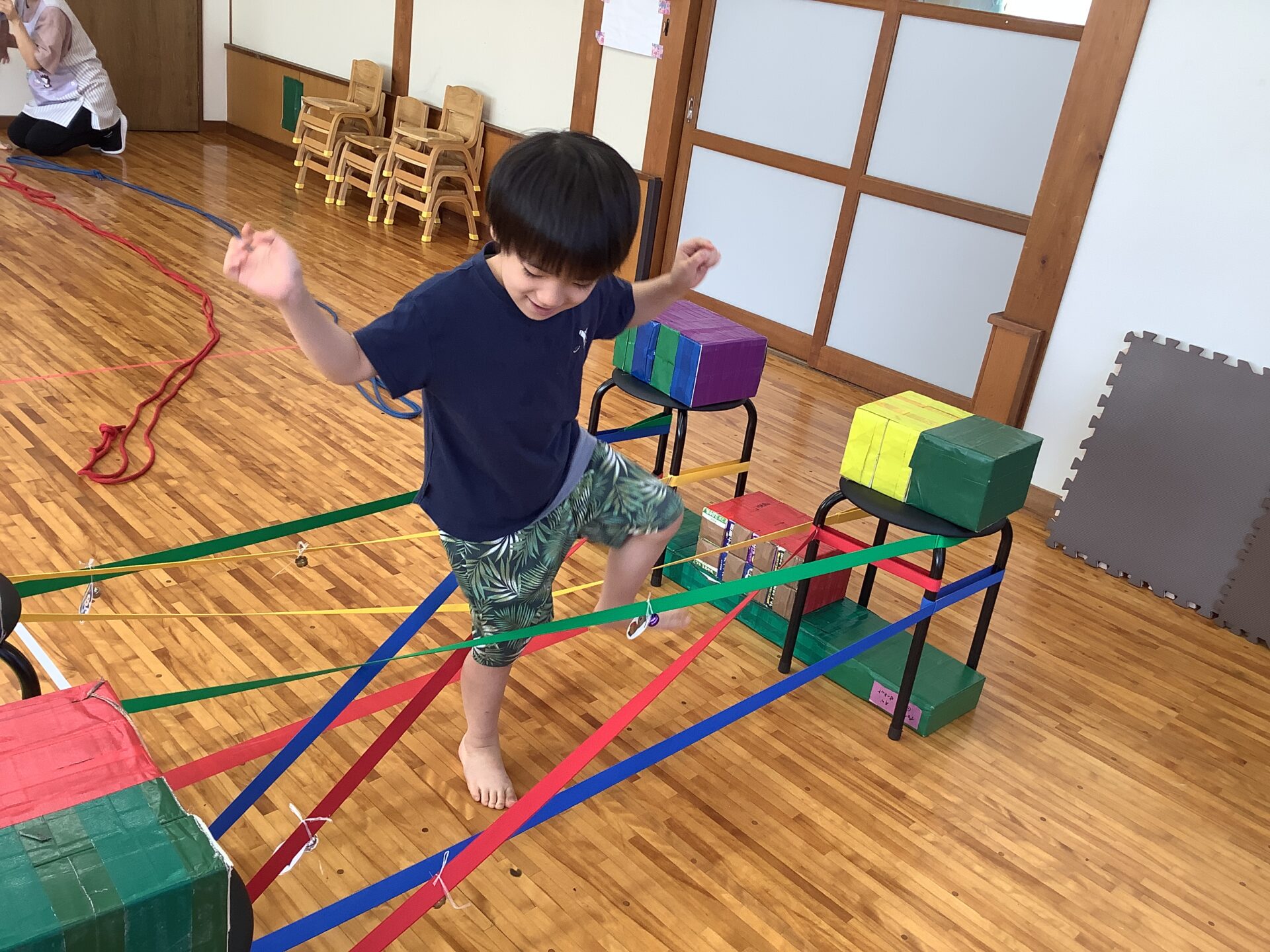ゴムまたぎやゴムくぐりもしていて、「おばけにバレないようにだよ」と声をかけると鈴が鳴らないよう意識して取り組む様子が見られています。まるで忍者のようでした🥷