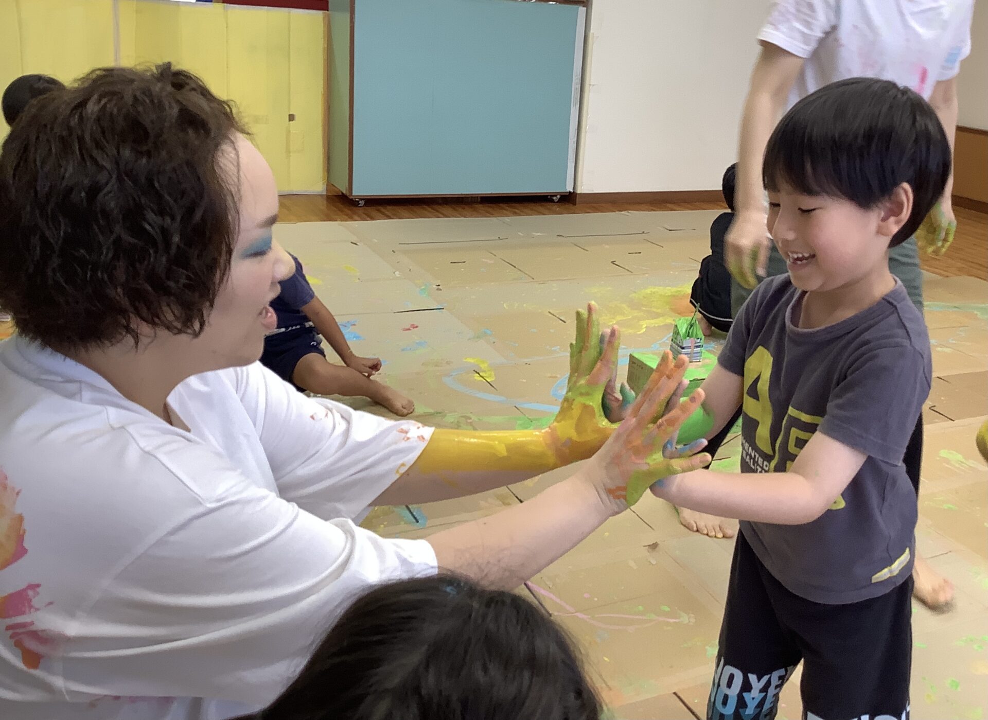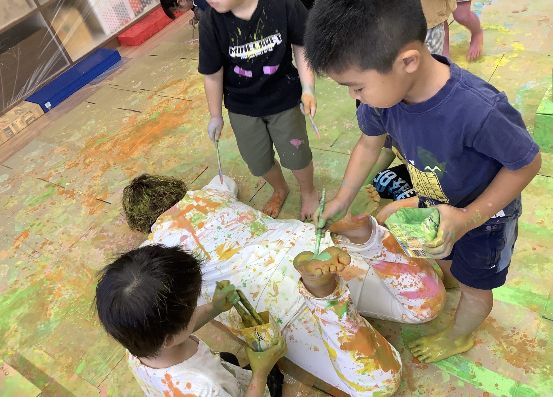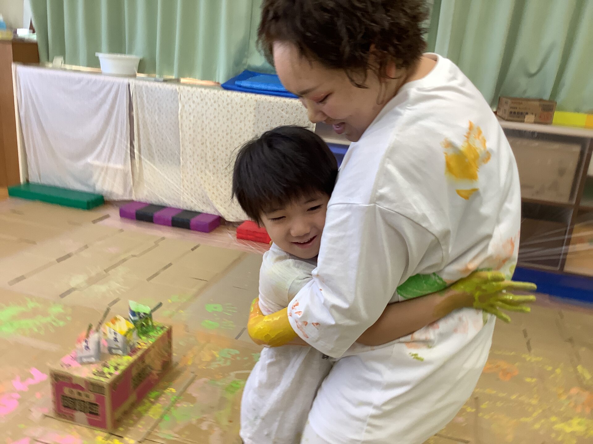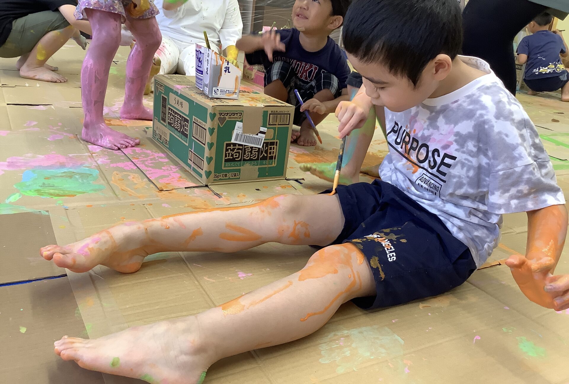 大きな段ボールのキャンバスに絵を描いたり、体に絵の具をつけたりしてダイナミックに遊びました🎨