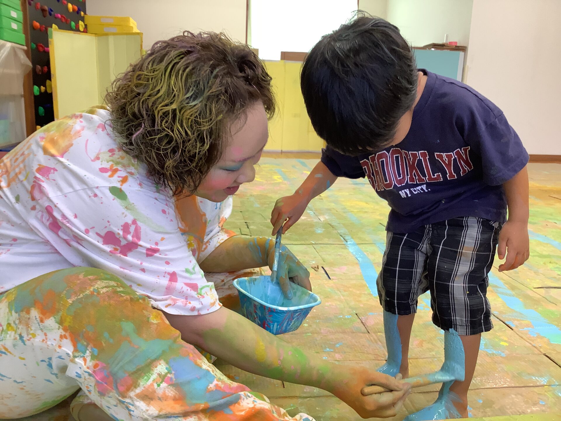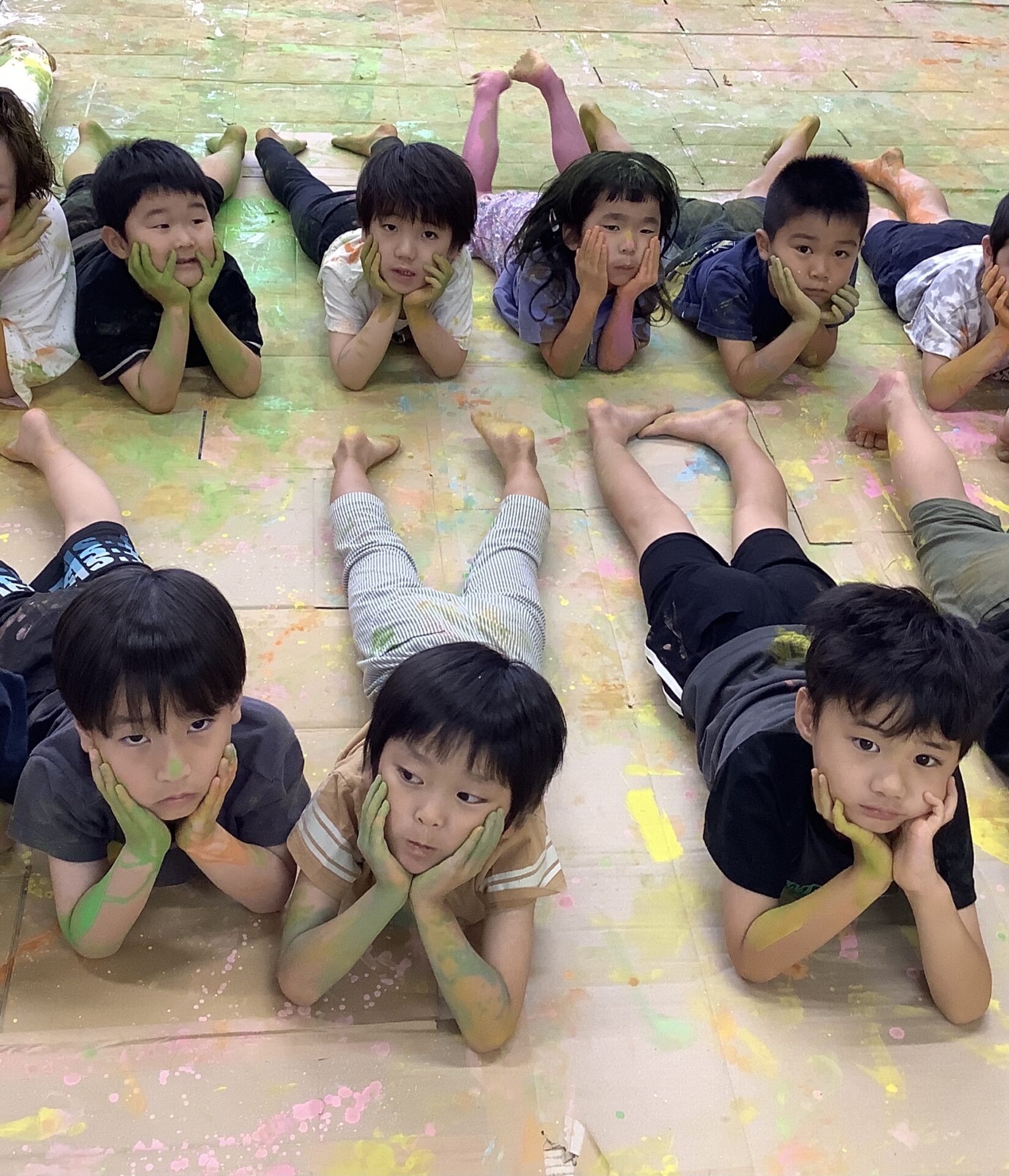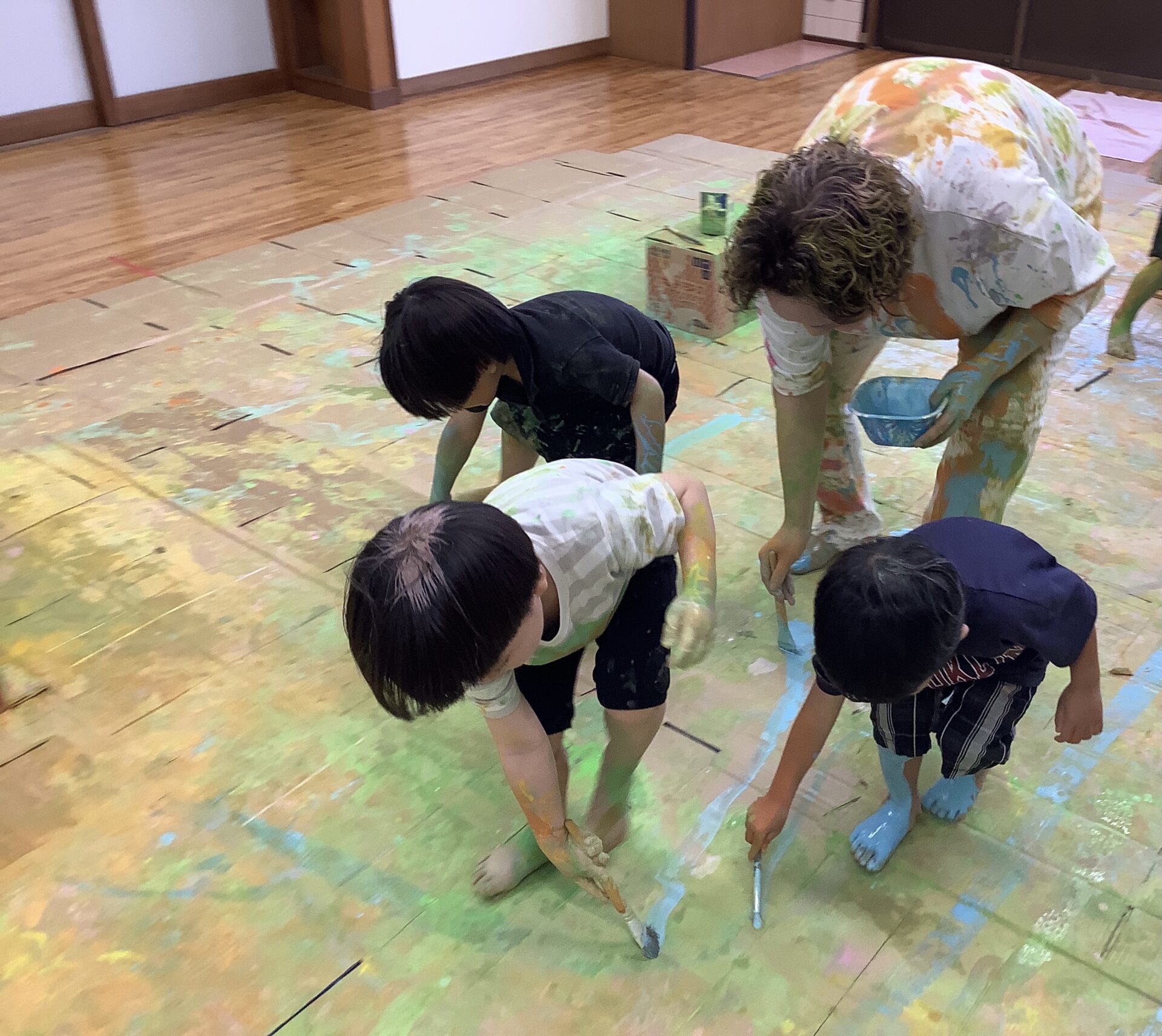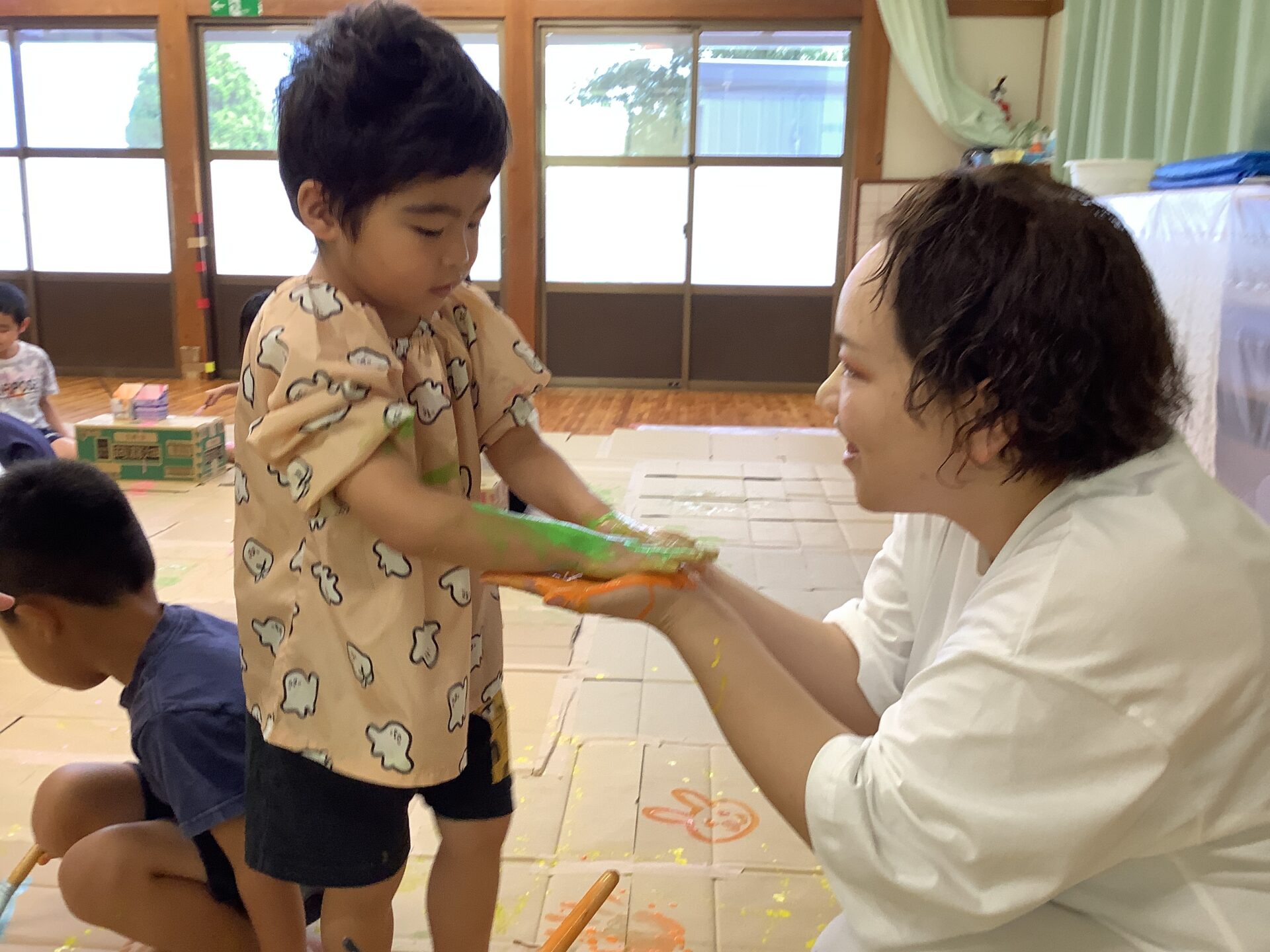 大きな段ボールのキャンバスに絵を描いたり、体に絵の具をつけたりしてダイナミックに遊びました🎨