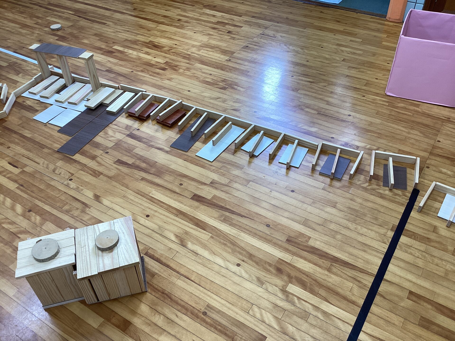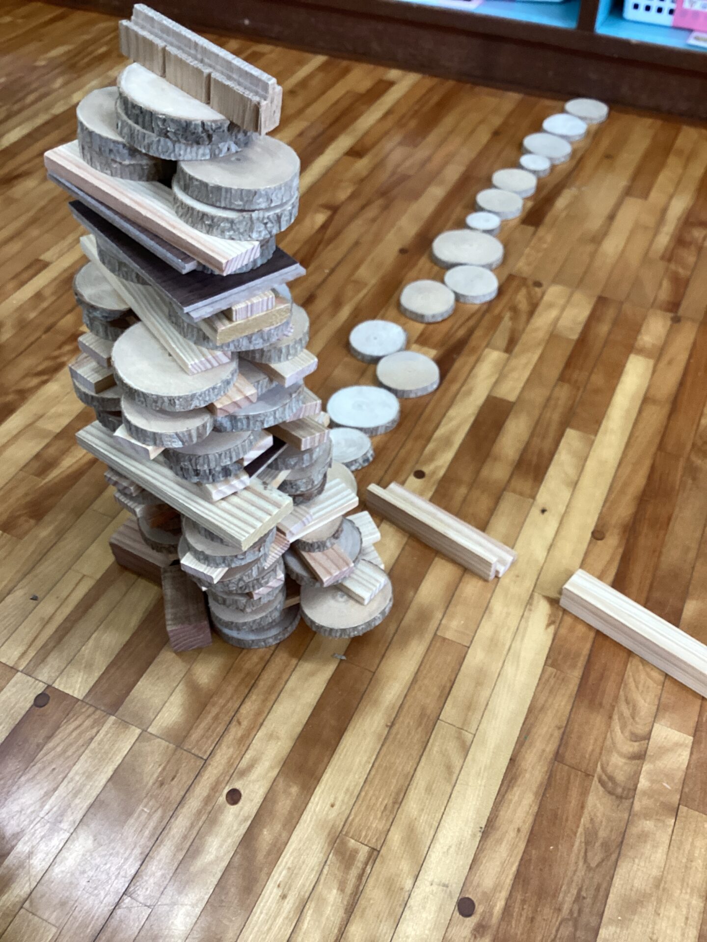 カプラの積み木やかまぼこいた、枝を輪切りにしたものや木の端材を用いて遊んでみました🌲