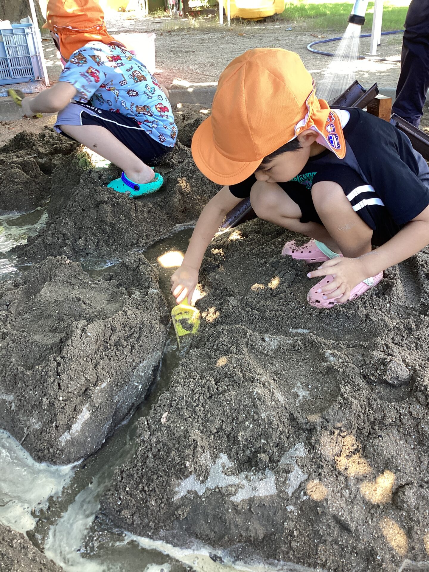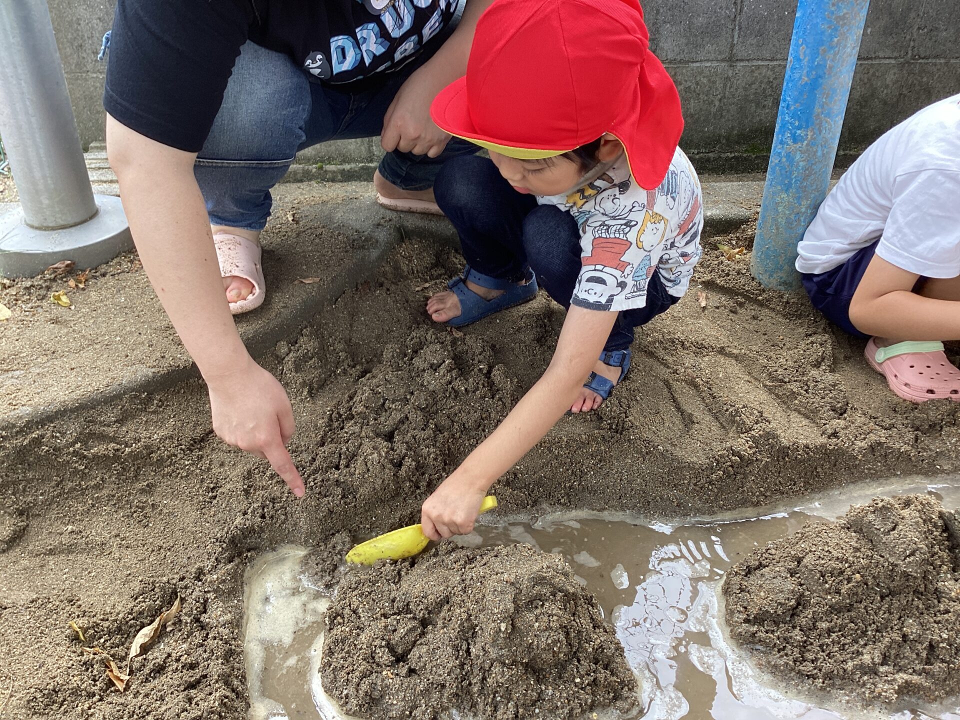 流れないのを見て、「どうしたらいいのかな?」の声掛けに対して、「おりる(流れる為に掘る)」とういう返答が増え、自分から掘り進めることが増えていきました。