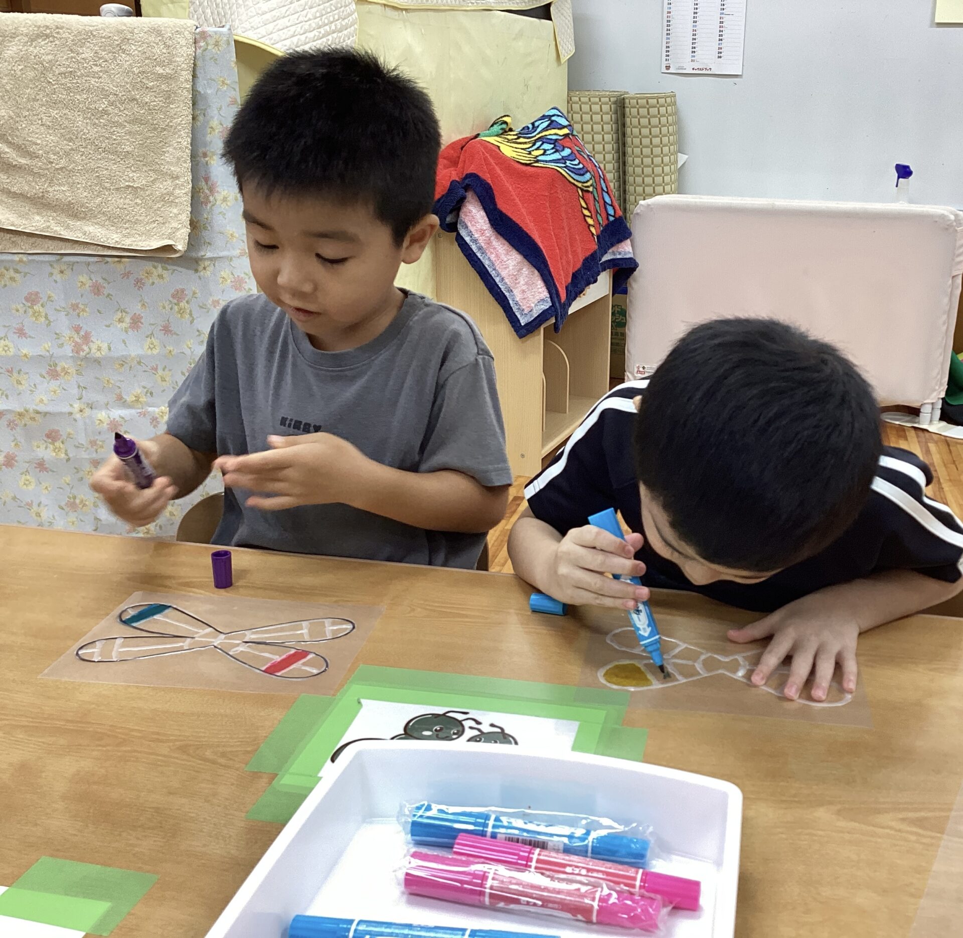 トンボは、クリアファイルにボンドで縁取りした線の中を油性ペンで色塗りして作りました。