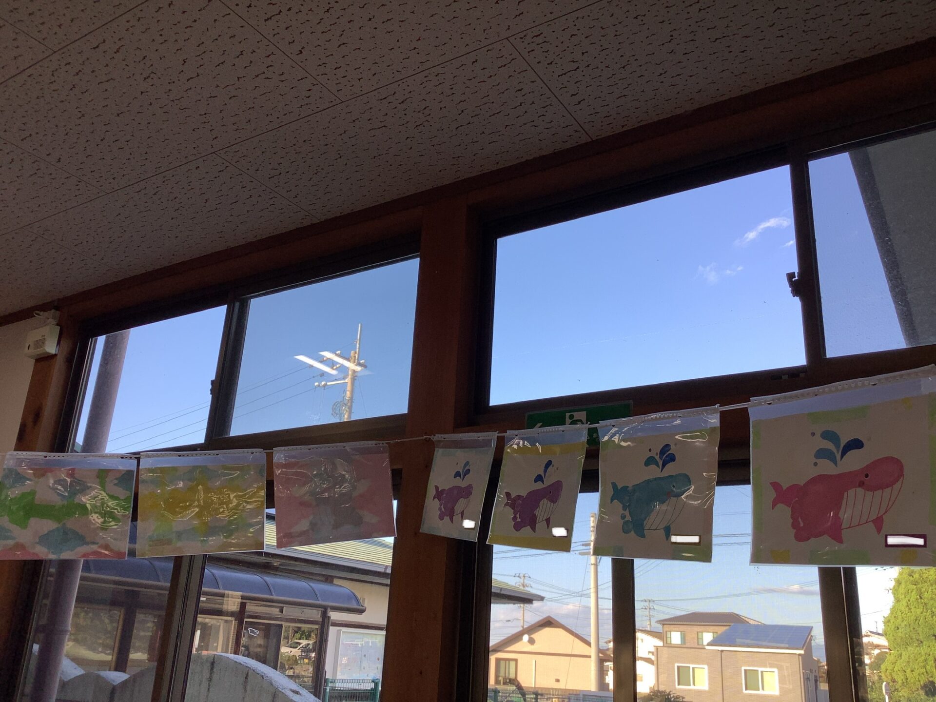 入場門は、年少児・年中児が上に飾るくじらに手で色を塗りました🟦