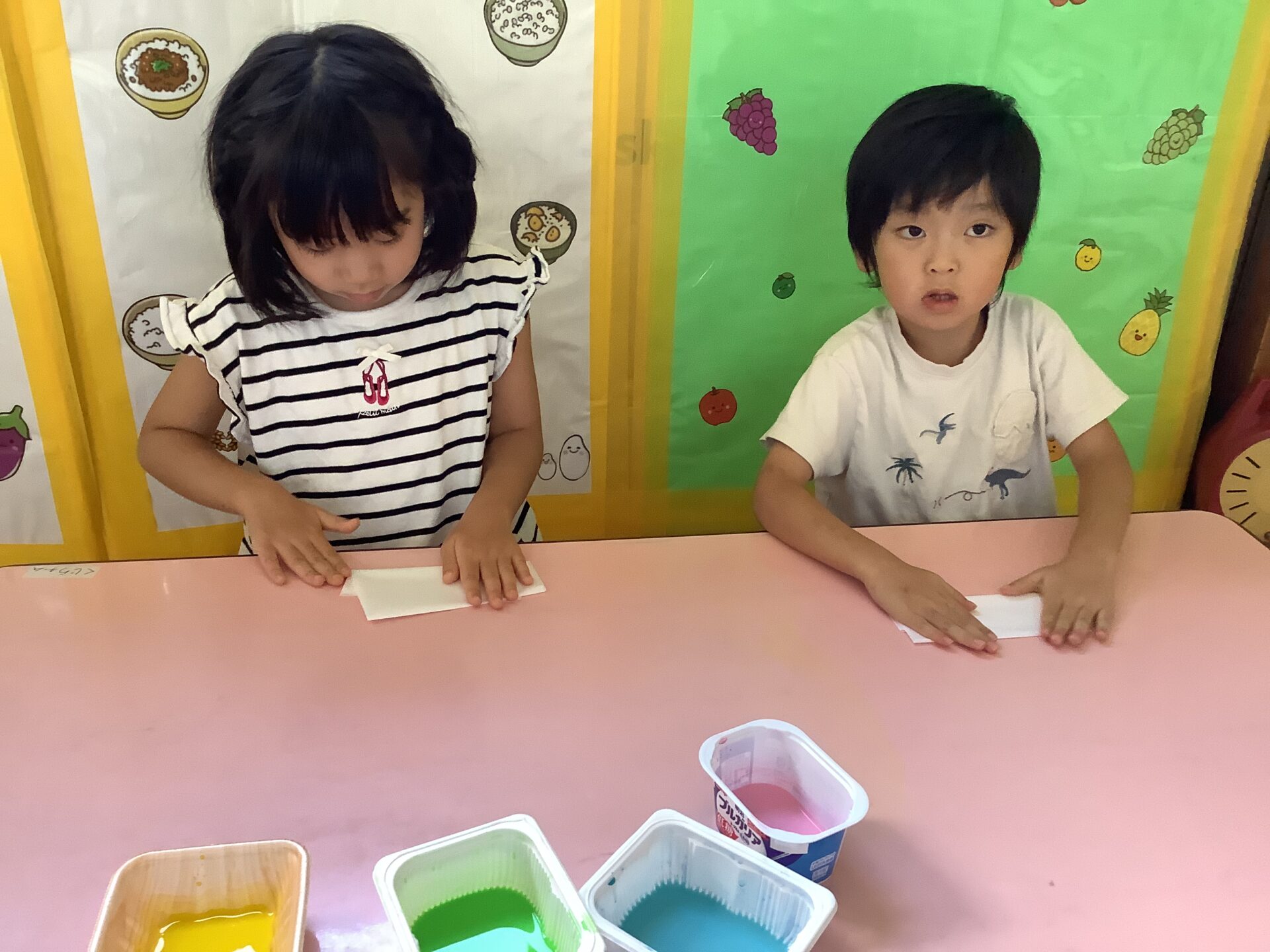絵の具をつける時、「ひゃっ、つめたーい」「くすぐったい」と思わず足を引っ込めてしまう姿も…