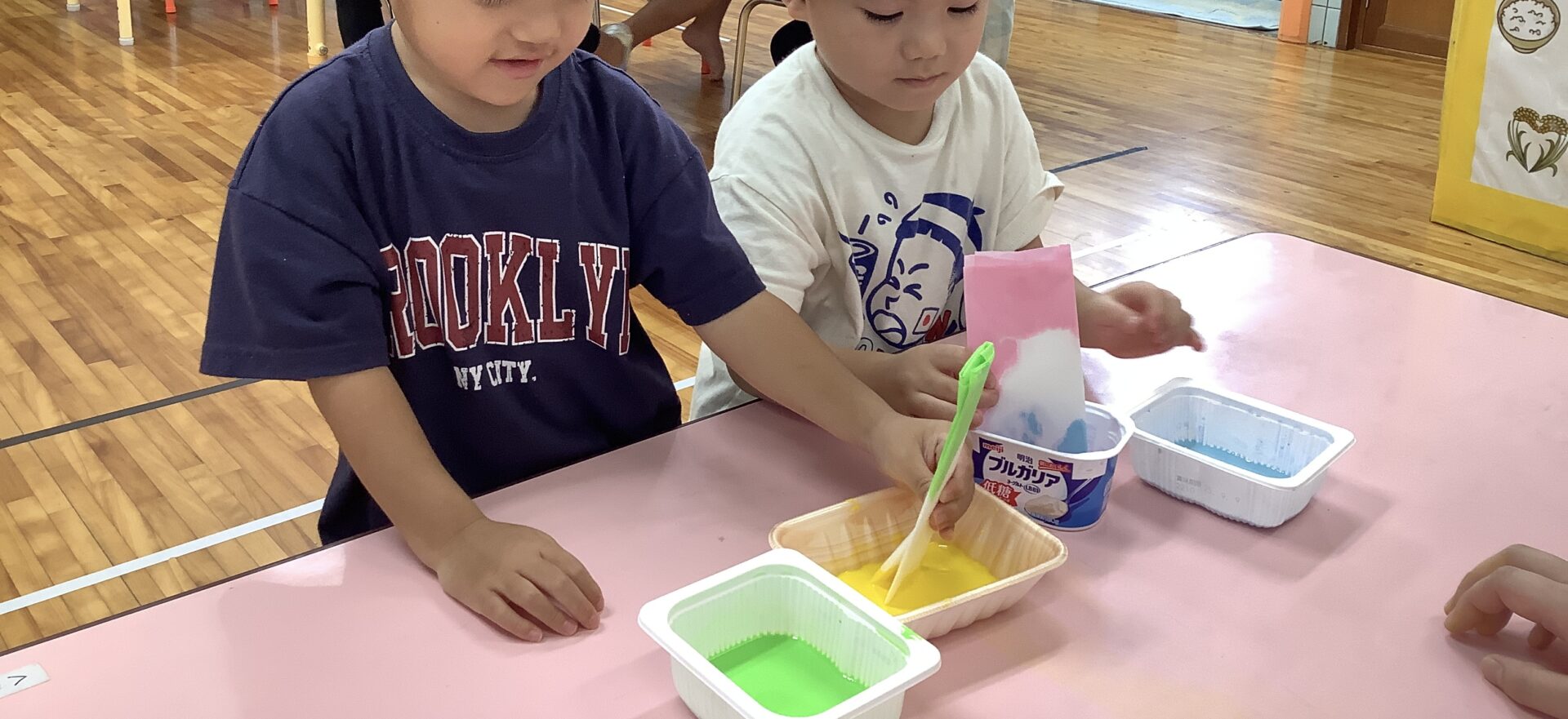 片面は、障子紙に折り目をつけてにじみ絵をしました。