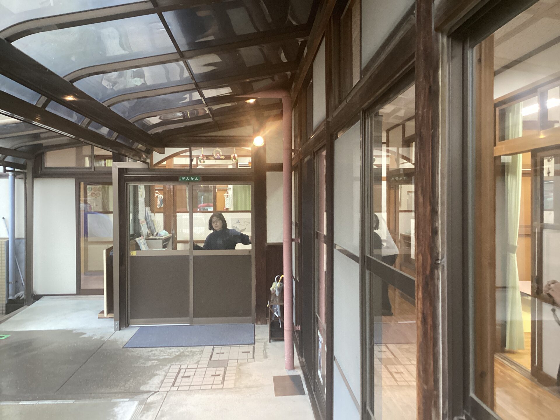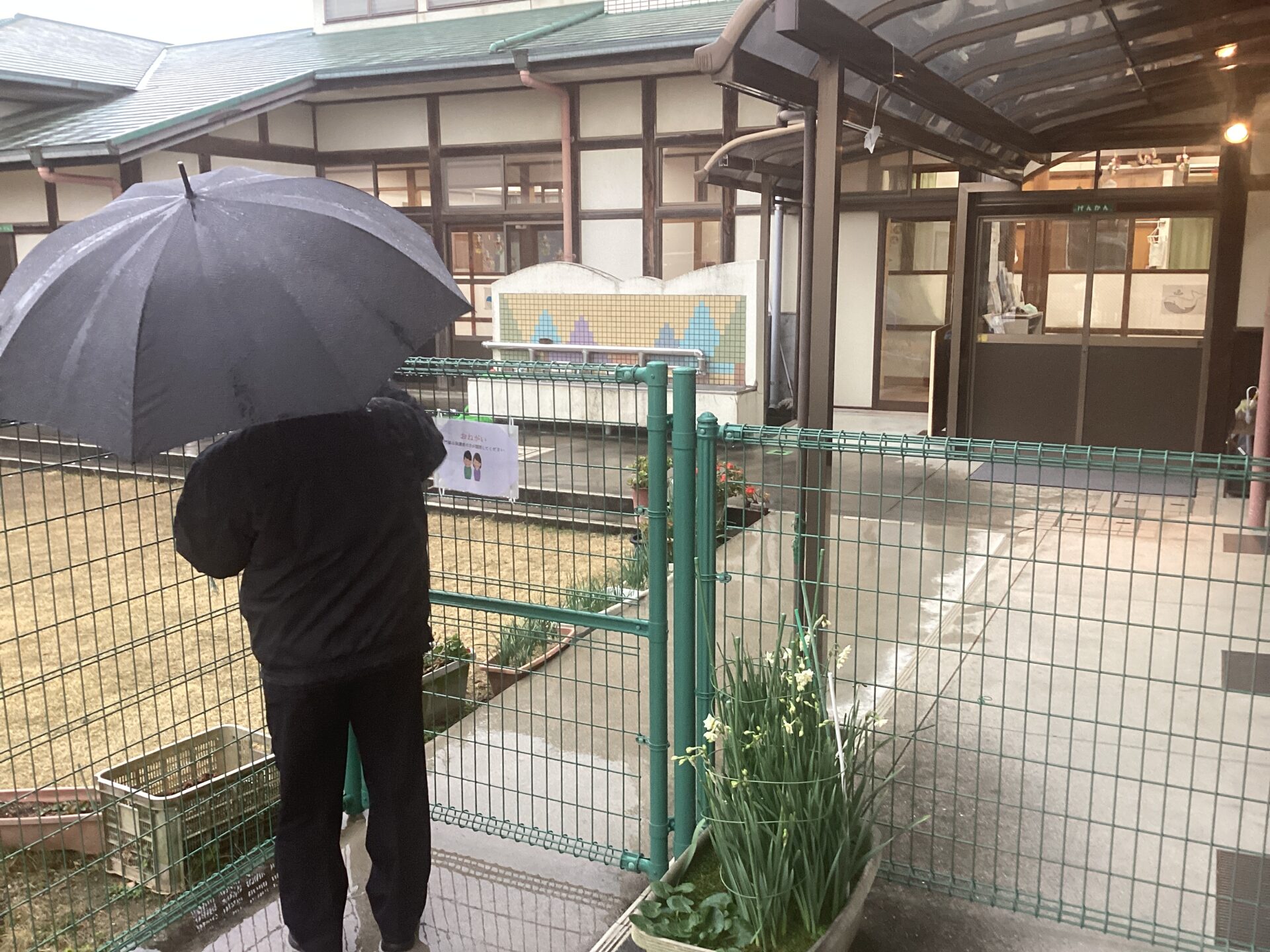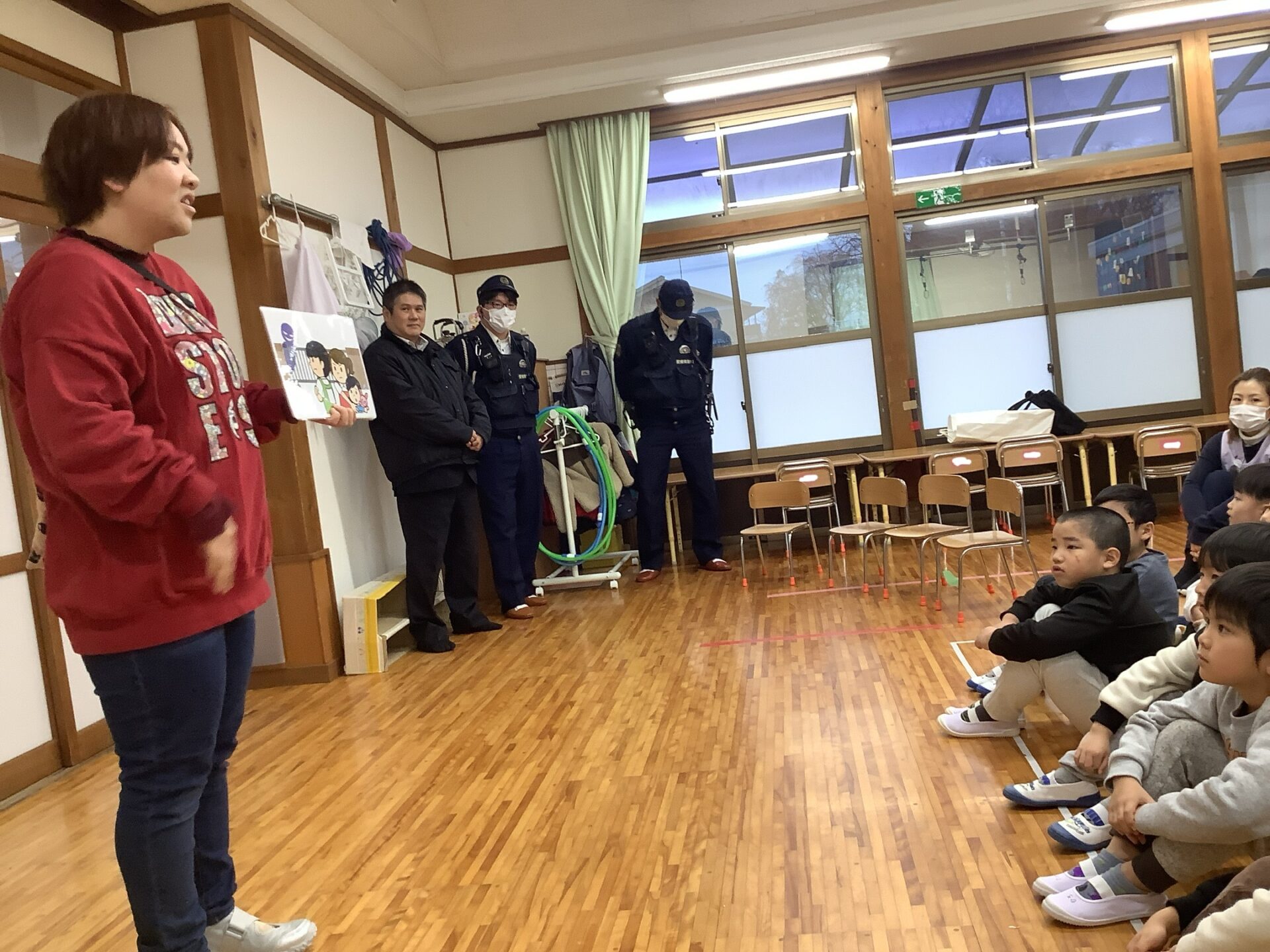 伊予警察署の方に不審者役をしていただいて、訓練をしました。合言葉を聞いたら、施錠をしたり子どもたちと安全に避難したりしています。