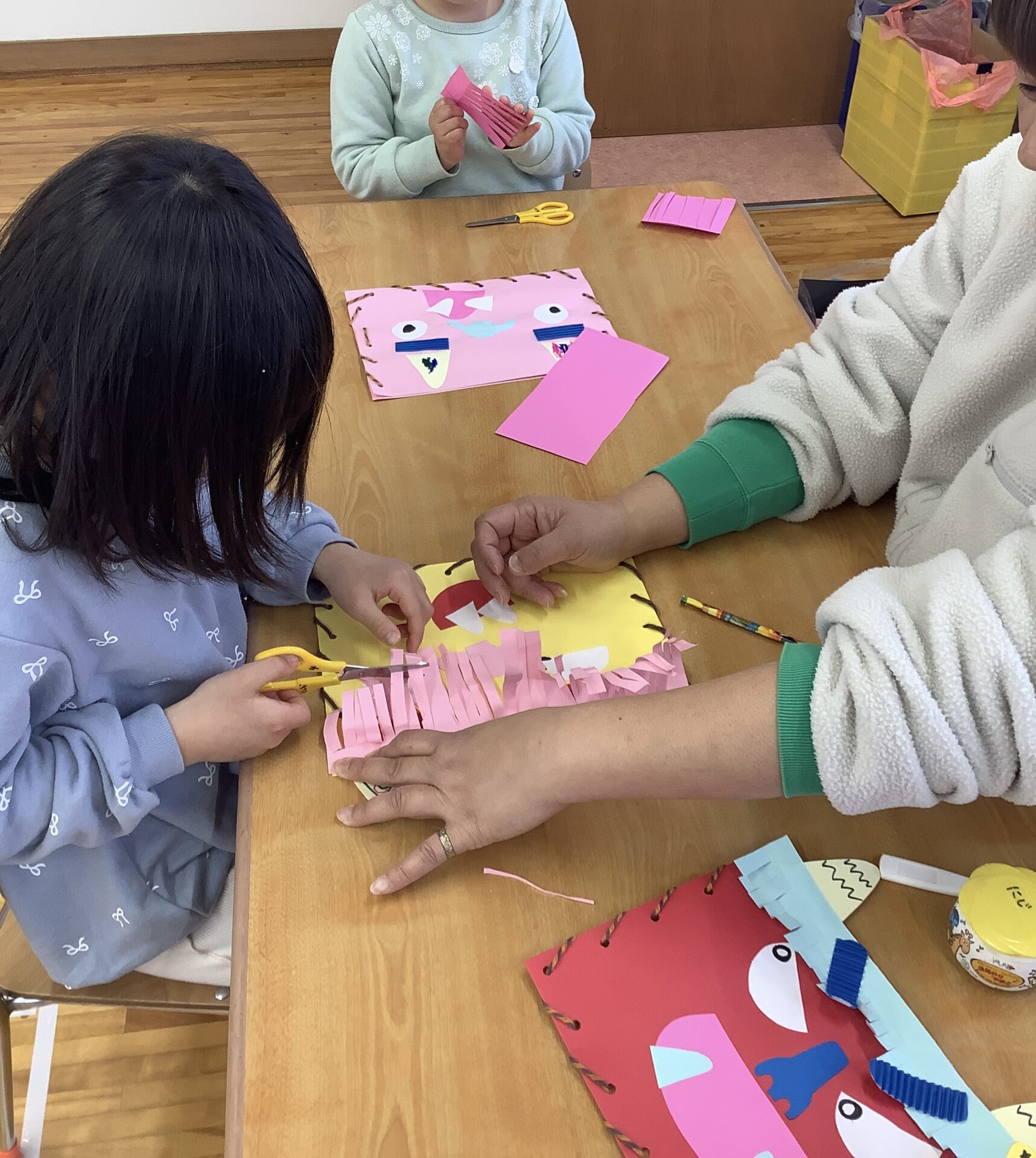「鬼の顔には、みんなと同じでなにがあるのかな?」と子どもたちに問いかけてつくって見ることに!子どもたちに問いかけると、「おおきなくちよ」「めはこわい!」などの声が聞かれていましたよ。