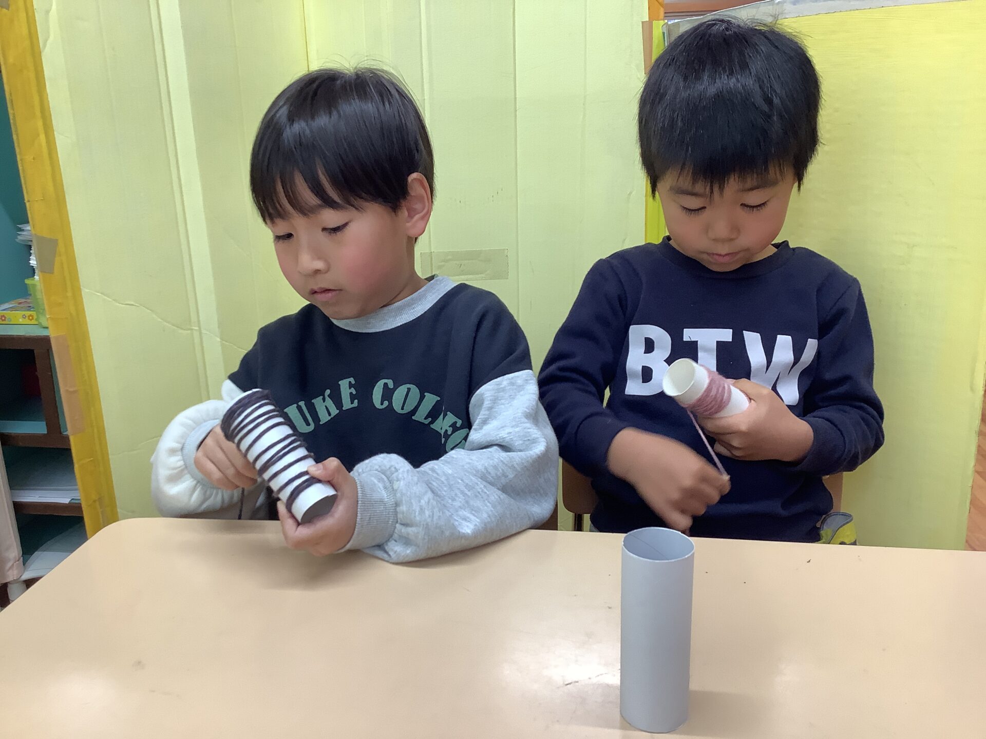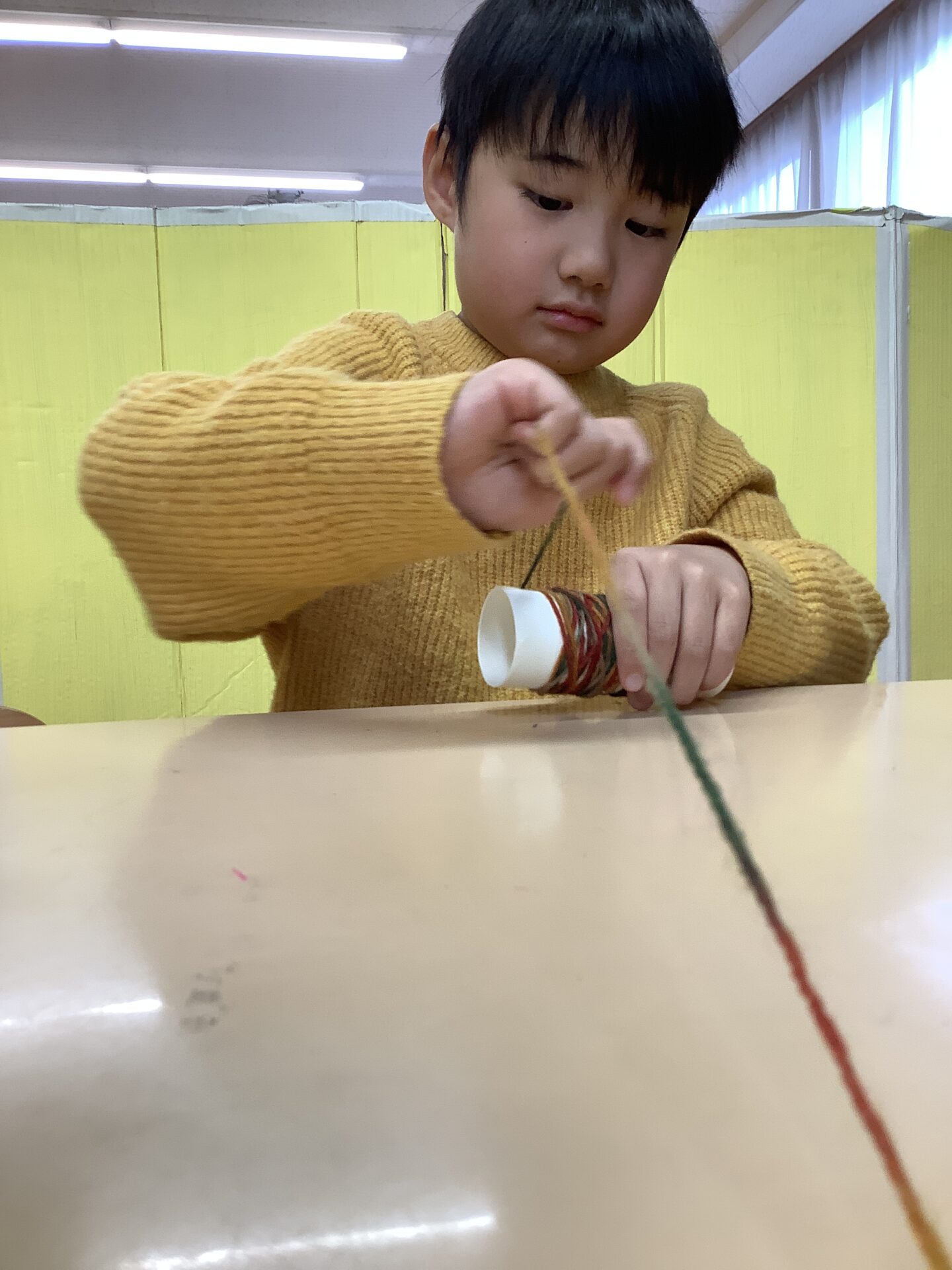 トイレットペーパーに毛糸を巻きつけること…大人にとっては何気ない動作も難しいようで「ん〜」「できない」と苦戦する様子も大人と一緒に確認して巻きつけて頑張りましたよ💪