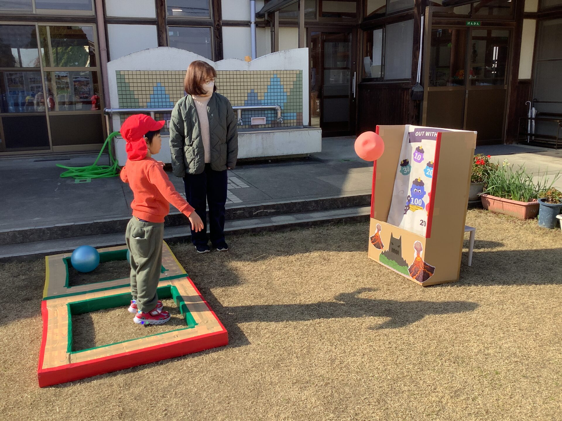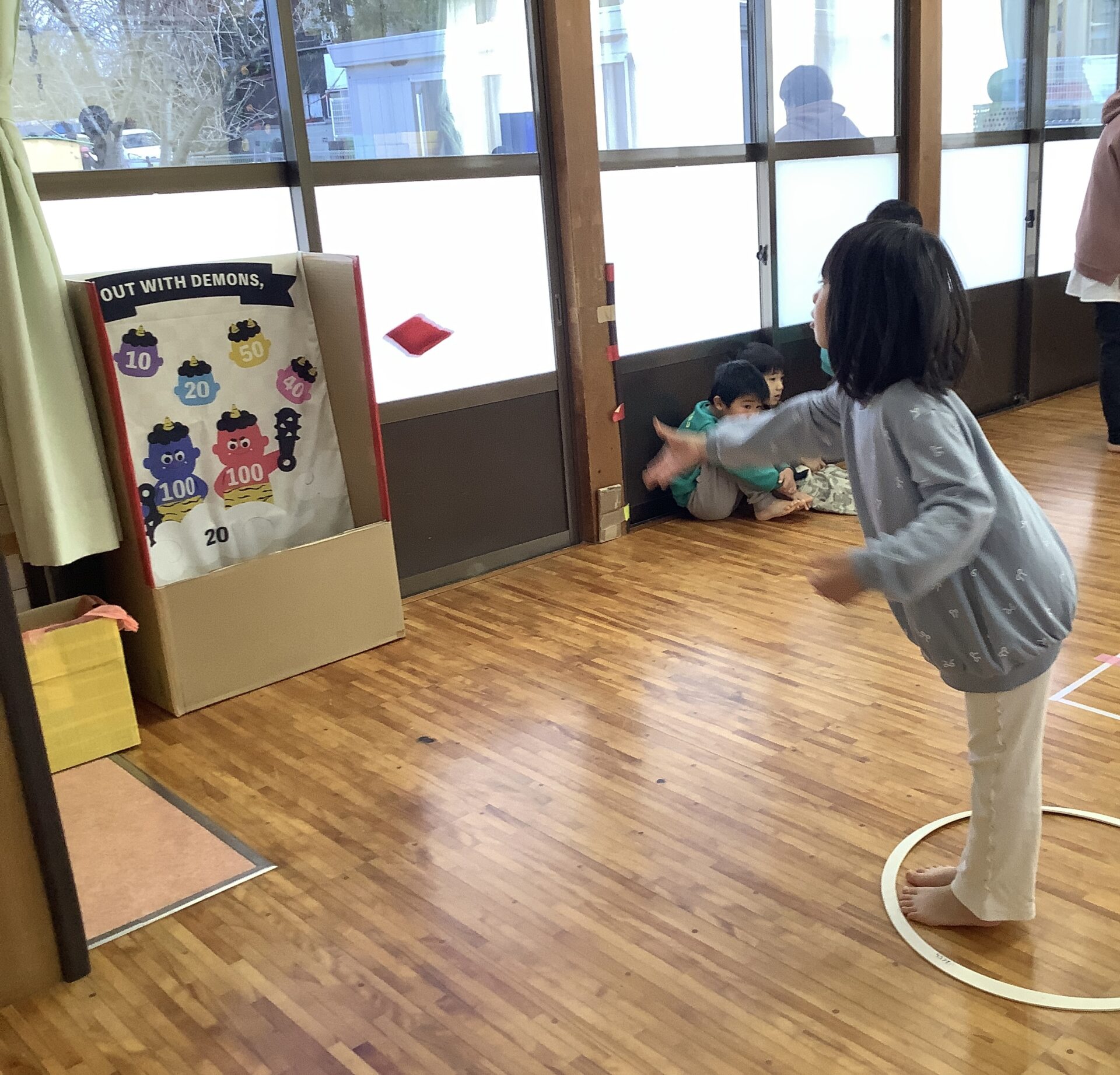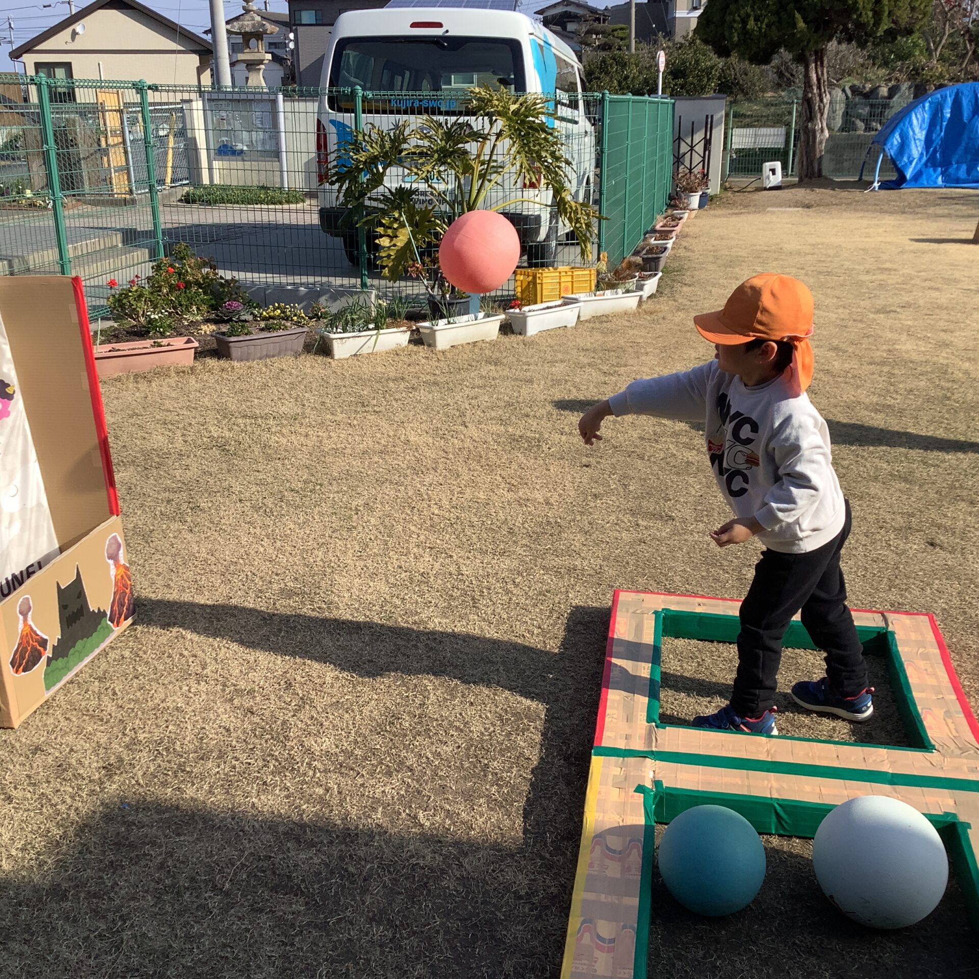 節分に向けて、豆を投げれるようになるといいなと思いサーキットの中に鬼に向けてビーンズバックを投げる要素を取り入れるようにしました!