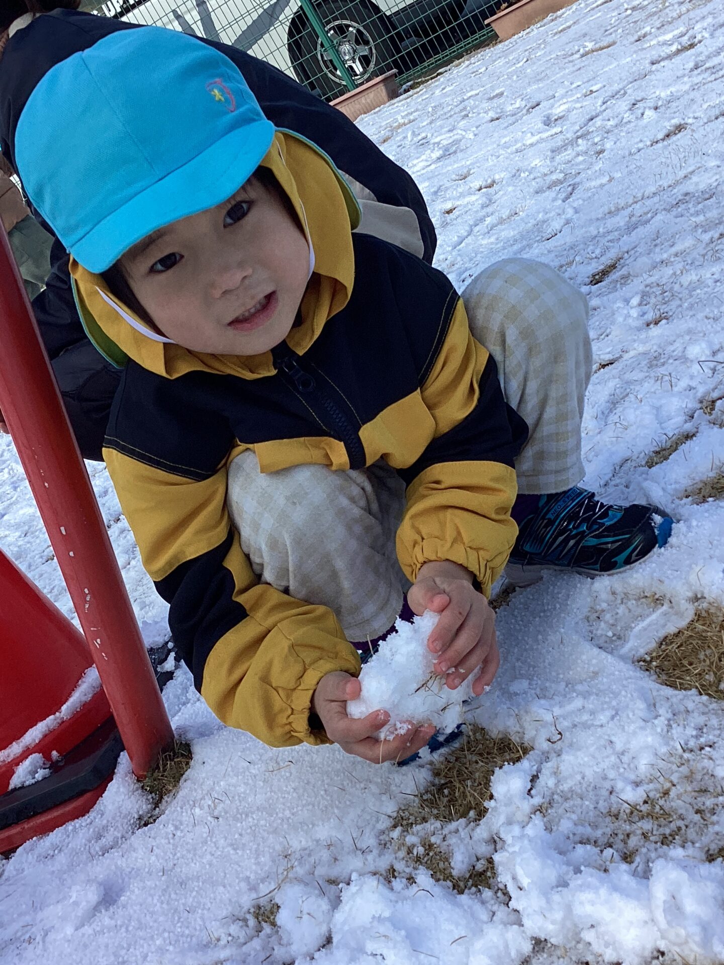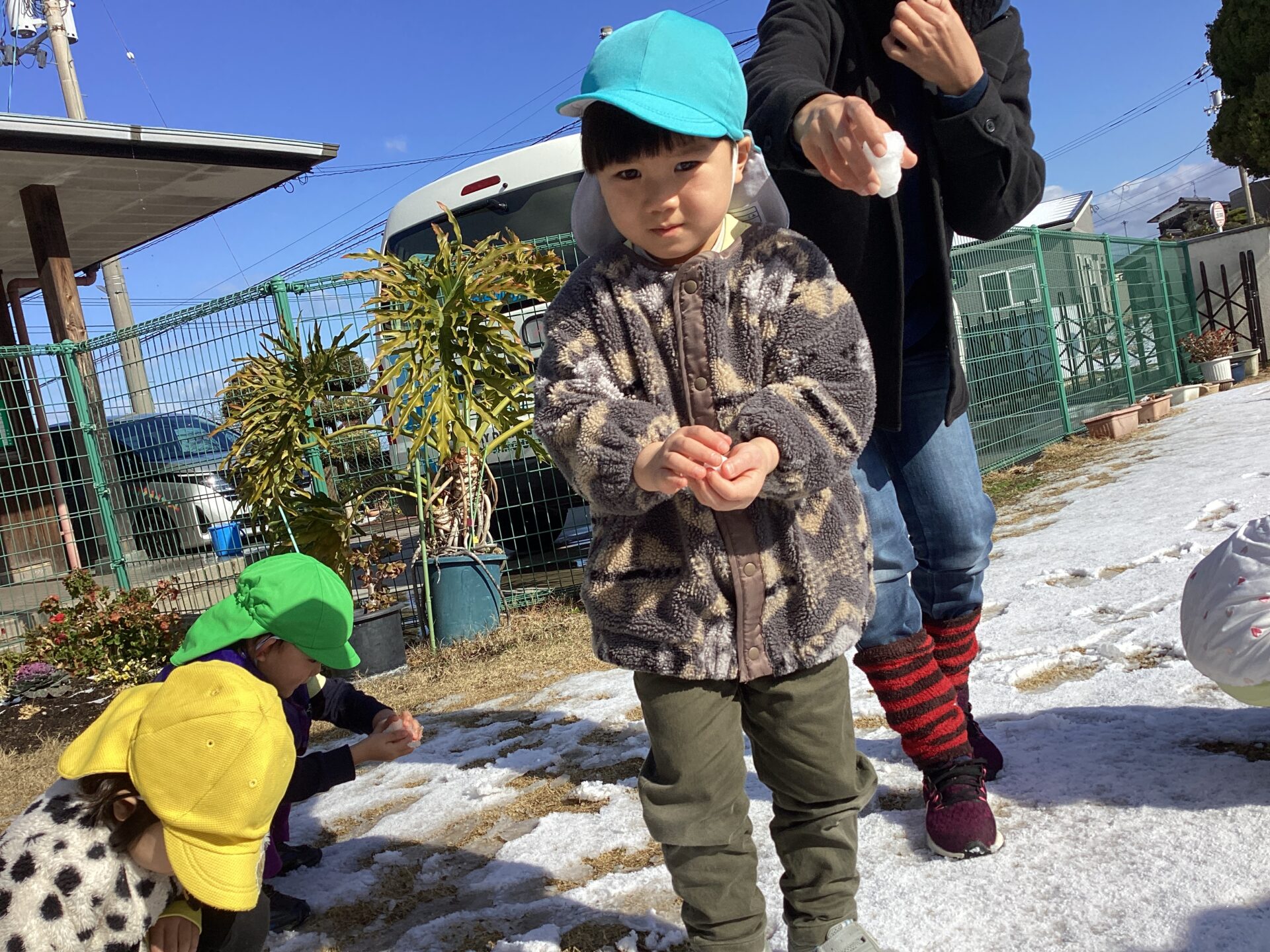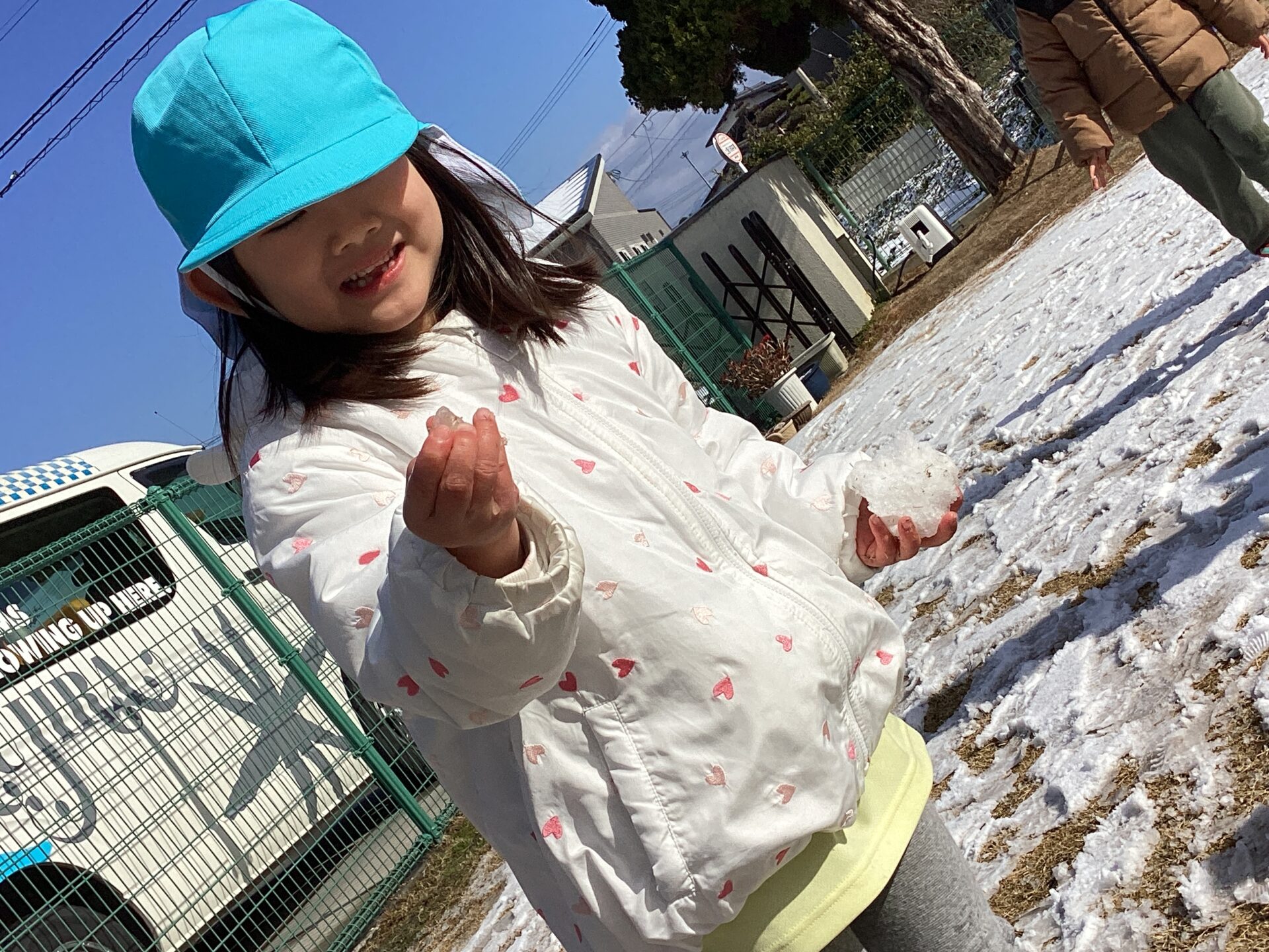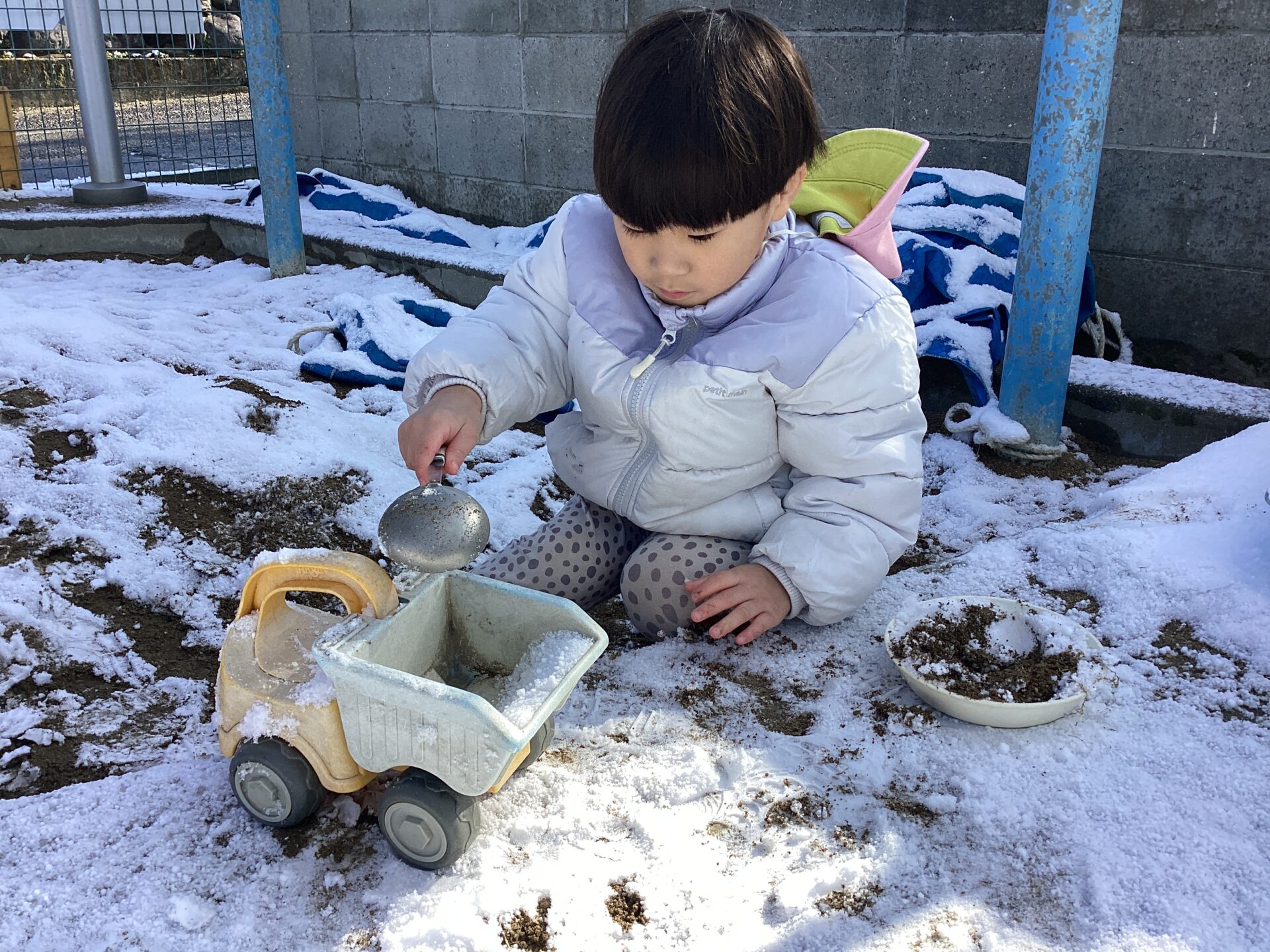 中には、いつもの砂遊びのように、トラックに雪を入れたり、砂と混ぜたりして遊ぶ子、