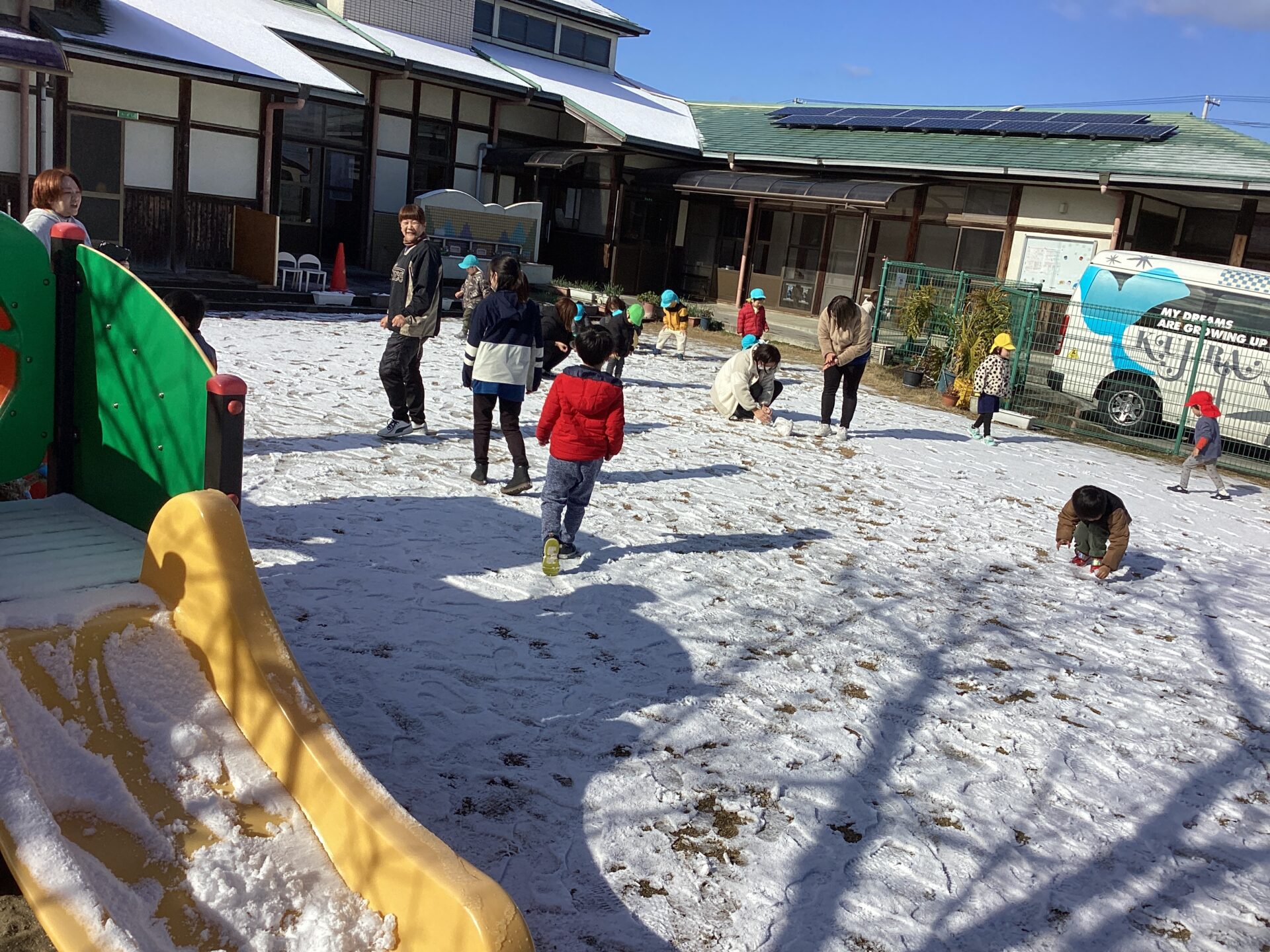 登園すると、昨晩の雪で、園庭が真っ白でした。