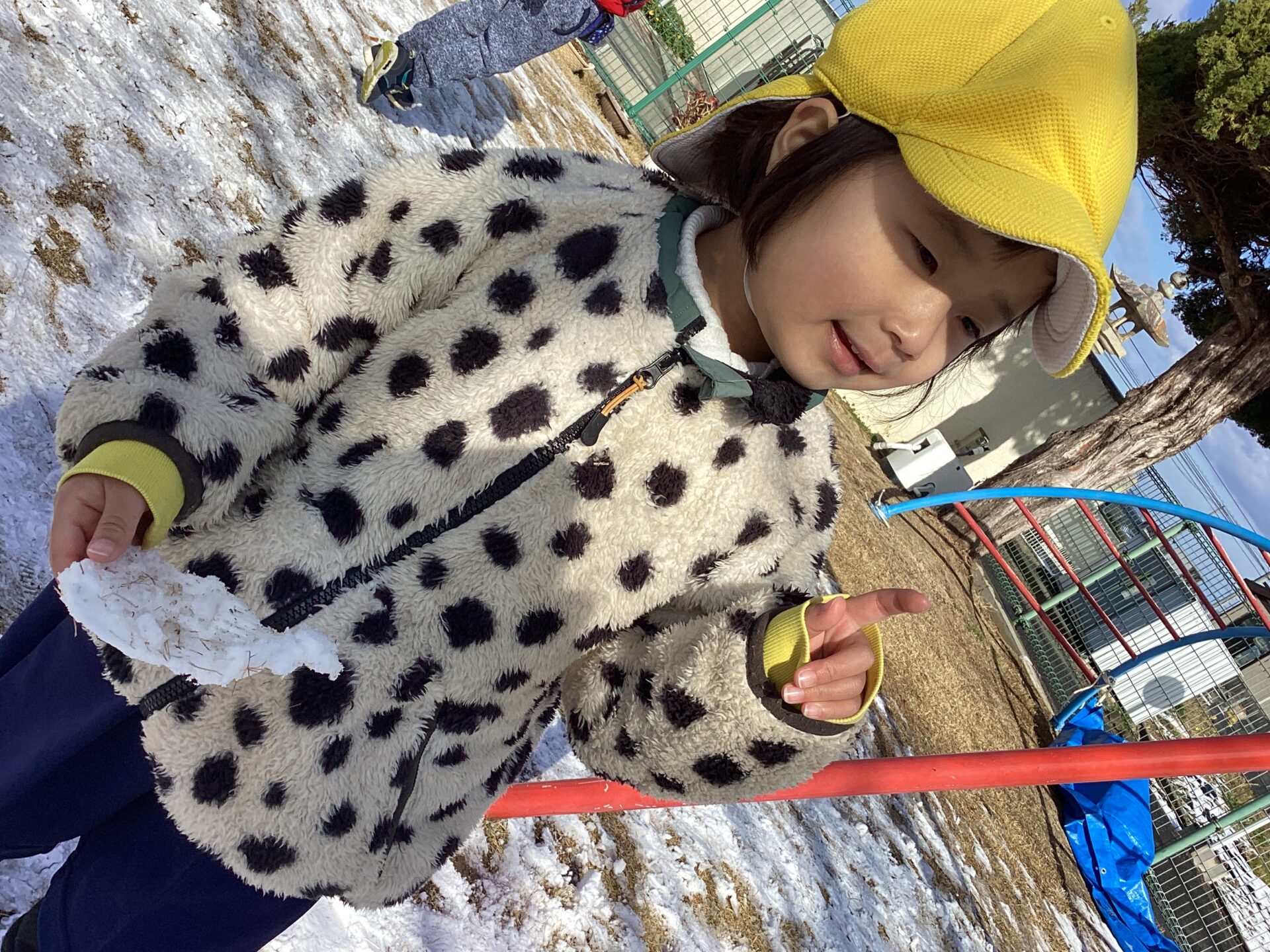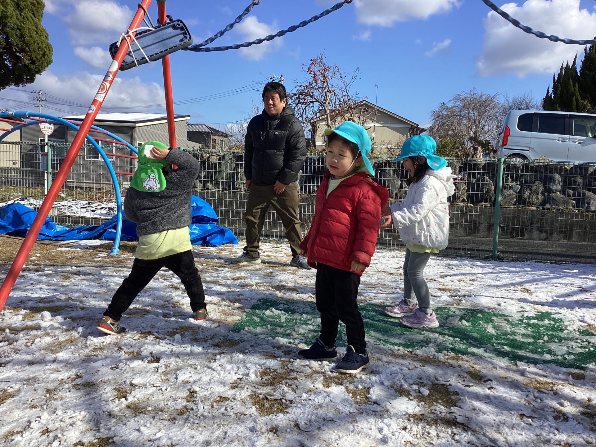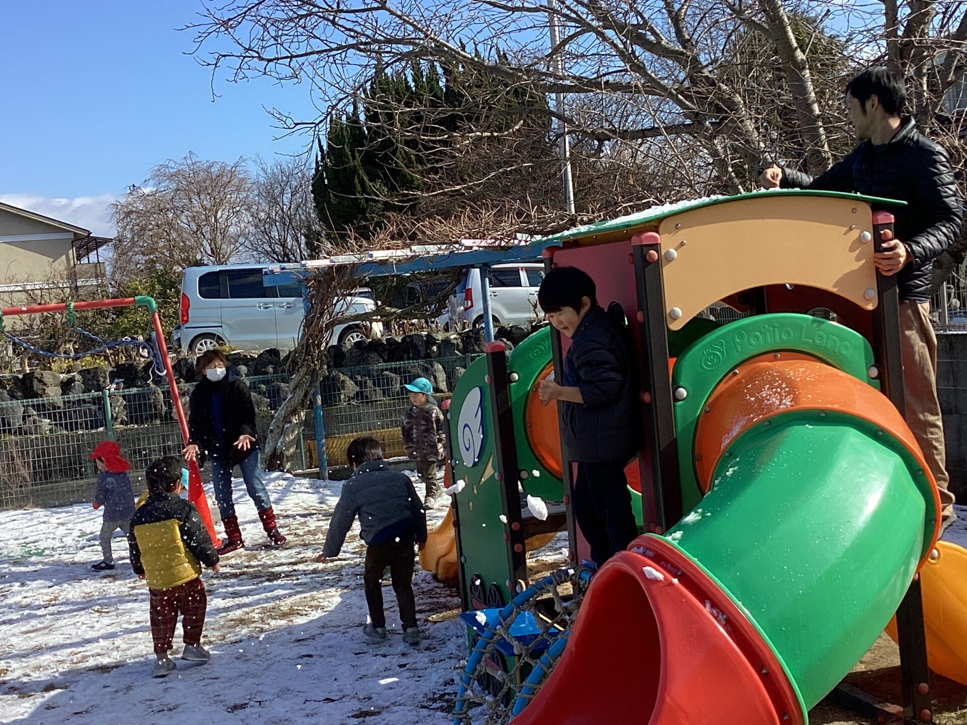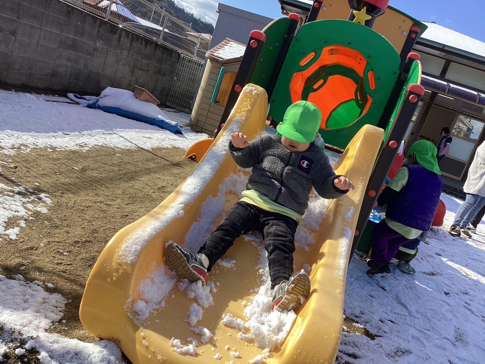 滑り台に雪があるのに、気にしないで滑っておしりが濡れちゃった子もいました。