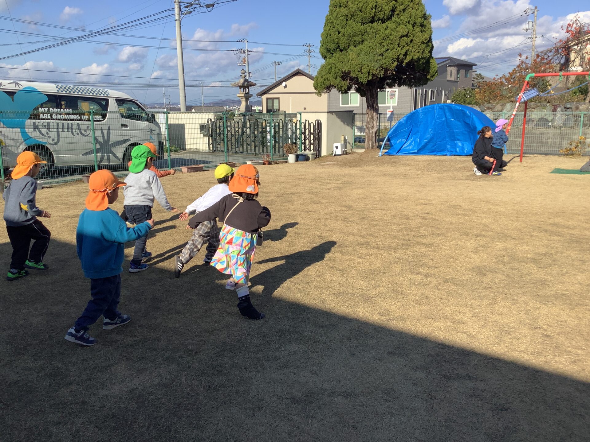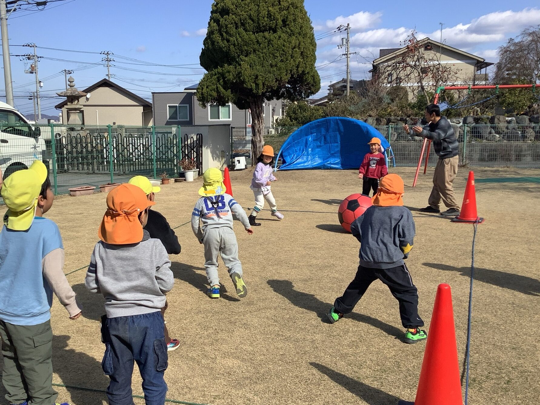 お外では、友だちと一緒に遊ぶことが楽しくなり始めて、コロコロドッチや追いかけっこなどが人気になっています!