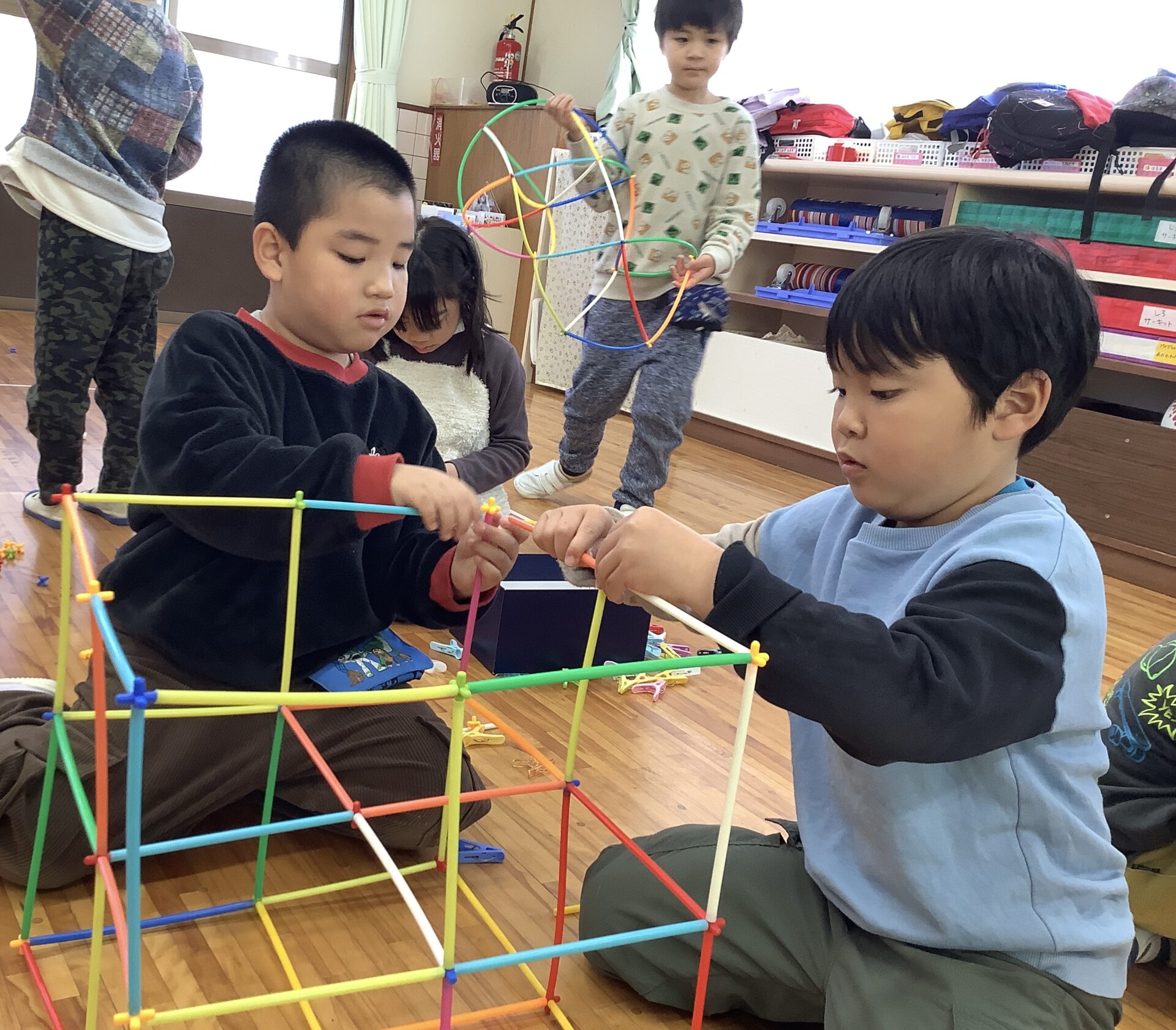 ストローを使った遊びも人気で、友だちと協力して遊んでいます🥤